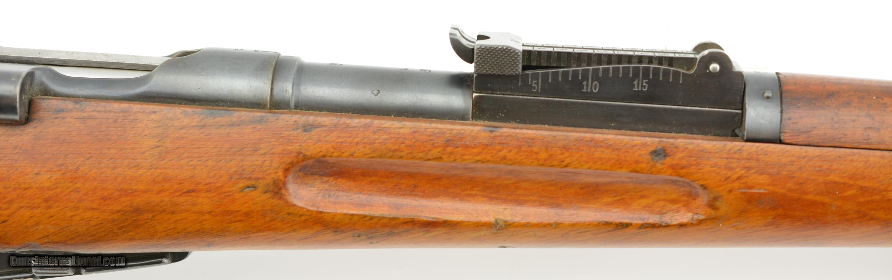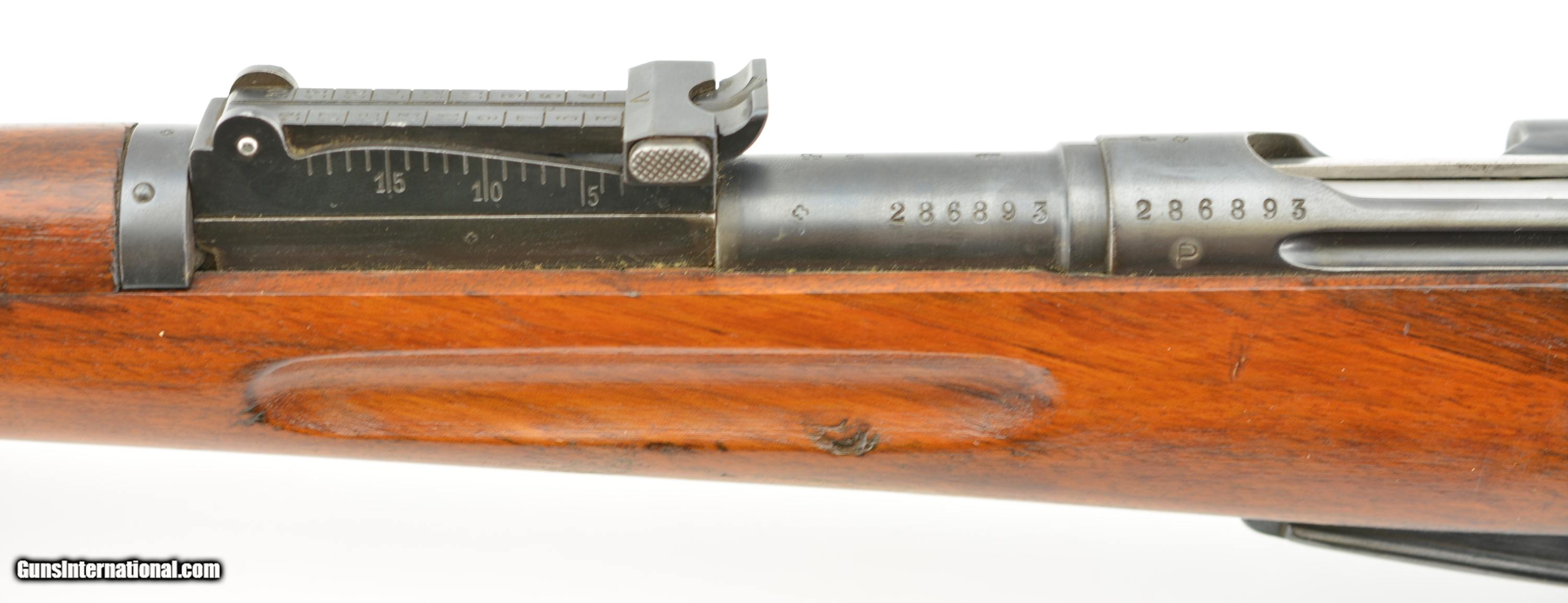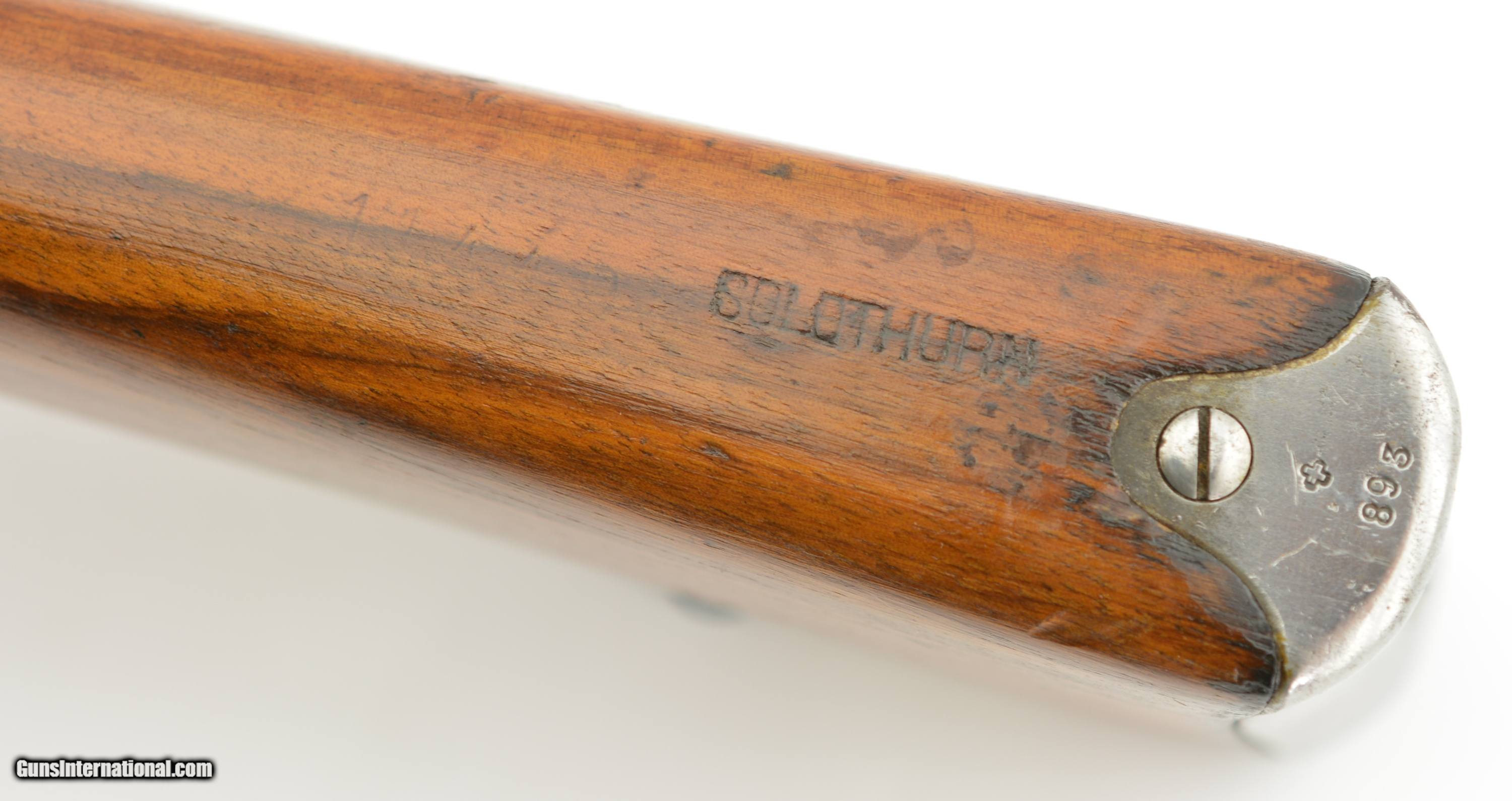 Description: Serial #286893, 7.5mm Swiss, 30 3/4" barrel with an excellent, bright bore. This is a very nice rifle that has matching numbers on the receiver, barrel, bolt, and magazine with the metal retaining 97-98% of the original blue finish that has silvered slightly at the muzzle, as well as some of the high edges. The bolt still has its armory bright finish with some light wear marks on the bearing surfaces, a few spots of mild freckling, and the ruddy-brown resin handle is intact. The wooden stock and handguard have small handling marks and minor blemishes in the armory-reapplied finish, but the Solothurn stamp is still crisp and clear on the comb of the butt. A small surface chip is missing from the nose of the handguard, just ahead of the muzzle-band. This is a fine example of a non-import marked Schmidt-Rubin rifle, and would make a great addition to a collection. FFL or C&R SOLD Curio/Relic: Yes Manufacturer: Schmidt-Rubin Model: 1911 Serial Number: 286893 Caliber Info: 7.5mm Gauge Info: 7.5mm |