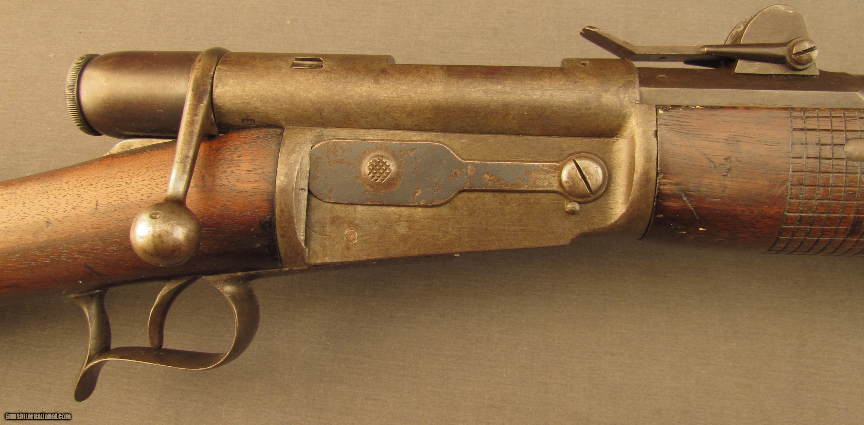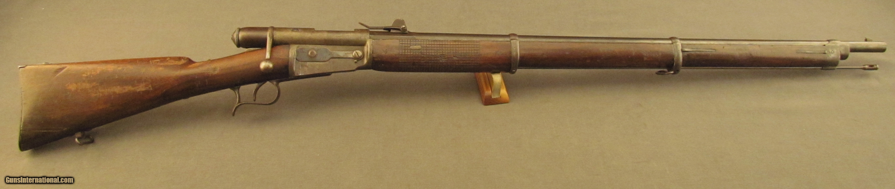 Description: Serial #65834, 10.4mm RF (.41 Swiss), 33” barrel with a very good bore that has light freckling and some pinprick pitting within the grooves. This first type Vetterli is equipped with a pivoting loading gate on the right side of the receiver and is milled for the almost universally absent cartridge lifter assist spring. The metal has an overall plum-brown patina that mixes with a dark pewter gray color on the balance while the loading gate cover retains some of the original bright blue finish. There is also some further mild silvering along the high edges and at the muzzle and the bolt, although correct, is numbered to a different gun on the body (the receiver, barrel, and lifter are matching). The walnut forend and buttstock are in very good shape with numerous small handling marks and blemishes scattered throughout the added military oil finish yet the Swiss stamps are still quite crisp and clear. The rifle is equipped with a non-original ramrod that is slightly too short and the mechanism is tight and fully functional. This is a nice example of an early Swiss Vetterli and would make a nice representative example for a collection. Antique SOLD Antique: Yes Manufacturer: Swiss Model: 1869 Caliber Info: .41 Swiss RF Gauge Info: .41 Swiss RF |