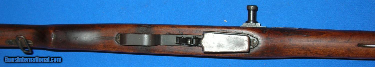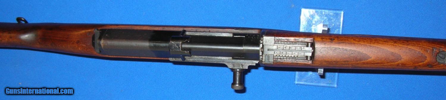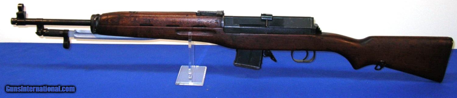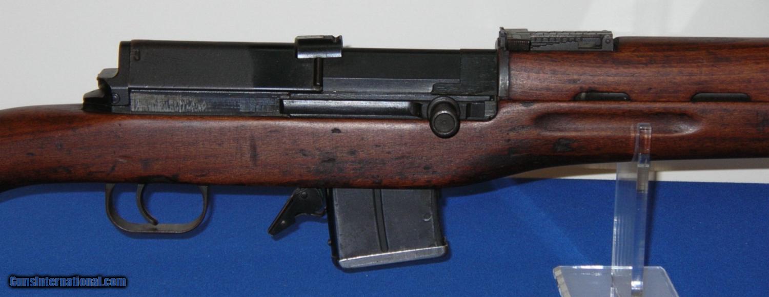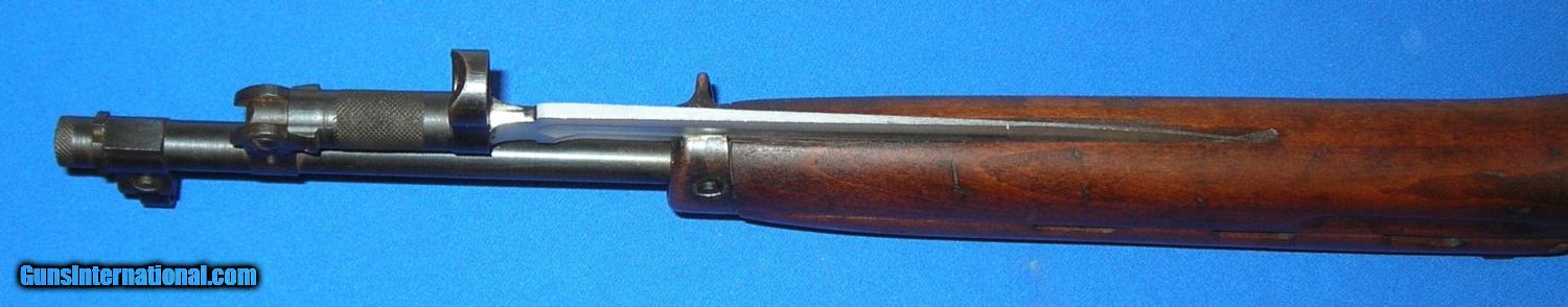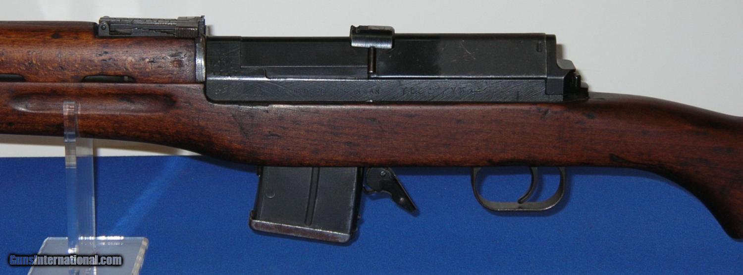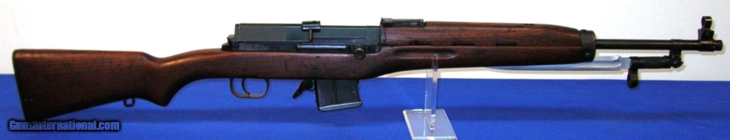 Description: SOLD / Pending Funds UAR Rasheed Semi-Automatic Carbine, serial # 63863, cal. 7.62 X 39 mm, 20" barrel with an excellent bore, metal surfaces retain 90-95% original blue finish with some freckling and the surfaces also exhibit minor scuffing and scratching consistent with a military fielded weapon, the original hardwood stock and upper handguard rate very good with sporadic dings and bruises normally associated with a military weapon but nothing alarming, equipped with a hooded front sight and a tangent leaf rear sight as well as a Soviet style folding blade bayonet, and includes its 10 round original magazine. This carbine overall as photographed and described is in very good - excellent condition. Inv.: # 2-1641 SOLD Curio/Relic: Yes |