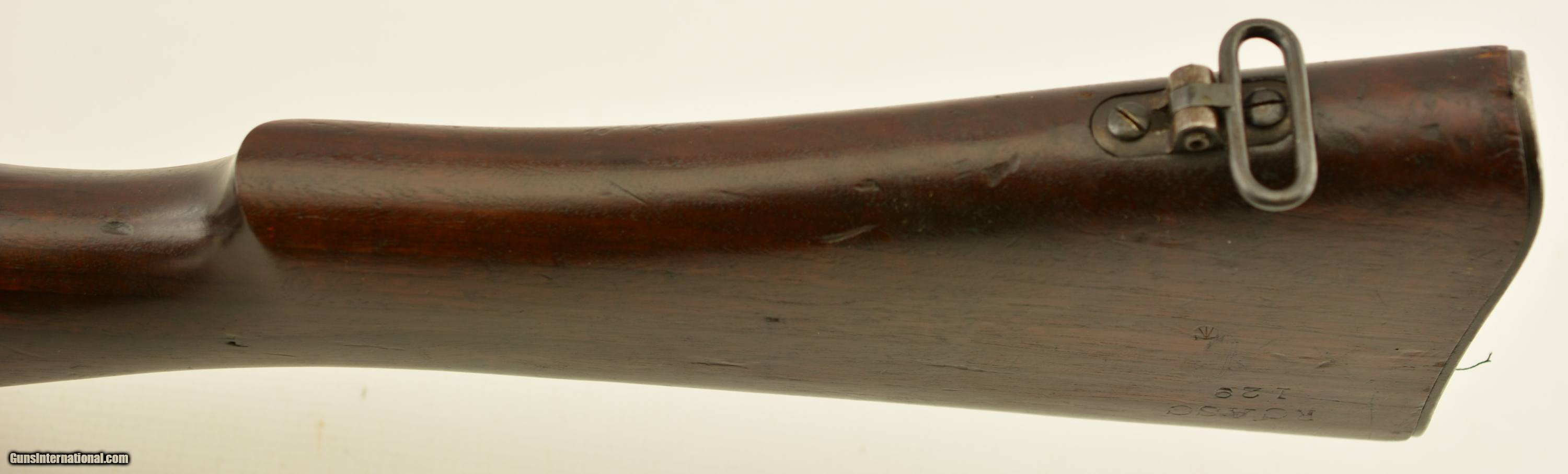 Description: Serial #1064558, .30-06, 26" barrel with an excellent, bright bore. This rifle has a 9-18 dated, “E" marked barrel and has retained about 50-60% of the original blue finish, which has turned to a dull gray-brown patina on the muzzle, as well as on other exposed edges and surfaces. The receiver and sight components are are all Eddystone, and have contact wear and finish loss consistent with the rest of the gun, as well as the serial number added by a unit armorer onto the bolt handle. The “W" marked, Winchester stock and slightly different colored handguard are in very good condition with numerous minor handling marks and blemishes in the added dark brown military oil finish. Crisp “C (Broad Arrow)" and “RCASC" (Royal Canadian Army Service Corps) stamps are present on the right side of the butt, and a nearly complete red painted, “30/06" band is present just behind the nosecap. The red bands were added by Canadian armorers to denote .30-06 chambering, rather than .303. Most of the Model 1917 Enfields purchased by Canada ended up with the RCAF, but this example was issued to the Army Service Corps, who were responsible for logistics support for the Canadian Army. This a great looking rifle, built for WW1, and subsequently used by Canada during WW2. The rifle rates fine condition overall, and comes with a rarely seen Canadian Service Corps marking. FFL or C&R SOLD Curio/Relic: Yes Manufacturer: Enfield Model: 1917 Serial Number: 1064558 Caliber Info: .30-06 Gauge Info: .30-06 |