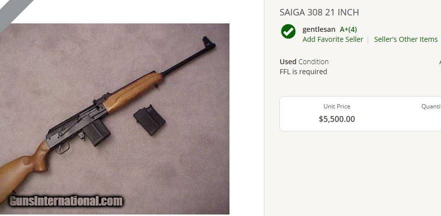 Description: THIS IS A VERY RARE RUSSIAN SAIGA IZHMASH 21” 308 CALIBER SEMI AUTO RIFLE IMPORTED BY EAA OURS IS 1500.00 BUT THE LAST PHOTO SHOWS WHAT A GUY ON ANOTHER SITE HAS ONE LISTED FOR “5500.00” GOOD LUCK WITH THAT THE BORE OF THE 21” CHROME LINED BARREL IS BRIGHT, SHINY AND EXCELLENT THE WOOD FURNITURE IS A LITTLE SCUFFED BUT THERE ARE PLENTY OF PICTURES AND YOU CAN SEE IT A QUICK DETACH SCOPE MOUNT, TWO 20 ROUND MAGAZINES AND ONE THAT LOOKS LIKE MAYBE A 10 ROUND AND SHIPPED ONLY TO WHERE LEGAL BECAUSE OF THE FAST PACE AND VOLATILITY OF THE GUN MARKET WE WILL GIVE NO INSPECTION PERIOD. IF YOU WANT MORE INFO OR MORE PHOTOS ASK “BEFORE” YOU BUY. SHIPPED AS SHOWN WITH NOTHING ELSE AND ONLY TO WHERE LEGAL UNDERSTAND THAT WE WILL PUT A SIGNATURE ON THE PACKAGE SO IT WONT GET LEFT ON A PORCH AND IF THAT IS UNACCEPTABLE THEN I’M SORRY BUT PLEASE DON’T BUY BUYER PAYS A FIXED AMOUNT OF 35.00 INSURED SHIPPING TO THE LOWER MAINLAND STATES. SHIPPING TO ALASKA, HAWAII OR PUERTO RICO WOULD BE 78.00 WE WILL ONLY SHIP THIS GUN TO WHERE LEGAL NO SHIPMENTS OUTSIDE THE USA. MISSOURI RESIDENTS DO PAY A 8.575% SALES TAX. NO EXTRA CHARGE FOR CREDIT CARDS. BRANDON'S GUN TRADING CO LLC 321 EAST 20TH ST JOPLIN MO. 64804 (417)-623-8787 FAX (417)-623-2326 9-5 TUESDAY-SATURDAY CENTRAL TIME WE ARE ALSO CLOSED THE 1'ST SATURDAY OF EVERY MONTH AND HOLIDAYS. INVENTORY REFERENCE : BB1373 P-3857265 PLEASE NOTE, UPS SERVICE HAS GOTTEN SO BAD UNDER CURRENT MANAGEMENT THAT WE WON’T SHIP UPS UNLESS WE ABSOLUTELY HAVE TOO. WHEN WE DOUBLE PACK, INSURE, ADD SIGNATURE, USE GOOD BOXES AND UPS EVEN NOTES THEY DAMAGED THE ITEM AND THEY STILL WONT PAY. ALSO, ANY INSURANCE WE DO PUT ON OUR PACKAGES IS VOID IF YOU OR YOUR DEALER THROWS AWAY THE BOX, ANY PACKING MATERIALS OR FAILS TO PICTURE AND NOTIFY US AND THE SHIPPING COMPANY IMMEDIATELY SOLD Rifle Caliber: .308 Winchester Manufacturer: RUSSIA Model: SAIGA |