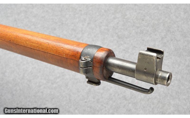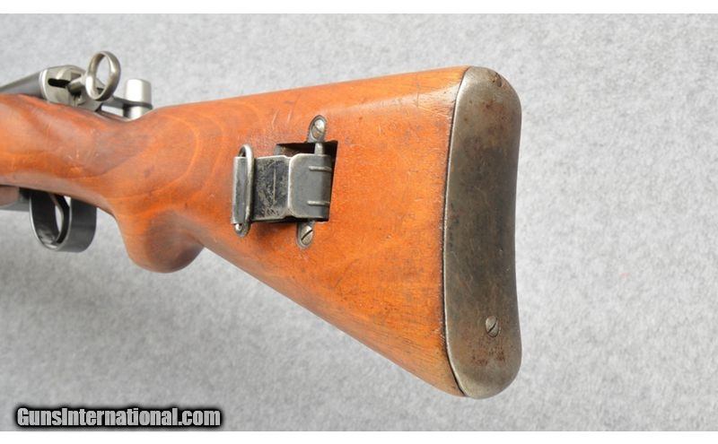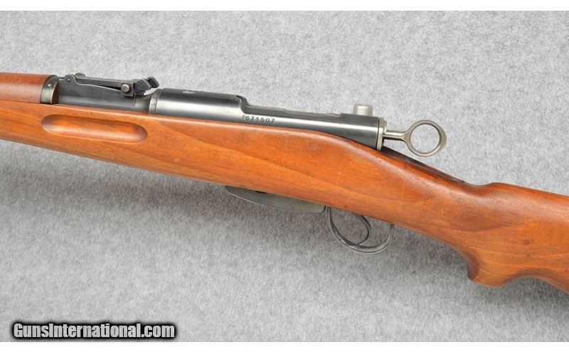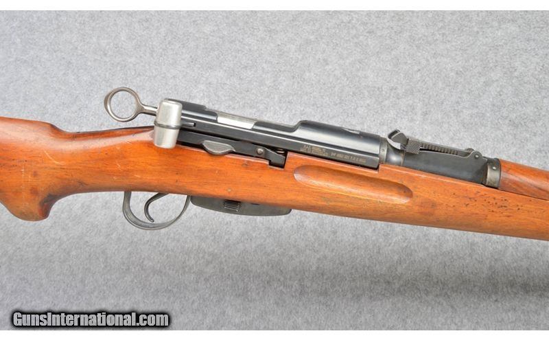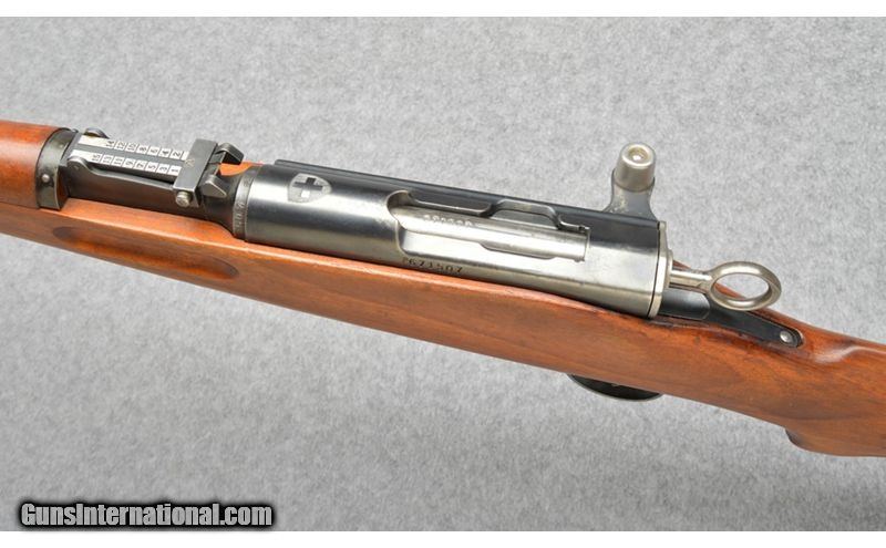 Description: Straight pull bolt action rifle manufactured by Waffenfabrik Bern for the Swiss military. Solid rifle shows moderate edge wear on the metal and scattered dings and handling on the stock. All appears functional with a good bore. Overall Good Plus condition 7.5x55 Swiss SOLD Curio/Relic: Yes Metal Condition: 85-90% Bluing , Few handling marks Wood Condition: Scattered light dents and scratches, Good Varnish Barrels: 26 Inch Fore End: Full Length Forearm Butt Pad: Steel Sights: Tangent Rear Sight, Winged Front Post Item Location: Buda, TX |
