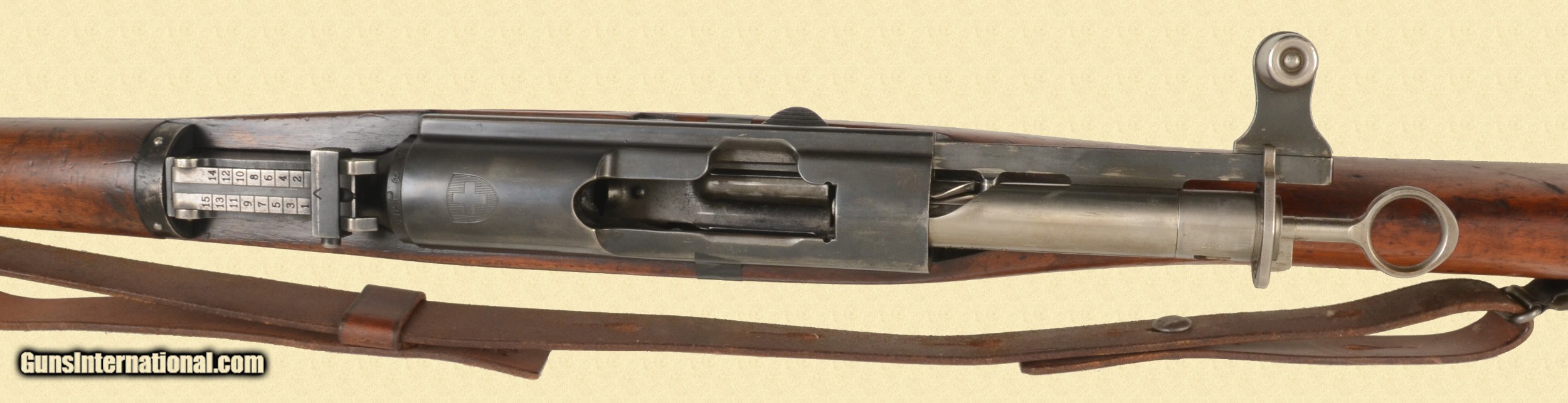 Description: 7.5mm; 80% blue, very good bore, very good stock, 25.65'' barrel, Mfg. 1943 The barrel has a muzzle cap. The front sight is a winged post, with edge wear on the wings. The rear sight is an elevation adjustable tangent. The receiver has some mild thinning and edge wear. It has the serial number on the left side, and a Swiss Cross inside of a Shield. The receiver the bolt and the magazine are all numbers matching. The walnut stock is in very good condition with a mild amount of handling marks and dings in the area of the buttstock. The right side of the buttstock has a small Swiss Cross in a Shield stamped into the stock. The carbine also has a brown leather sling. Import Marked. Please call (309)342-5800 Tues-Fri, 10 am -6pm (CST), or Sat 1pm-6pm (CST), to speak with our sales team for further information, or to purchase firearms. FEDERAL FIREARMS LICENSE (FFL): is required on all shipments of modern guns. We must wait for a copy from your dealer before we can ship to them. We will also ship C&R eligible firearms to Curio and Relic (C&R) license holders. We accept your signed, legible FFL and C&R licenses via fax at 309/ 342-5730 (always on), email at FFLsimpsonltd or through the mail at Simpson Ltd; 140 S Seminary St; Galesburg, IL 61401. Pre-1898 firearms and non-firearms items are exempt from licensing requirements. All items shipped to an Illinois address will be charged 8.75% sales tax. NOTE: Because of recent shipping restrictions and charges placed on us by UPS and FedEx (handguns must ship via next day or 2nd day air and they have added a $10 surcharge for parcels over 48”. Our return policy lasts a maximum of 3 days from the time you receive your item. If 3 days have passed since you received your purchase, and we have not been contacted by you, unfortunately, we can’t offer you a refund or exchange. If you are not happy with your purchase, please contact us by phone and/or email to arrange for a return. Items must be shipped back to us to arrive with 7 days of notification of return. LAYAWAY POLICY: We are willing to put items on layaway for you under the following conditions: The item must be priced at $500 or more with a 20% minimum deposit and must be paid off within 30 days. You may have a maximum of 2 items on layaway at one time. If the balance is not paid off within the 30 day period, all deposits and payments will be forfeited and not returned or applied to another item. SOLD Curio/Relic: Yes Serial Number: 747128 |