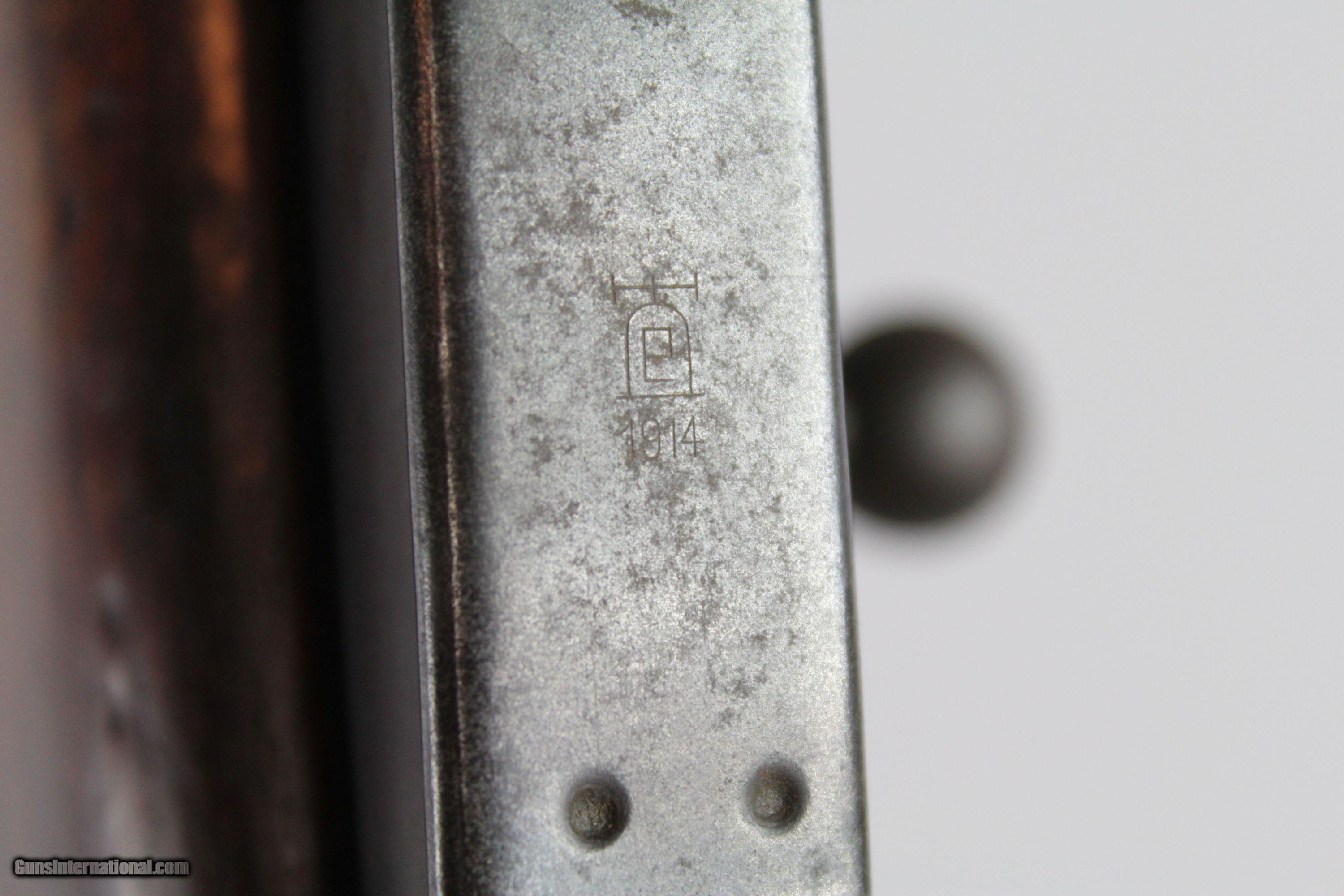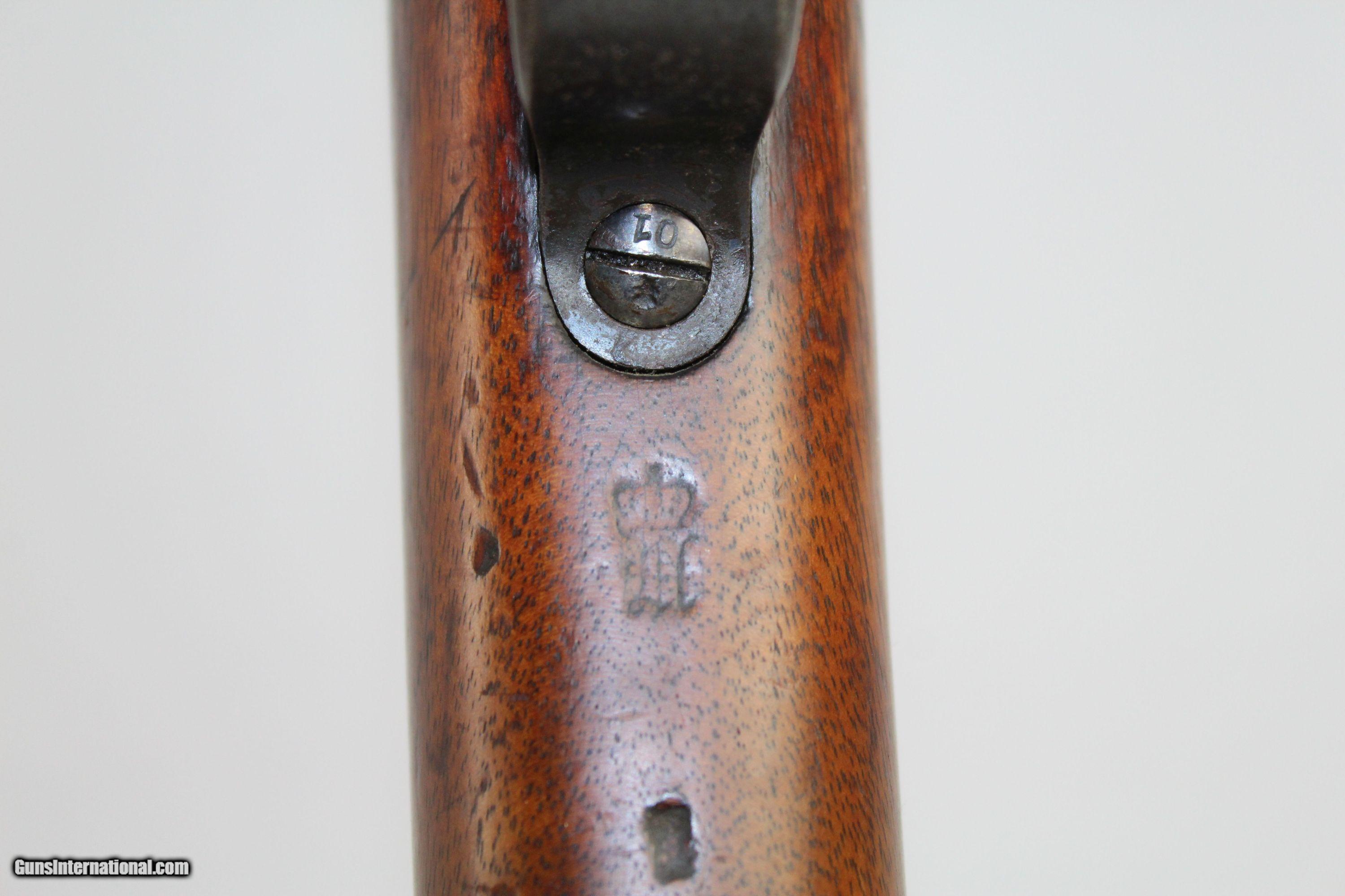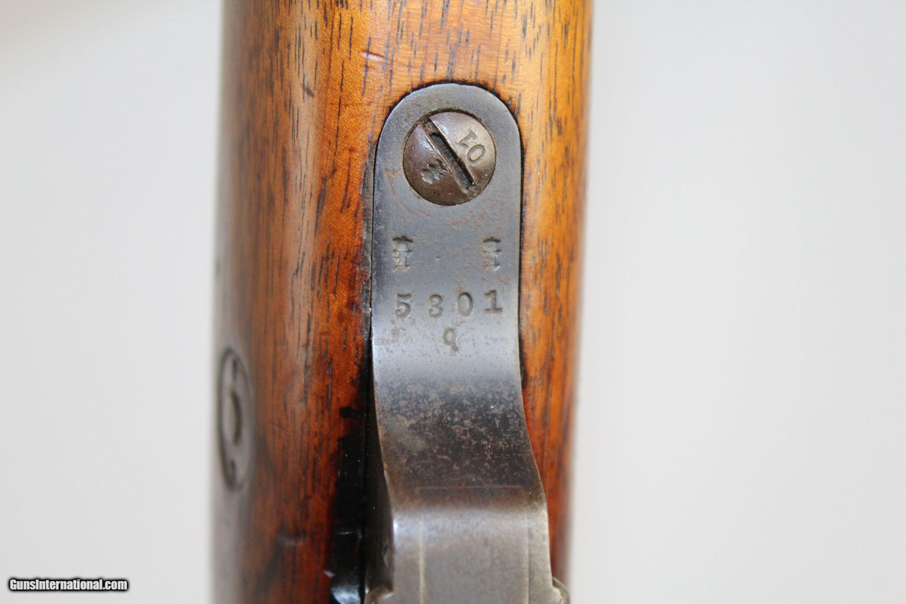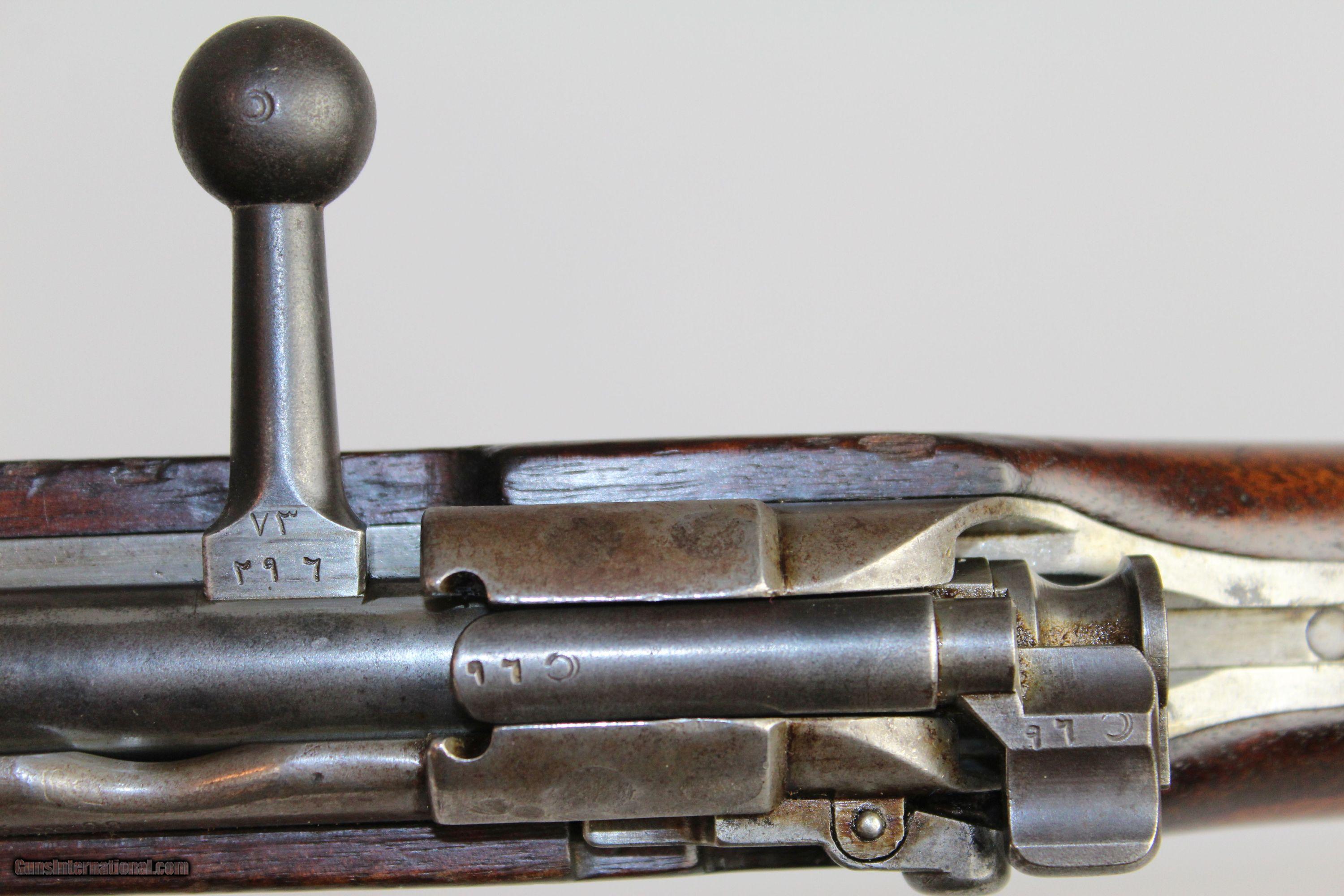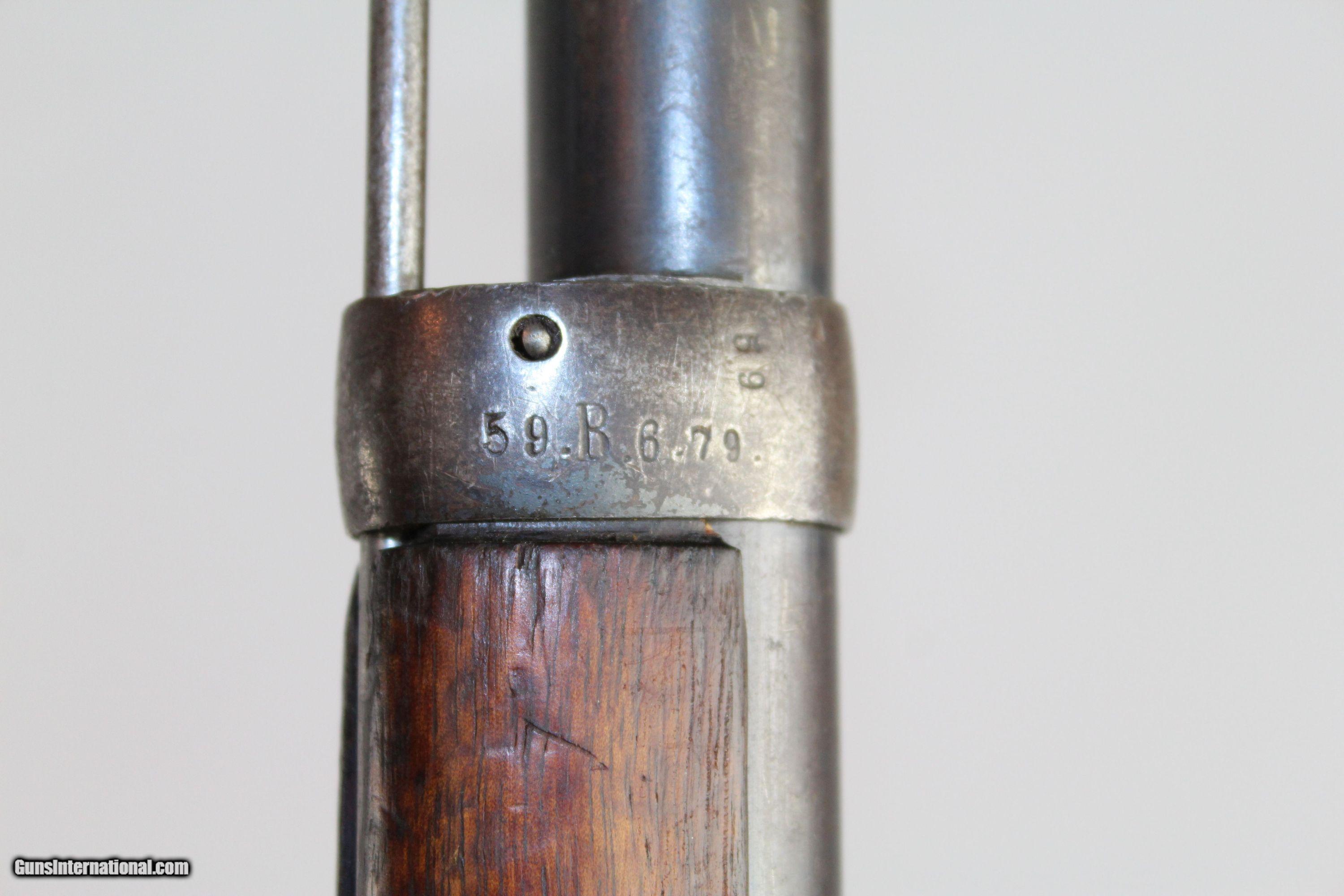 Description: WWI C&R German/Turkish LOEWE Gewehr 88/05 Rifle Used by the Ottomans During WORLD WAR II! Here we present a German Commission Rifle Model 1888/05, made in 1890 by Ludwig Loewe & Company in Berlin, Germany. A highly advanced rifle when it was introduced, it was quickly made obsolete in the European arms race of the late 19th and early 20th Century. Mauser, who was furious with this rifle’s adoption, would soon dominate the market with his Model 98. When World War I saw Germany allied with the Ottoman Turks, the Germans provided the Turks these surplus rifles, which were then updated at the arsenal to accept the more modern spire point bullets, tighter barrel, rear sight marked in Farsi, and clip ejection port covered up. This rifle is dated on the receiver “1890”, which is the year of manufacture. The bottom of the clip ejection port cover is dated “1914”, when it was at the arsenal. The receiver is also marked “LOEWE BERLIN” with a “Crown/S” mark. The left side of the receiver is marked “GEW 88” in Gothic letters. A series of proofs are on the right side of the receiver. German acceptance marks are located behind the trigger guard and on the right side of the butt stock. The rear of the butt plate is marked “10/A”. The rear barrel band is marked “83.R.E.1.70.” The forward barrel band is marked “59.R.6.79.” These are likely unit markings from German service. The bolt handle is marked with a crescent, the rear sight is in Farsi, and it appears that various parts were renumbered in Farsi. The overall condition is very good. The original blue on the barrel shroud is about 50% with the balance having a dark patina. The numerous markings are clear and legible. The serial numbers on the barrel, receiver, screws, and magazine match while the barrel bands are mixed. The stock is solid and in good shape, with a solid period repair to the toe. The bore is excellent, with sharp rifling and bright surfaces. The action is excellent and strong. Here is a very nice historical rifle for your collection! This firearm is classified as a Curio & Relic. Barrel is 30 inches. Caliber: 7.92x57mm Overall condition as seen in photos. Very Fast. Very Safe. FREE SHIPPING. Will need to be sent to your local FFL or C&R licensee. This firearm is classified as a Curio & Relic. Guaranteed AUTHENTIC & Includes CERTIFICATE OF AUTHENTICITY. ancestryguns $1000 #5084 SOLD Curio/Relic: Yes |