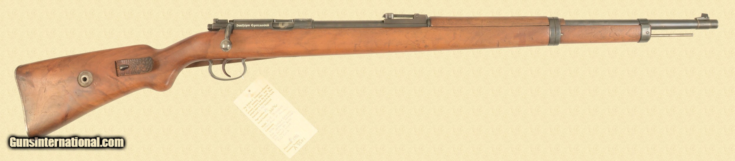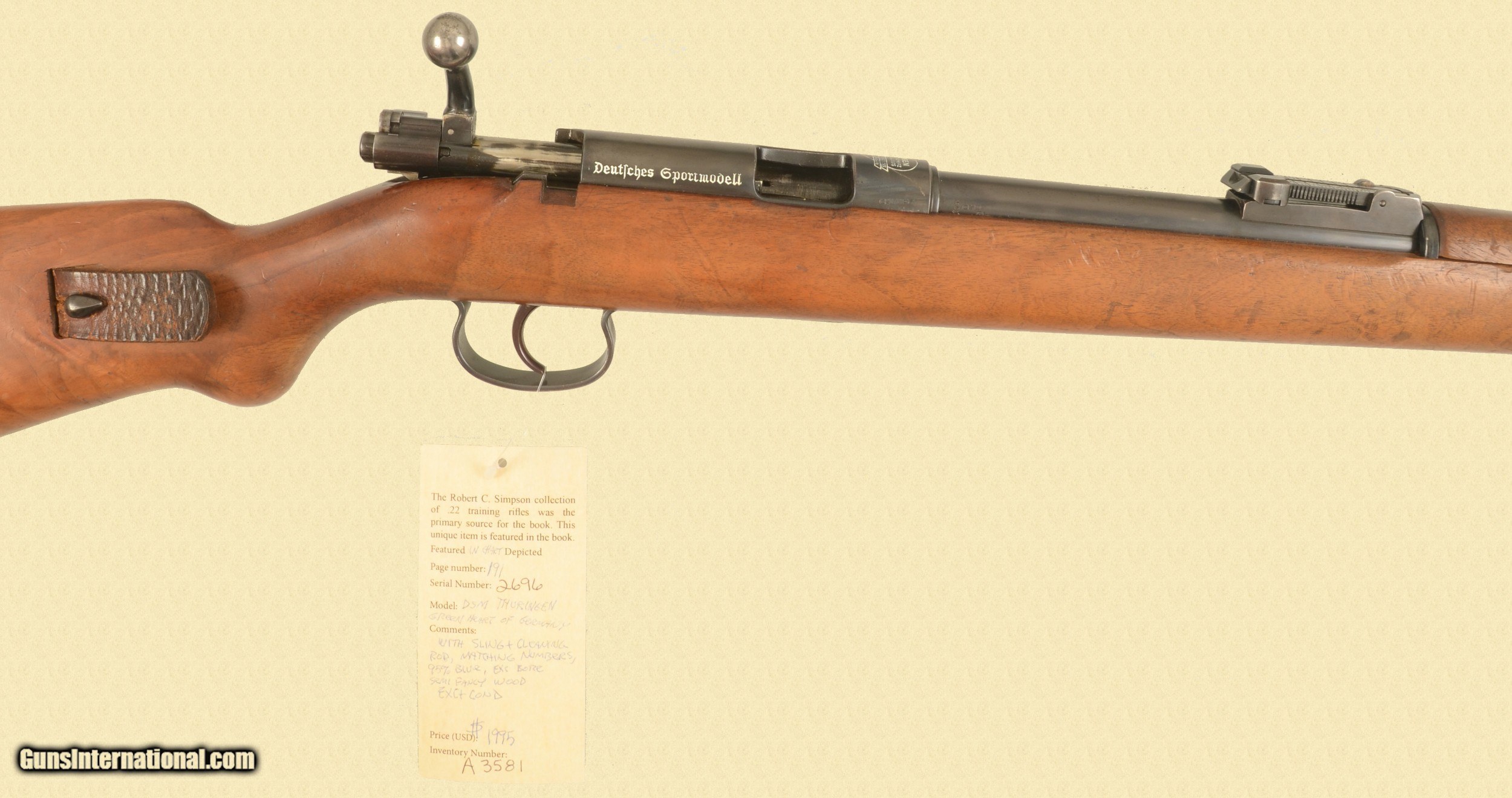 Description: .22LR; 95% blue, mint bore, excellent stock, 26 1/2'' barrel, Modeled after the K98, this training rifle has an inverted "V" front sight and tangent rear sight graduated from 25 to 200, with the left side of the barrel marked "KAL.22 LANG FUR BUCHSEN" ahead of a set of crown and Nitro proofs. Repeated "crown/letter" proofs on bolt handle and receiver. Chamber is marked with the Thuringen Green Heart logo, with "Deutssches Sportmodell" in Germanic script on the right receiver side. Smooth pistol grip semi-fancy stock with brown leather sling and steel buttplate. This fine trainer is in excellent condition. The rifle retains 95% original blue finish, the stock is excellent with only some minor handleing marks., Training Rifles of the Third Reich pp 191 Please call (309)342-5800 Tues-Fri, 10 am -6pm (CST), or Sat 1pm-6pm (CST), to speak with our sales team for further information, or to purchase firearms. FEDERAL FIREARMS LICENSE (FFL): is required on all shipments of modern guns. We must wait for a copy from your dealer before we can ship to them. We will also ship C&R eligible firearms to Curio and Relic (C&R) license holders. We accept your signed, legible FFL and C&R licenses via fax at 309/ 342-5730 (always on), email at FFLsimpsonltd or through the mail at Simpson Ltd; 140 S Seminary St; Galesburg, IL 61401. Pre-1898 firearms and non-firearms items are exempt from licensing requirements. All items shipped to an Illinois address will be charged 8.75% sales tax. NOTE: Because of recent shipping restrictions and charges placed on us by UPS and FedEx (handguns must ship via next day or 2nd day air and they have added a $10 surcharge for parcels over 48”. Our return policy lasts a maximum of 3 days from the time you receive your item. If 3 days have passed since you received your purchase, and we have not been contacted by you, unfortunately, we can’t offer you a refund or exchange. If you are not happy with your purchase, please contact us by phone and/or email to arrange for a return. Items must be shipped back to us to arrive with 7 days of notification of return. SOLD Curio/Relic: Yes Serial Number: 2696 |