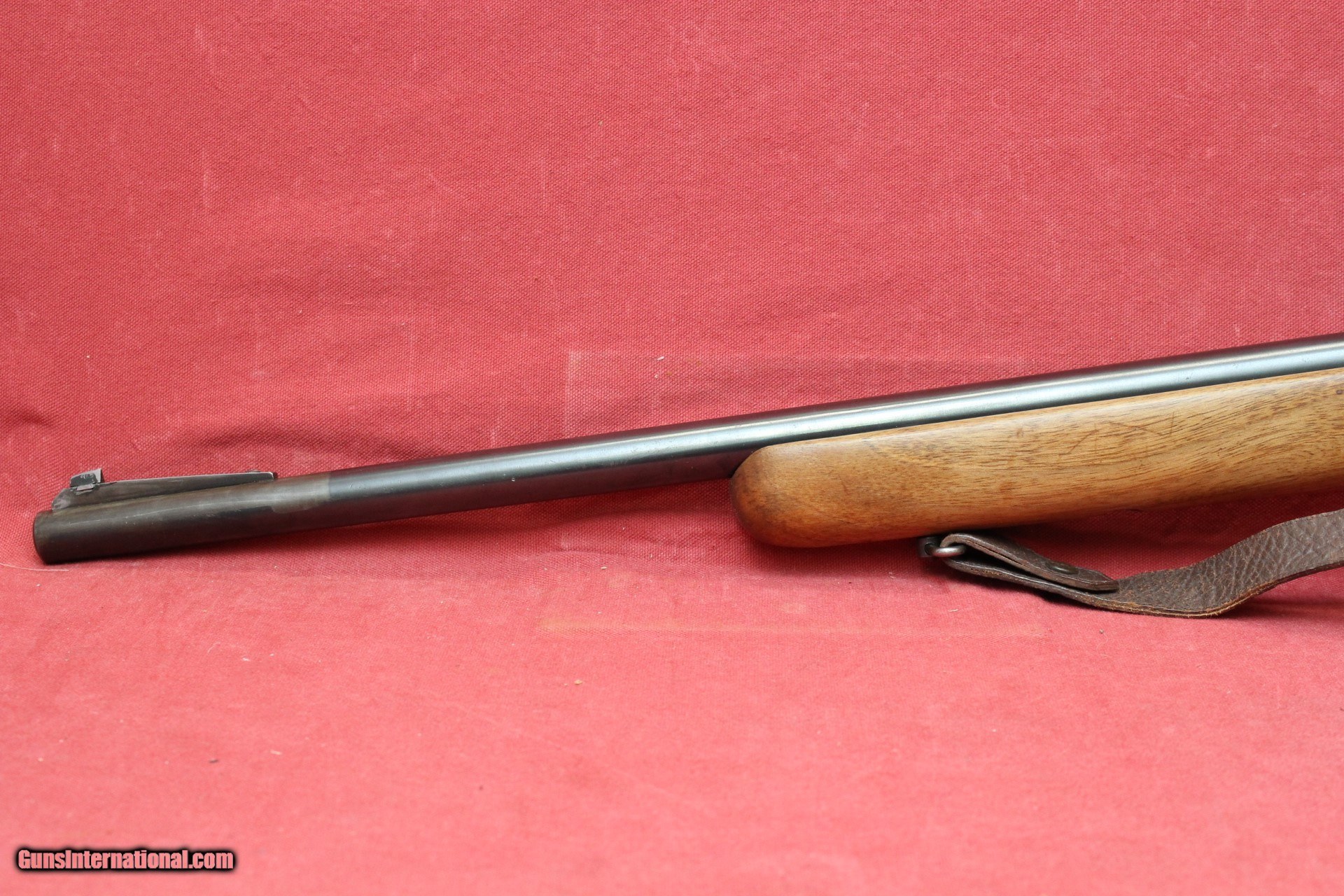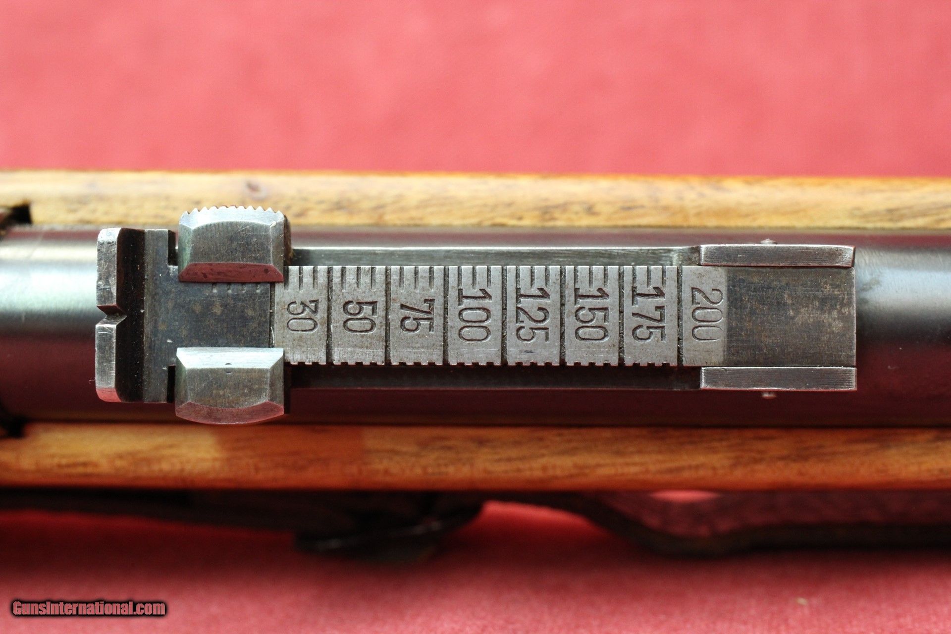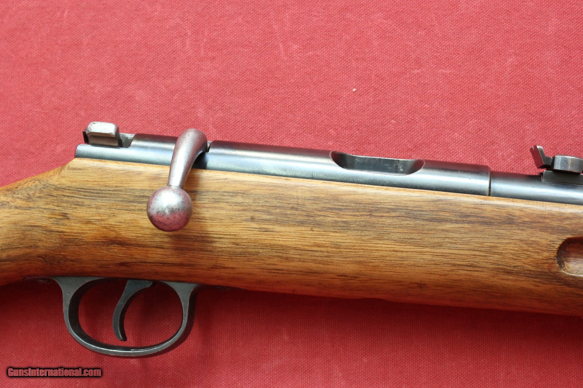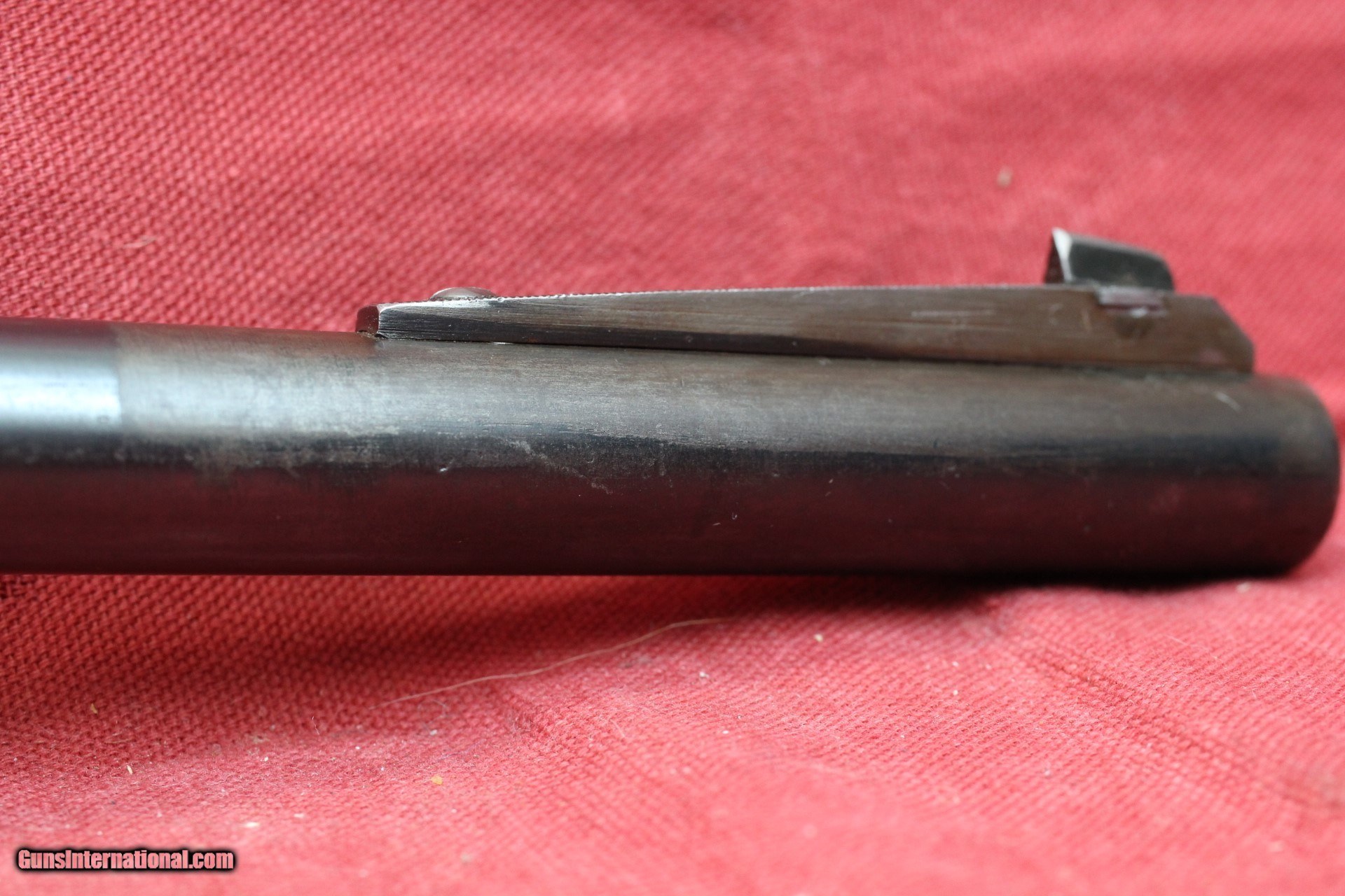 Description: 22lr, serial number 82XX. Marked "Wenzel Karabiner D.R.P.a Erma Erfurter Maschinen-U Werkzeugfabrik G.M.B.H. Erfurt". 25" barrel, single shot. Correct rear sight. Front sight appears to be correct but has been filed and possibly re-installed. Wood has been uniformly sanded, otherwise in good condition, buttplate slightly proud at toe. No large marrs or cracks. Top half of barrel 4" back from muzzle (under front sight) shows possible chemical removal of bluing. Otherwise metal shows normal wear/use. Bore is excellent. Metal buttplate. More photos on request. Please add $40.00 for shipping and insurance. Will ship to C&R. SOLD Curio/Relic: Yes |
