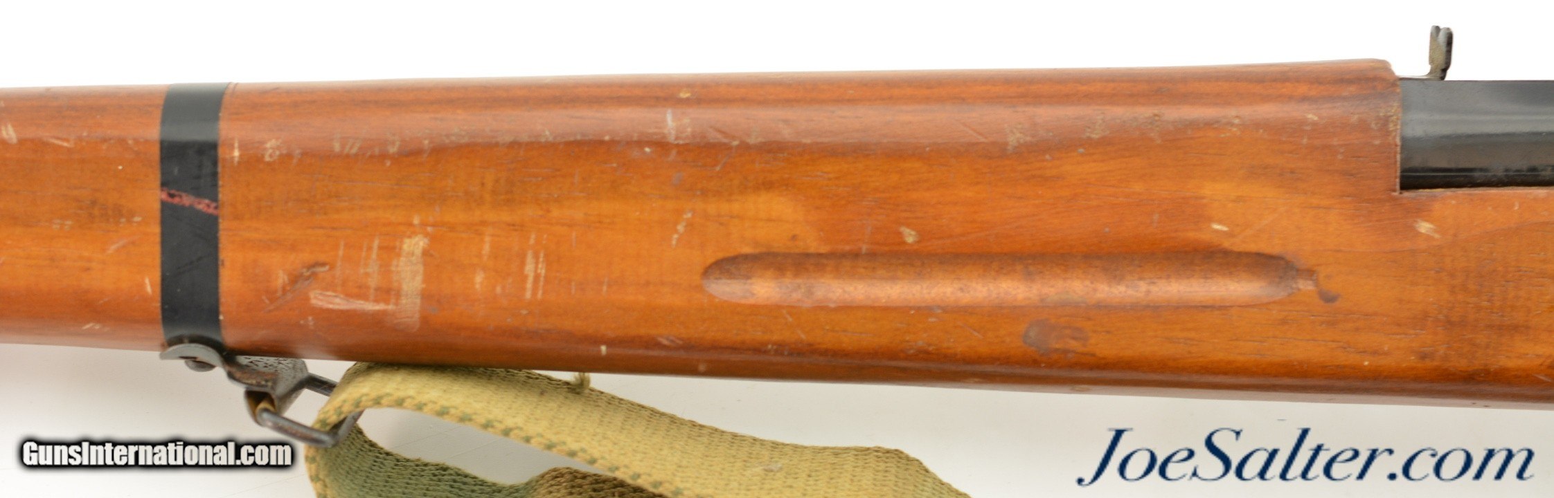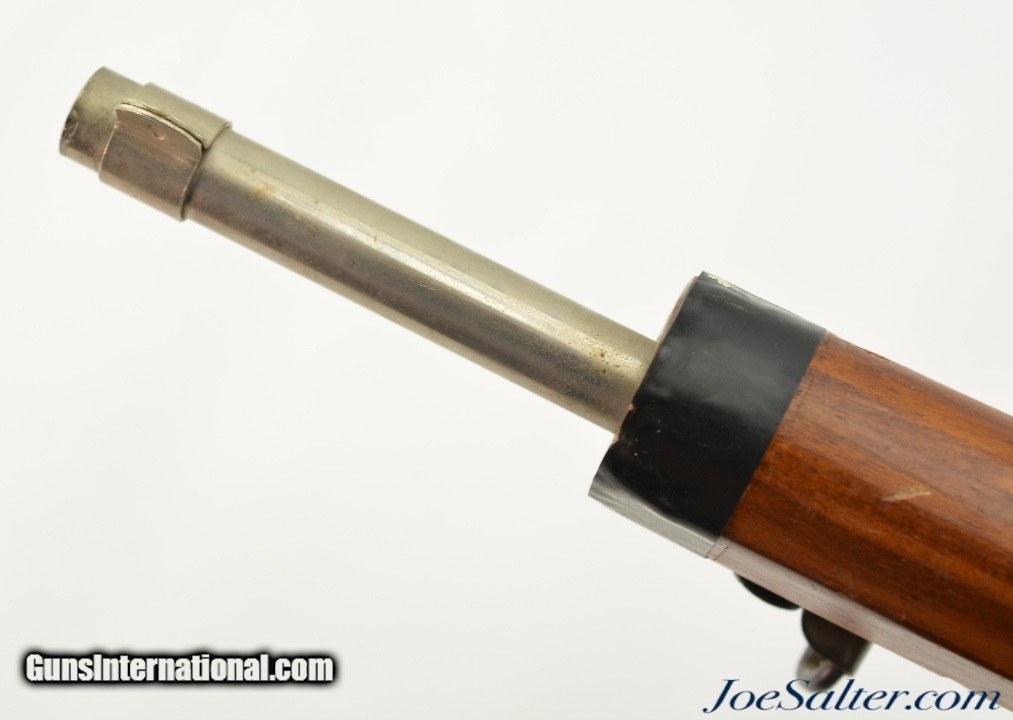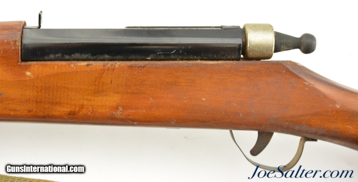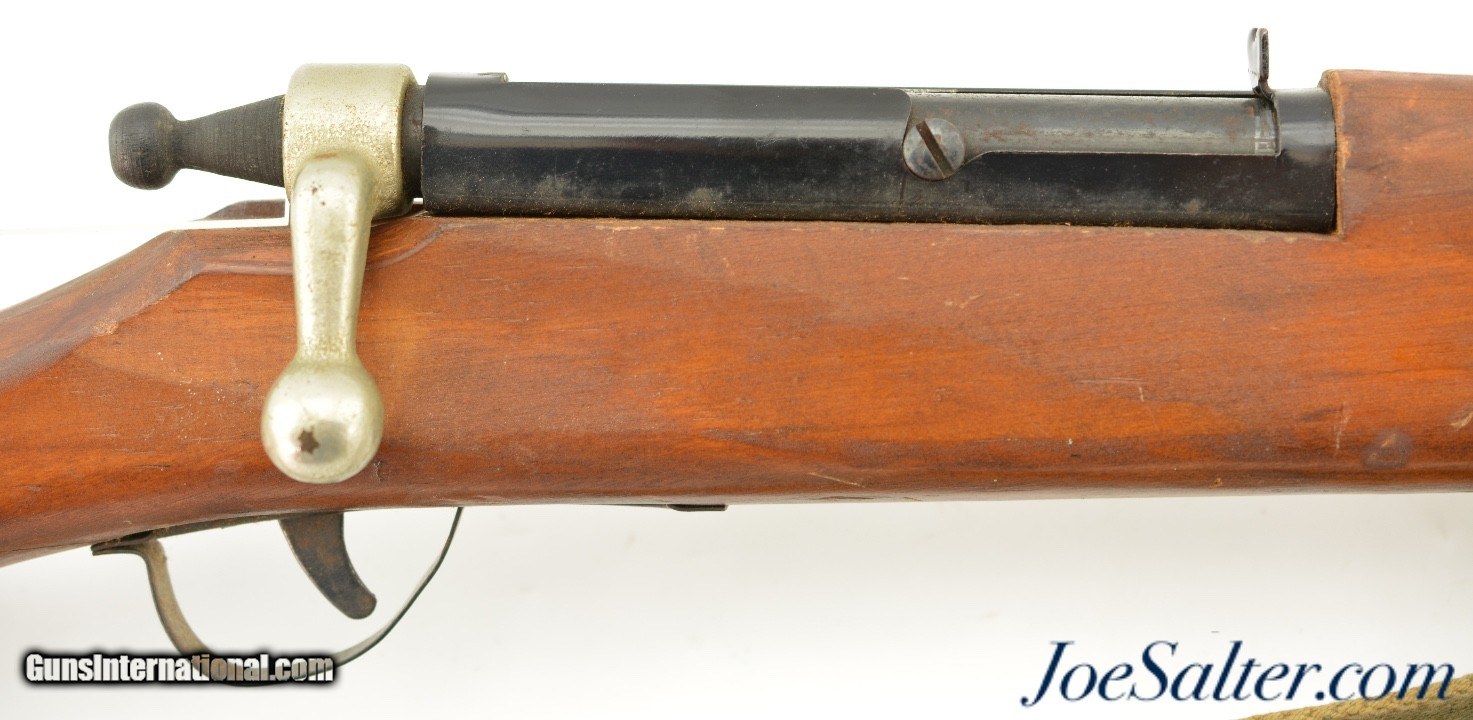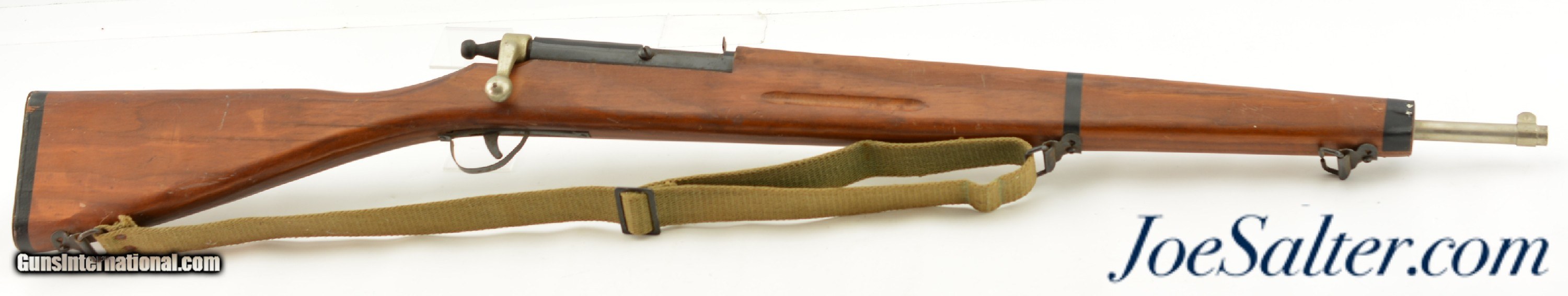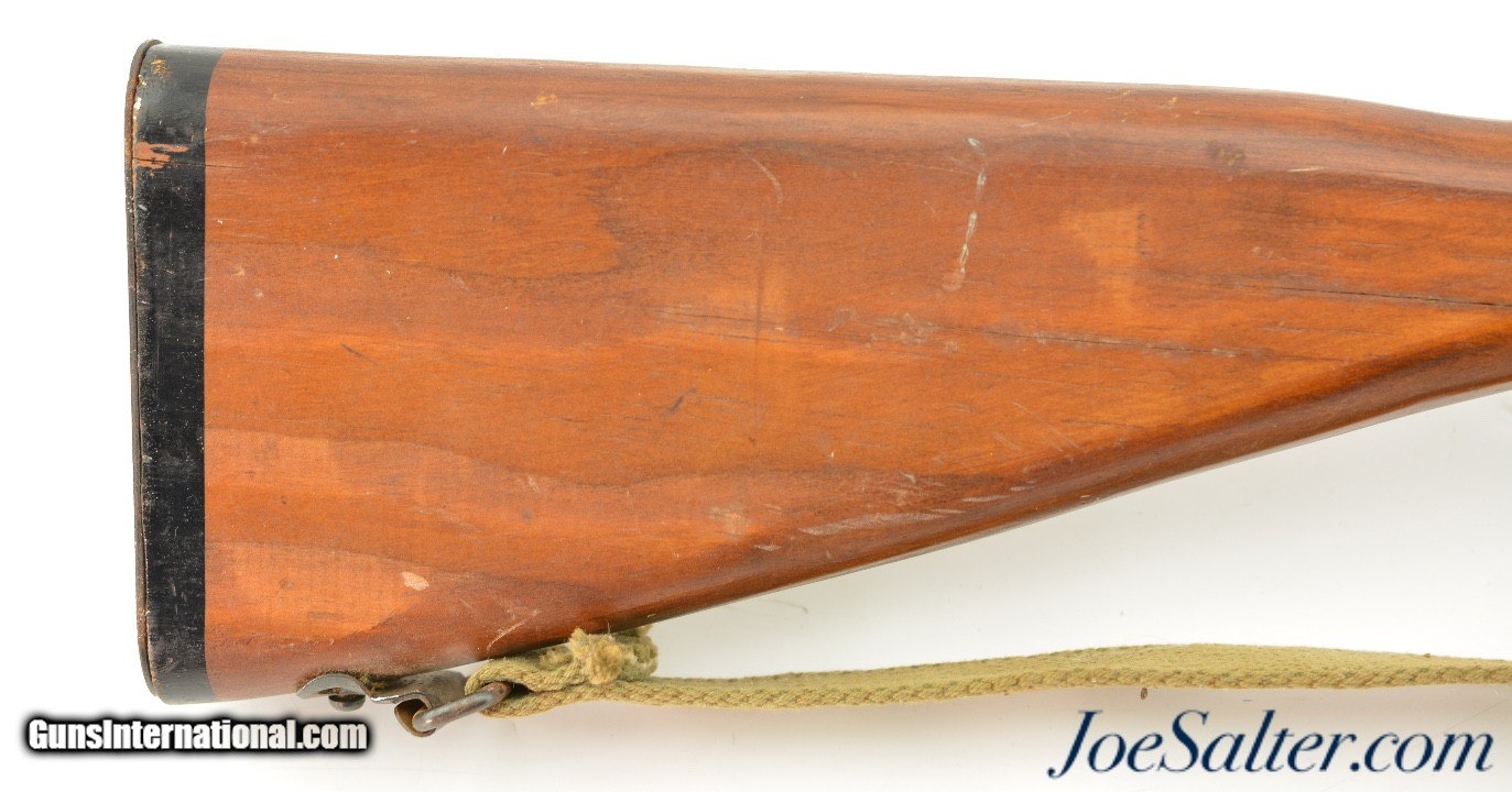 Description: This is a non-firing, Vintage Parris-Dunn M1903 Springfield Training Rifle. Although now unmarked, with the outline of the original sticker on the side of the stock, I'm certain they were made by the Parris Mfg. Co. and is vintage, I would make these as post war and were made in the '50s or '60s. Designed to look like M1903 Springfield bolt action rifles, complete with a wooden bullet in the chamber and three potion sling. This example measure 43 inches long and has numerous chips, scratches and minor wear to the finish. Overall in very good condition. The bolts and triggers work fine and any metal pieces have light oxidation, the sling is in very good condition. ; Curio/Relic: Yes Price: $129.00 Contact Seller |
