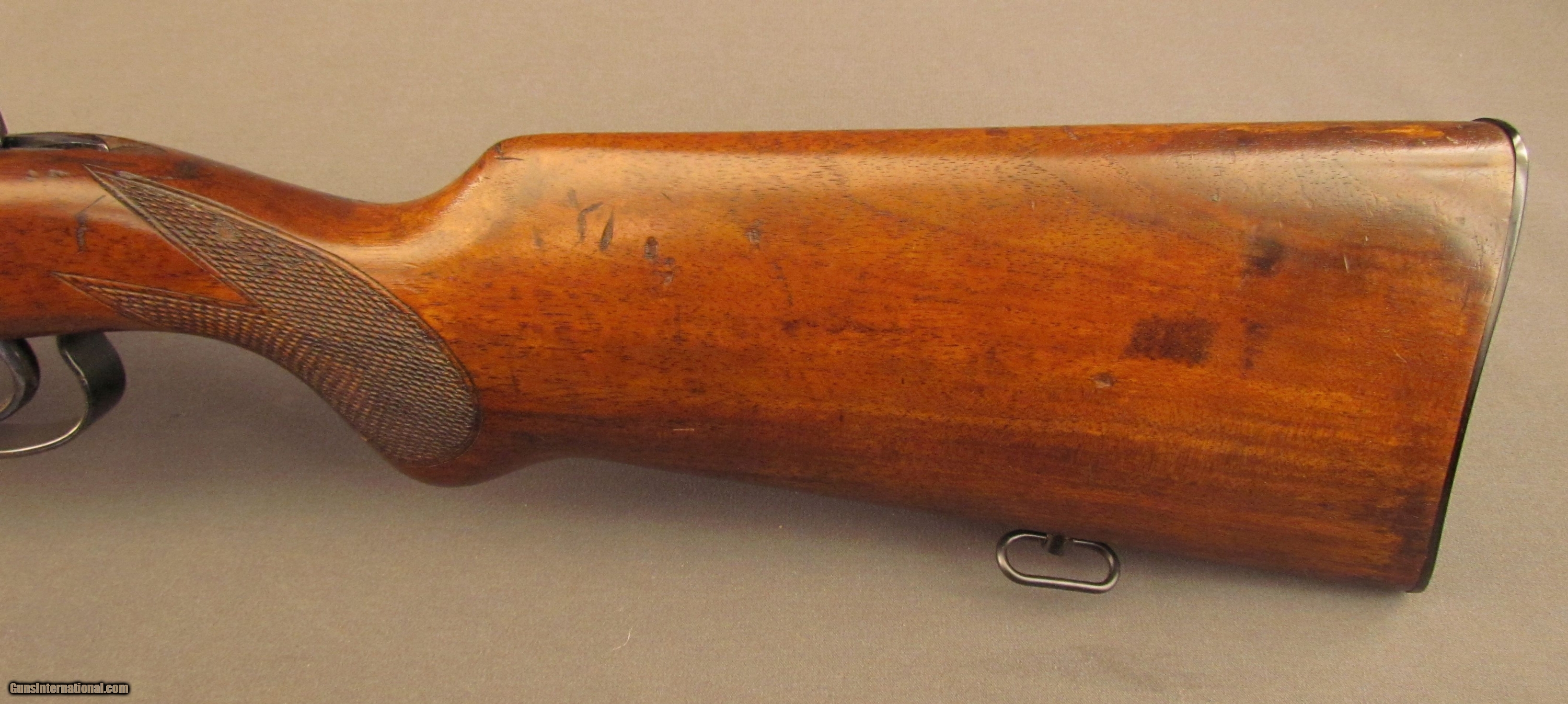 Description: Serial #152739, .22 LR, 26 3/4" barrel with an excellent, bright bore. This is a later model Es340 with the enlarged ejection port, and retains about 90-92% of the original blue with some silvering at the muzzle, along the high edges, and mottled freckling along the underside of the barrel ahead of the forend. The matching numbered bolt also exhibits mild wear with the knob toning slightly to pewter. The checkered walnut, pistol grip stock with grooved forend rates very good plus with minor handling marks and bruises scattered about the wood, the most prominent blemish is on the left side below the bolt release. The original checkered hard rubber Mauser buttplate is still installed, and a still crisp Mauser banner is present on the right side of the buttstock. The original sling swivels remain, as does the front sight hood (the ramp is slightly scratched along the sides due to hood placement and removal). The later style rear sight still has the original reversible blade aperture. This is a fine example of one of the finest .22 target/sporting rifles ever made. FFL or C&R SOLD Curio/Relic: Yes Manufacturer: Mauser Model: Trainer Serial Number: 152739 Caliber Info: .22LR Gauge Info: .22LR |