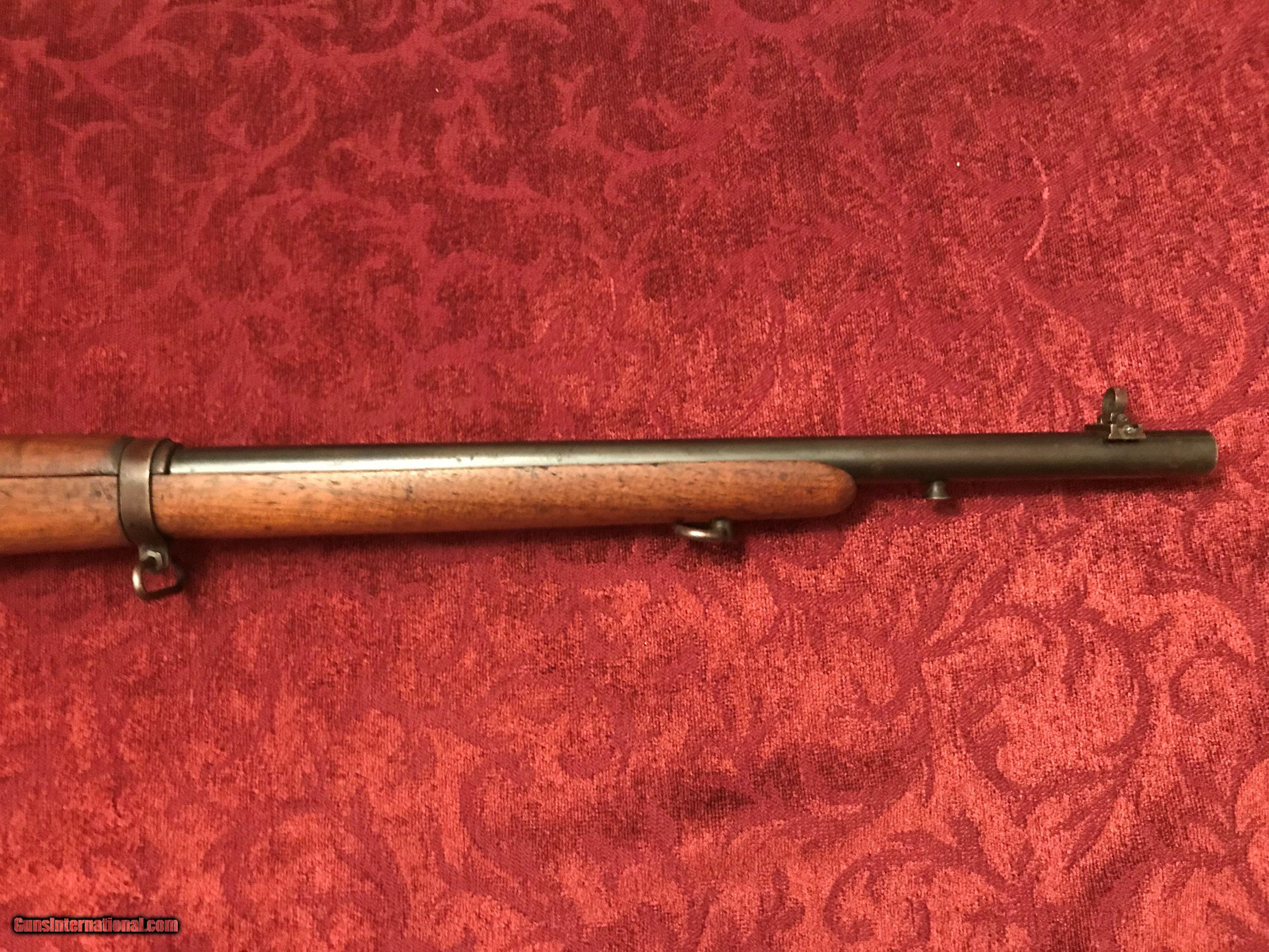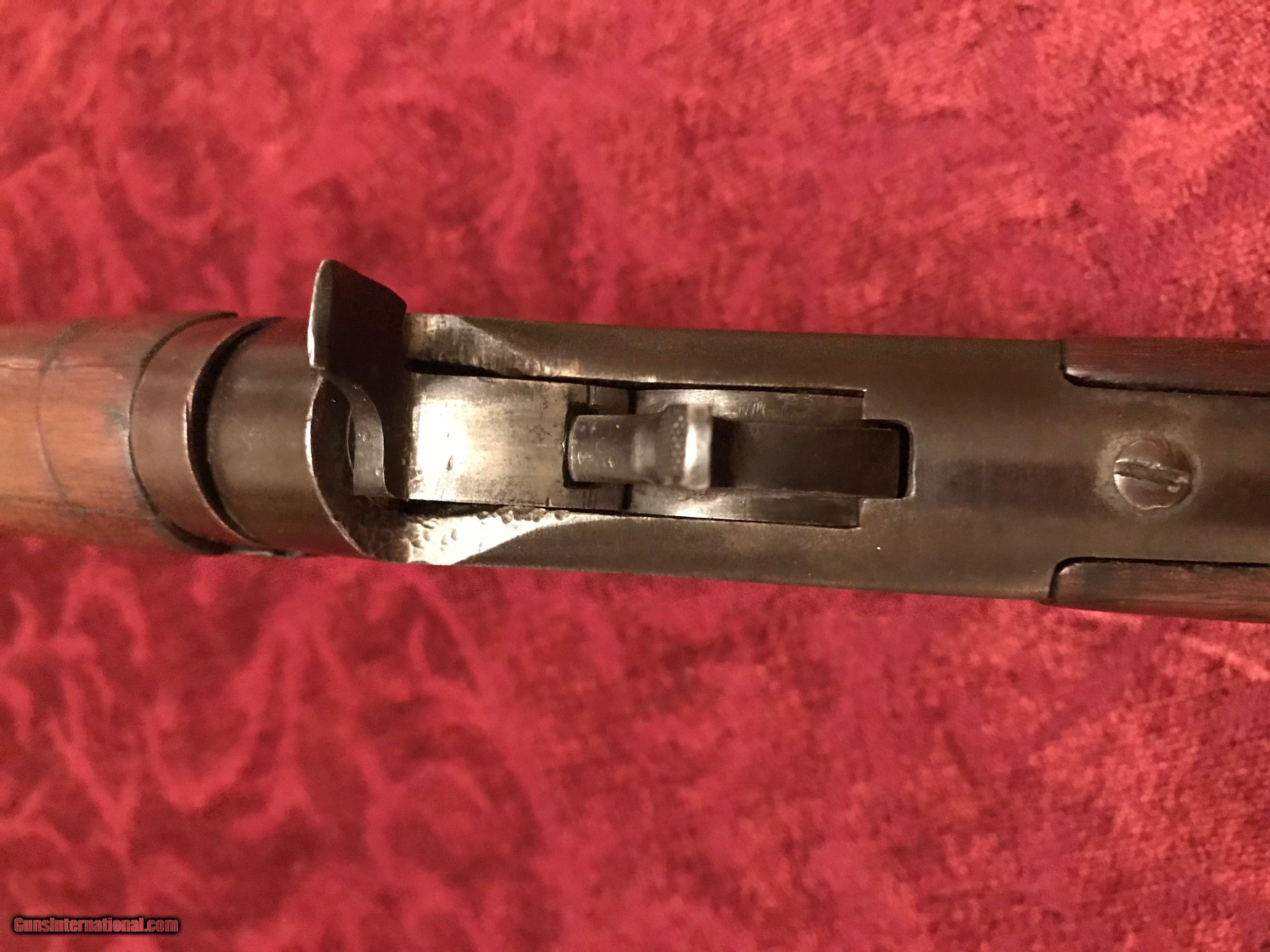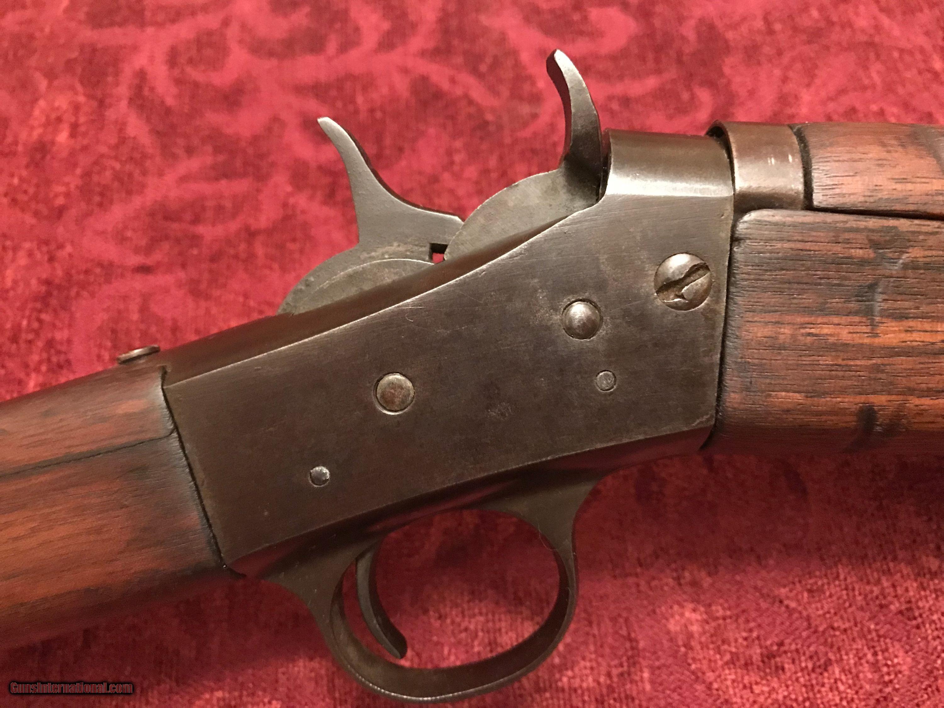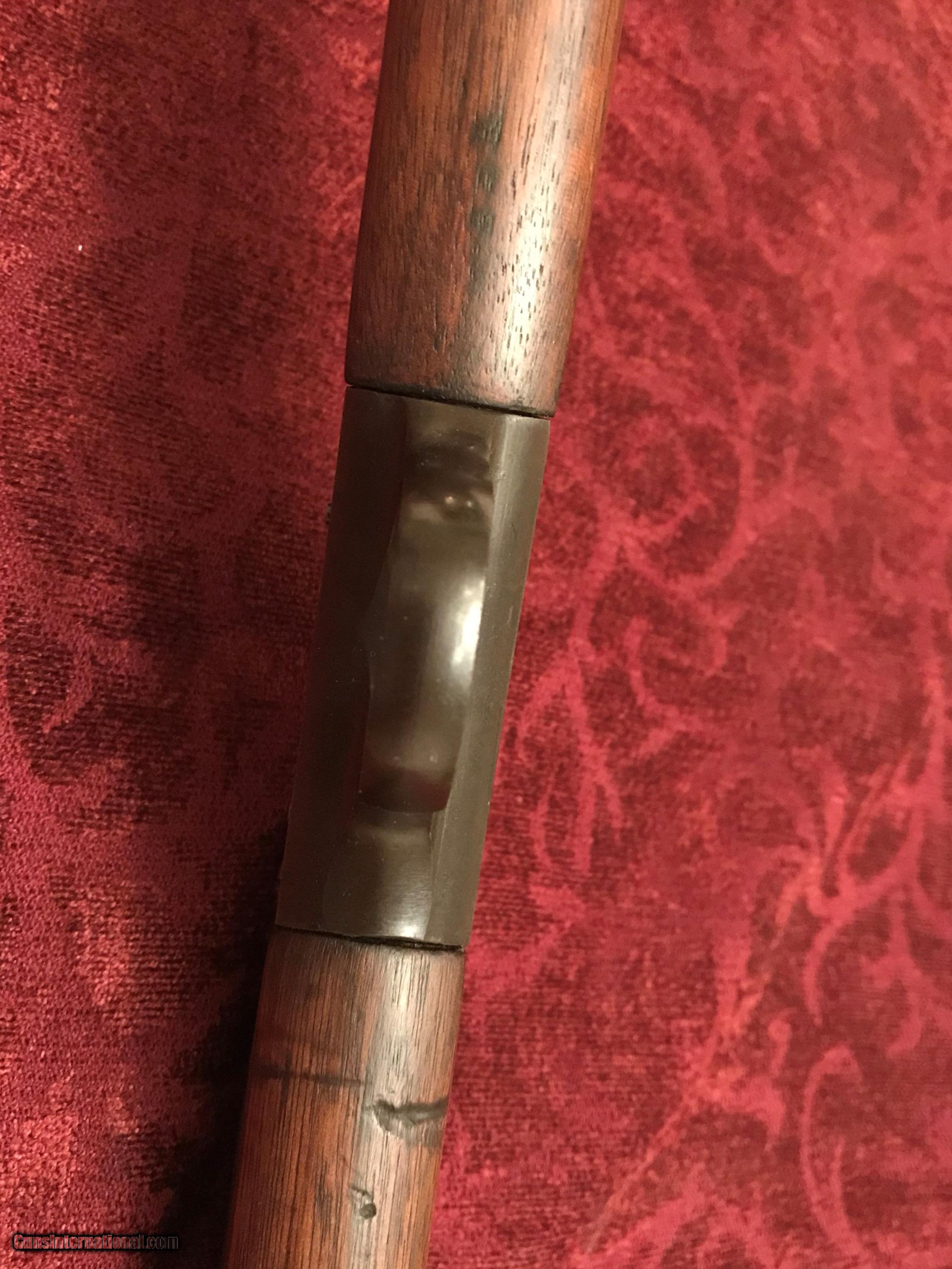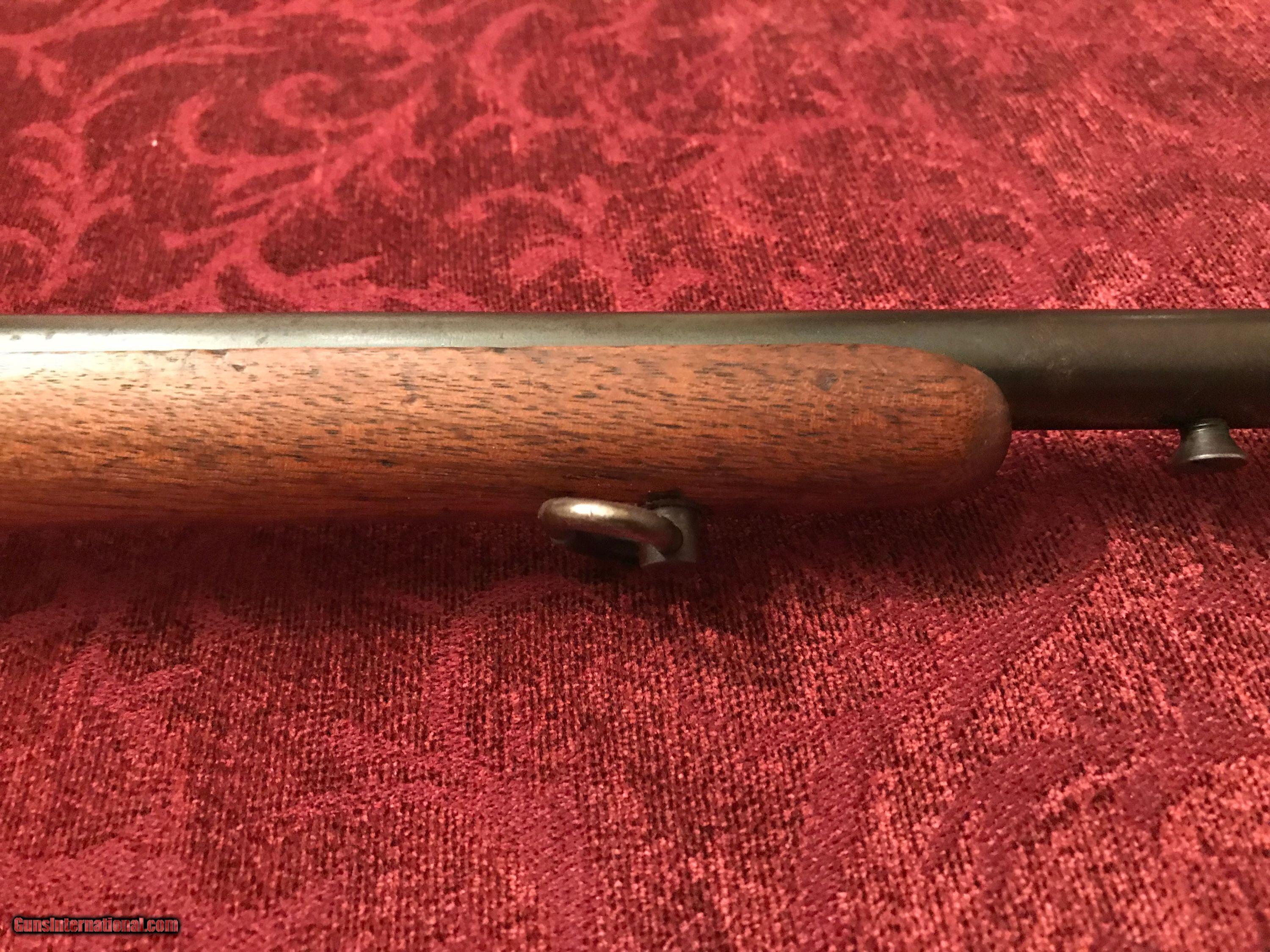 Description: Remington 4S “Military Model” Rolling Block .22 short and long training rifle. Mfg. 1913-1923. These were thought to be bought by private military academies for young boys. 28” round barrel with musket type forend. Bayonet stud on barrel. Folding front sight with a folding rear ladder sight. The rifle is in approximately 60+% condition. There’s one small split in the butt stock on the right side (see picture). It’s solid with no signs of weakness. Some old corrosion at end of barrel but overall not bad. The bore is dark but serviceable. Overall this little musket rolling block is a nice example of a hard to find rifle. SOLD Curio/Relic: Yes Manufacturer: Remington Model: 4S Military Model Rolling Block Caliber Info: .22 short or long Manufacture Date: 1913-1923 |