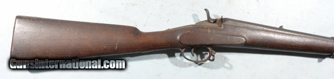 Description: SCARCE BELGIAN FLOBERT ROLLING BLOCK 7.5 MM RIMFIRE CADET MUSKET CIRCA 1870’S. 43” o/a with 28” round barrel with Liege black powder proofs at the left breech. Full length walnut stock. All original including the ramrod. Very good overall with dark patina, surface rust and blue mixed. Working order. Type sold to military schools in the latter part of the 19th Century. Seldom seen form of Flobert. Will clean up considerably. SOLD Antique: Yes |