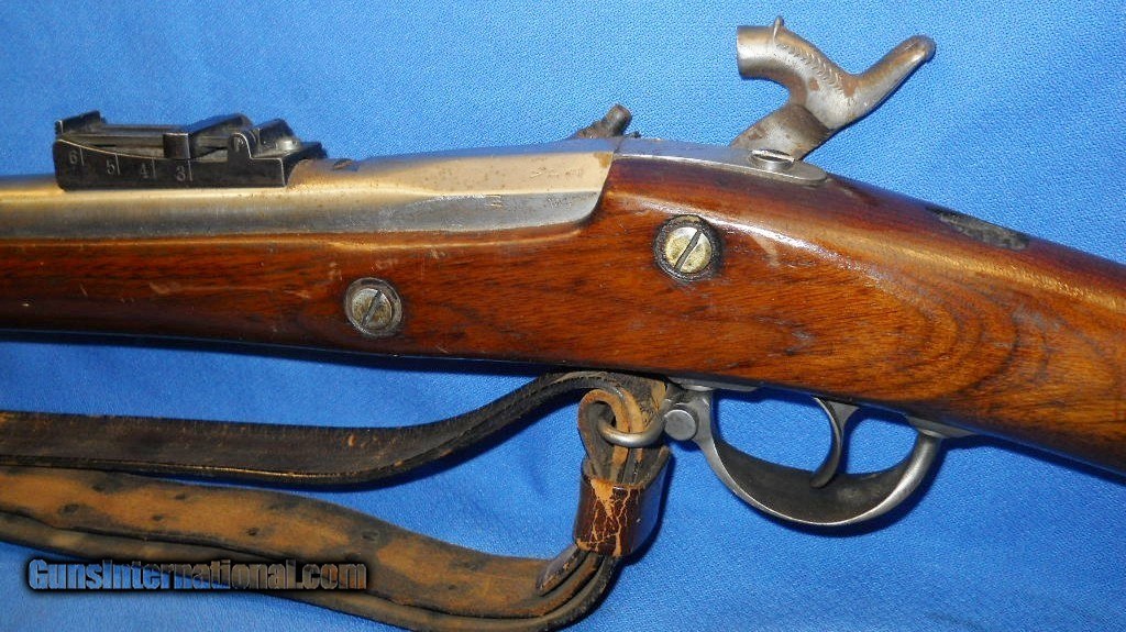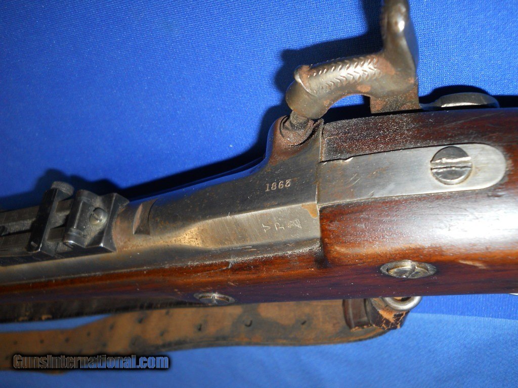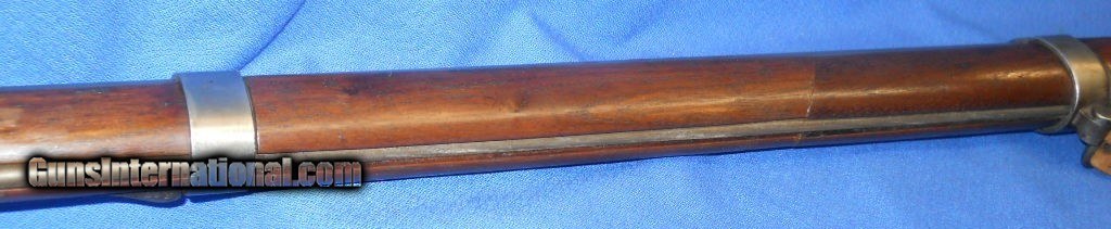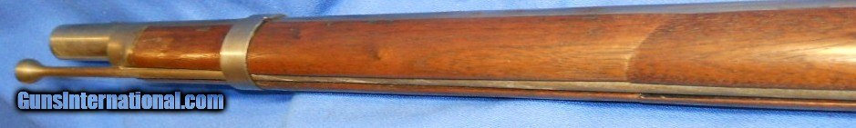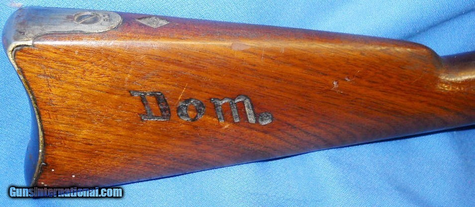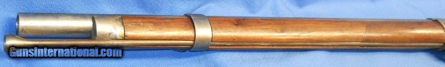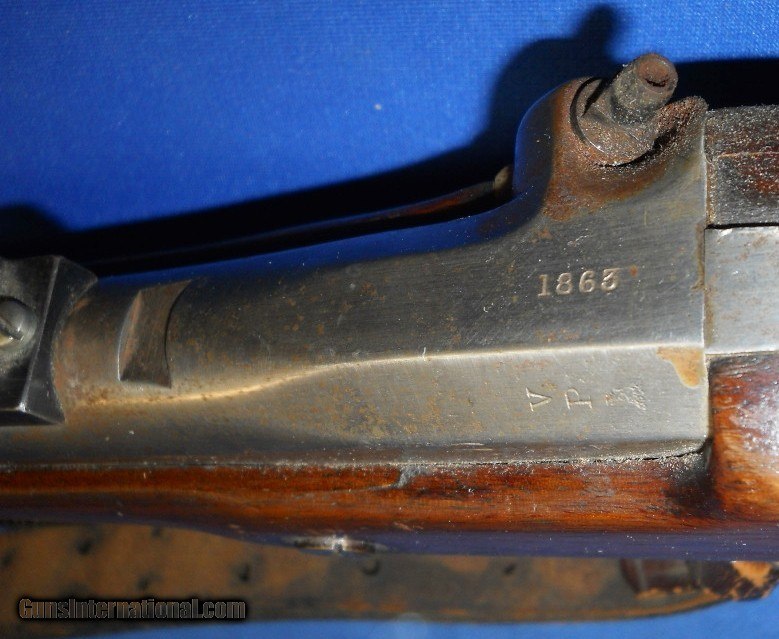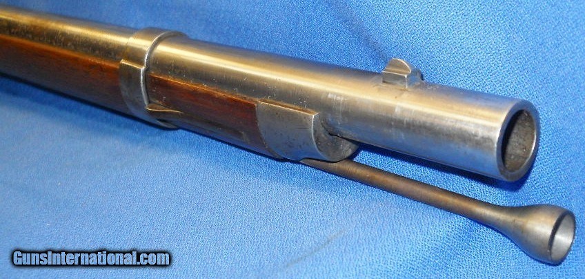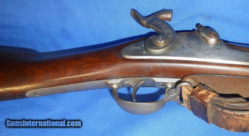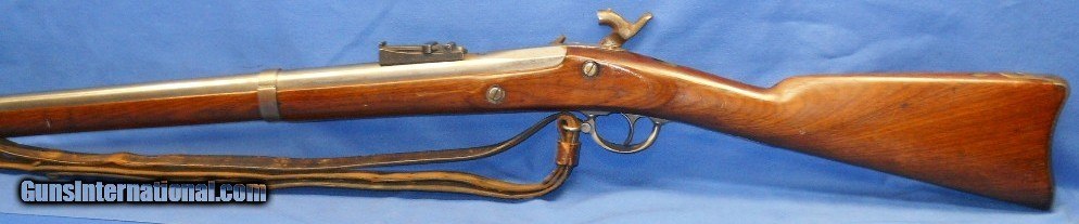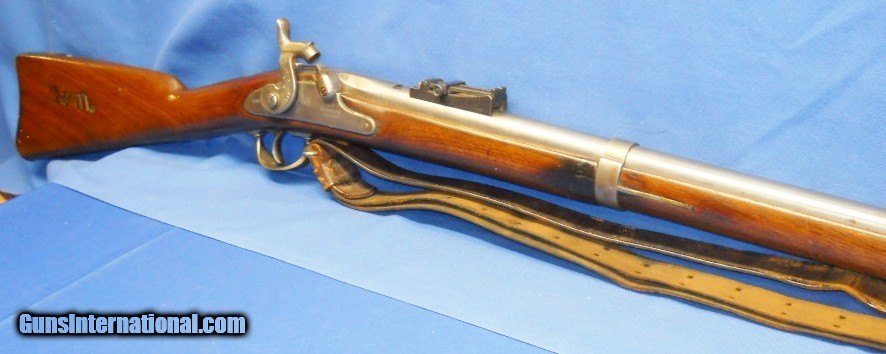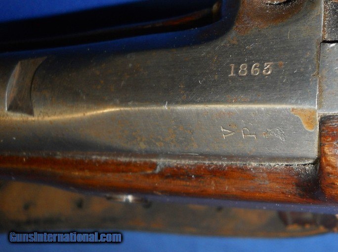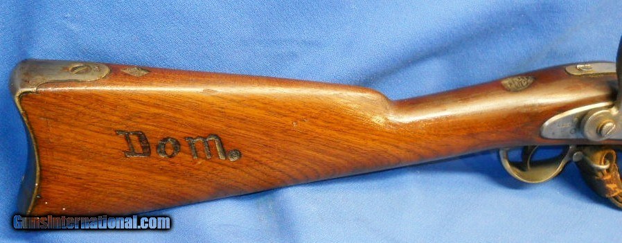 Description: ANTIQUE U.S. CONTRACT MODEL 1861 PERCUSSION RIFLE BY WILLIAM MASON, TAUNTON, MA. WITH CORRECT 1863 DATED LOCK & BARREL. .58 CALIBER, VERY GOOD BORE, DISTINCT RIFLING TO MUZZLE. SMOOTH BRIGHT METAL SURFACES OVERALL. WALNUT STOCK PERIOD CARVED "DOM." ON RIGHT SIDE. FOREND PIECED FORWARD OF MIDDLE BAND. TWO SPOTS ON TOP OF STOCK THAT POSSIBLY HELD INLAYS AT SOME POINT ? THIS RIFLE IS IN EXCELLENT WORKING ORDER WITH CRISP, ROBUST LOCK. LIKELY WOULD MAKE A REAL GOOD SHOOTER IF WANTED. EQUIPPED WITH OLD MILITARY STYLE LEATHER SLING AS PICTURED. SHIPS DIRECT TO BUYER ANYWHERE THAT'S OK. S&H $50.00 EAST OF THE BIG RIVER $60.00 BEYOND. SOLD Antique: Yes Manufacturer: WILLIAM MASON Model: 1861 Caliber Info: .58 Bore: STRONG RIFLING Condition: VERY GOOD AS PICTURED Wood Condition: AS PICTURED Bore Condition: VERY GOOD, BRIGHT Stock: WALNUT |