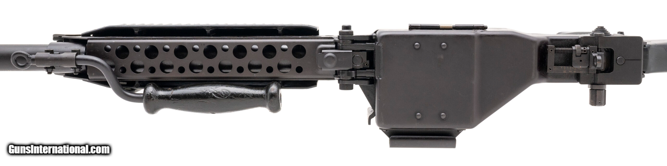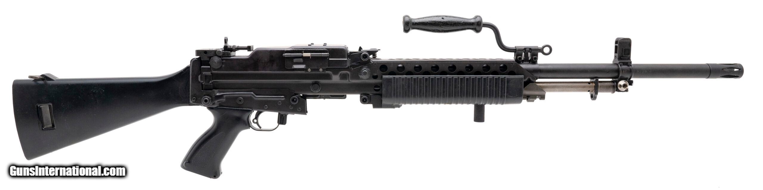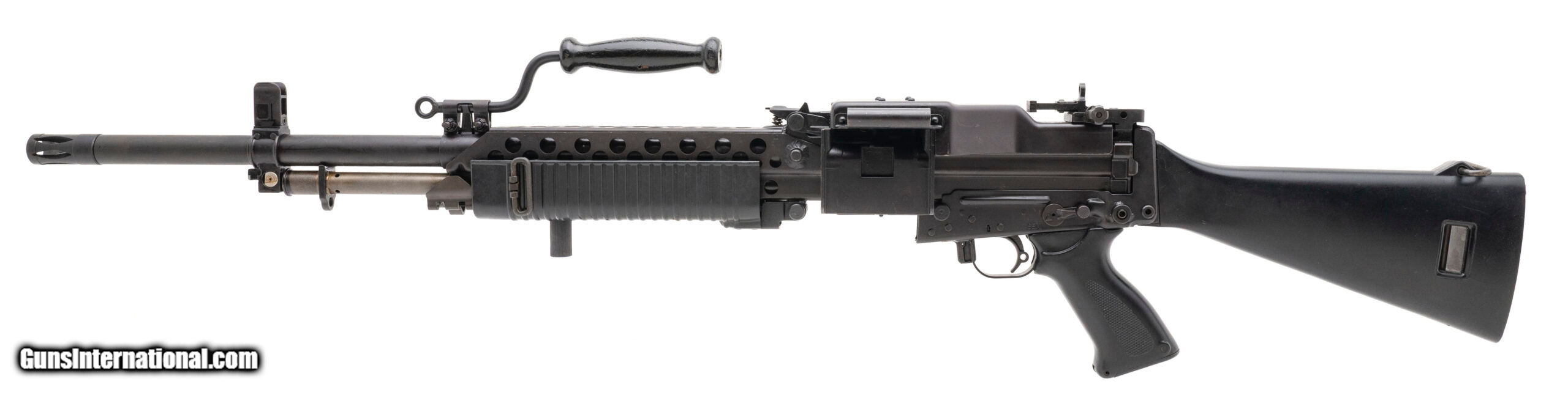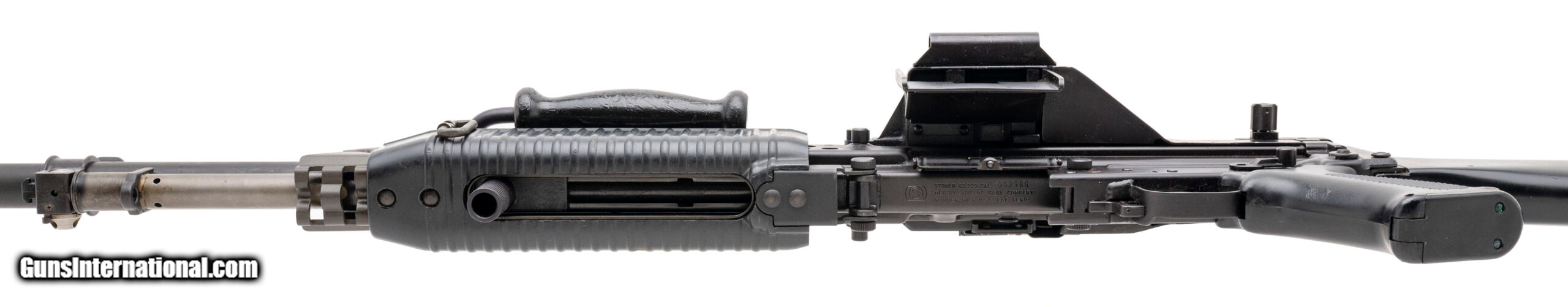 Description: "SN: SN002988, made in 1967, 5.56x45mm, 20-inch round heavy barrel. This version of the Stoner 63 was made by Cadillac-Gage in Warren, Michigan as an open bolt light machine gun that feeds from a belt of metallic disintegrating links in the full-auto mode only. Overall condition is excellent, and the barrel has a bright bore that reveals strong visible rifling. Original buttstock is included but the rubber butt pad is cracked and broken. Comes with 150 USGI M27 metallic disintegrating links. This is a non-transferable Pre-86 Dealer sample and must be sold to an FFL with SOT SOLD |