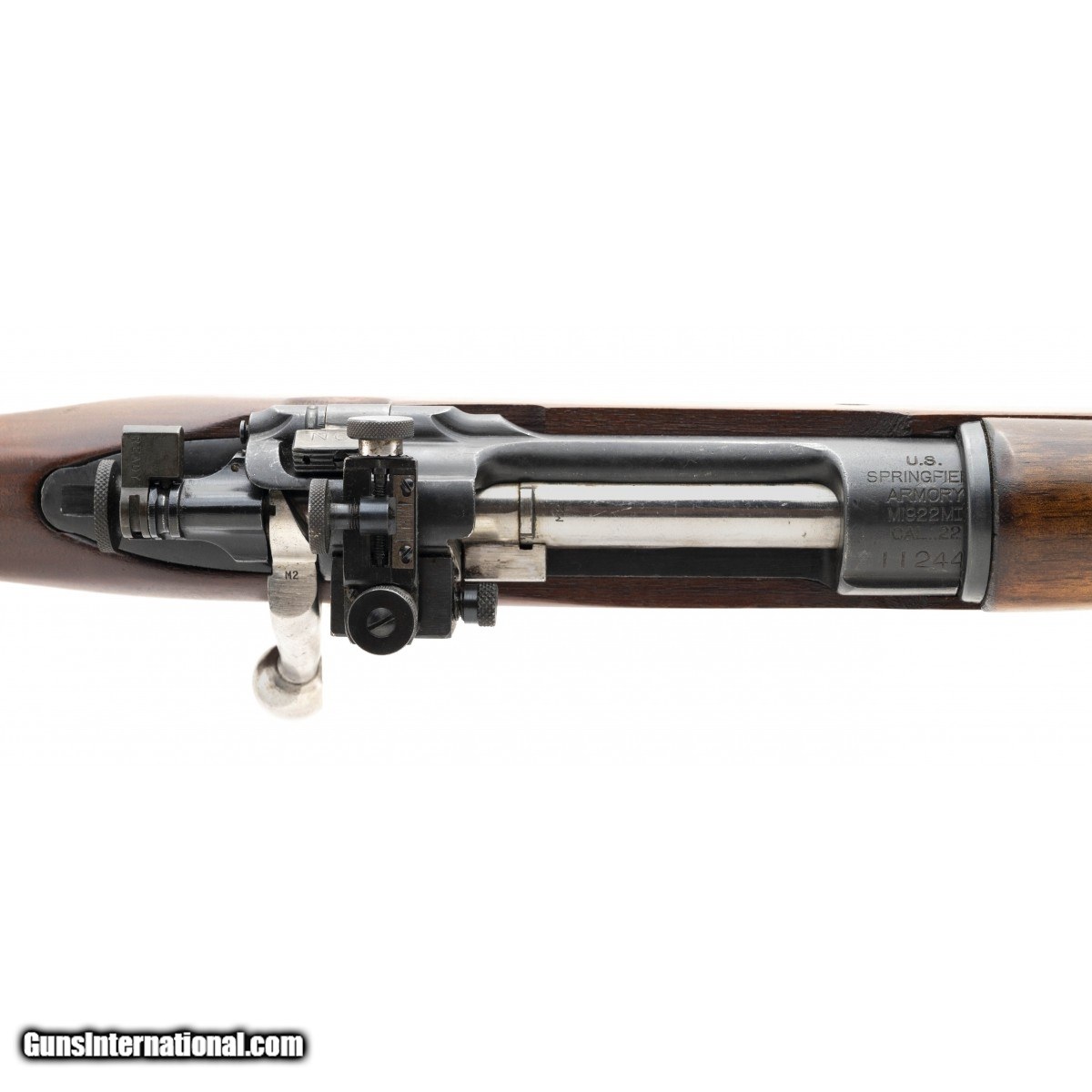 This circa 1927 U.S. Model 1922 MI rifle was upgraded to M2 configuration in 1938. It has the adjustable head space M2 bolt and bolt body, M2 magazine, and 10 - 38 M2 barrel. In addition, it is mounted in a full length Model 1903A3 style C pistol grip stock which has been correctly modified for the M2 magazine assembly. The bore is excellent with bright strong, rifling. The left side of the barrel at the chamber is marked LONG RIFLE over CART'GE ONLY. The front sight is a Lyman style hooded for interchangable discs and the rear sight is a Lyman 48. The barrel, trigger housing, bands, and butt plate have approx. 98% parkerized finish. the receiiver and magazine have approx 95% military blue finish. The bright bolt is excellent. The sling swivels are preaent and the stacking swivel is absent. The stock is exellent with minor storage dings and finish mars around the pistol grip. The action functions correctly. Many early taget shooters modified 1922 rifles into the service rifle configuration like this one. This is a great example for your collection or for target shooting.