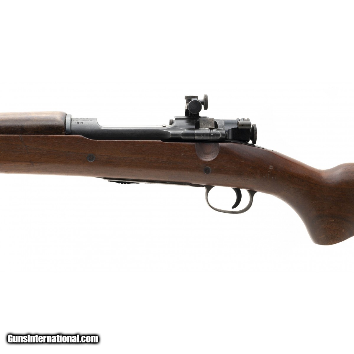 Description: " This circa 1927 U.S. Model 1922 MI rifle was upgraded to M2 configuration in 1938. It has the adjustable head space M2 bolt and bolt body, M2 magazine, and 10 - 38 M2 barrel. In addition, it is mounted in a full length Model 1903A3 style C pistol grip stock which has been correctly modified for the M2 magazine assembly. The bore is excellent with bright strong, rifling. The left side of the barrel at the chamber is marked LONG RIFLE over CART'GE ONLY. The front sight is a Lyman style hooded for interchangable discs and the rear sight is a Lyman 48. The barrel, trigger housing, bands, and butt plate have approx. 98% parkerized finish. the receiiver and magazine have approx 95% military blue finish. The bright bolt is excellent. The sling swivels are preaent and the stacking swivel is absent. The stock is exellent with minor storage dings and finish mars around the pistol grip. The action functions correctly. Many early taget shooters modified 1922 rifles into the service rifle configuration like this one. This is a great example for your collection or for target shooting. SOLD |