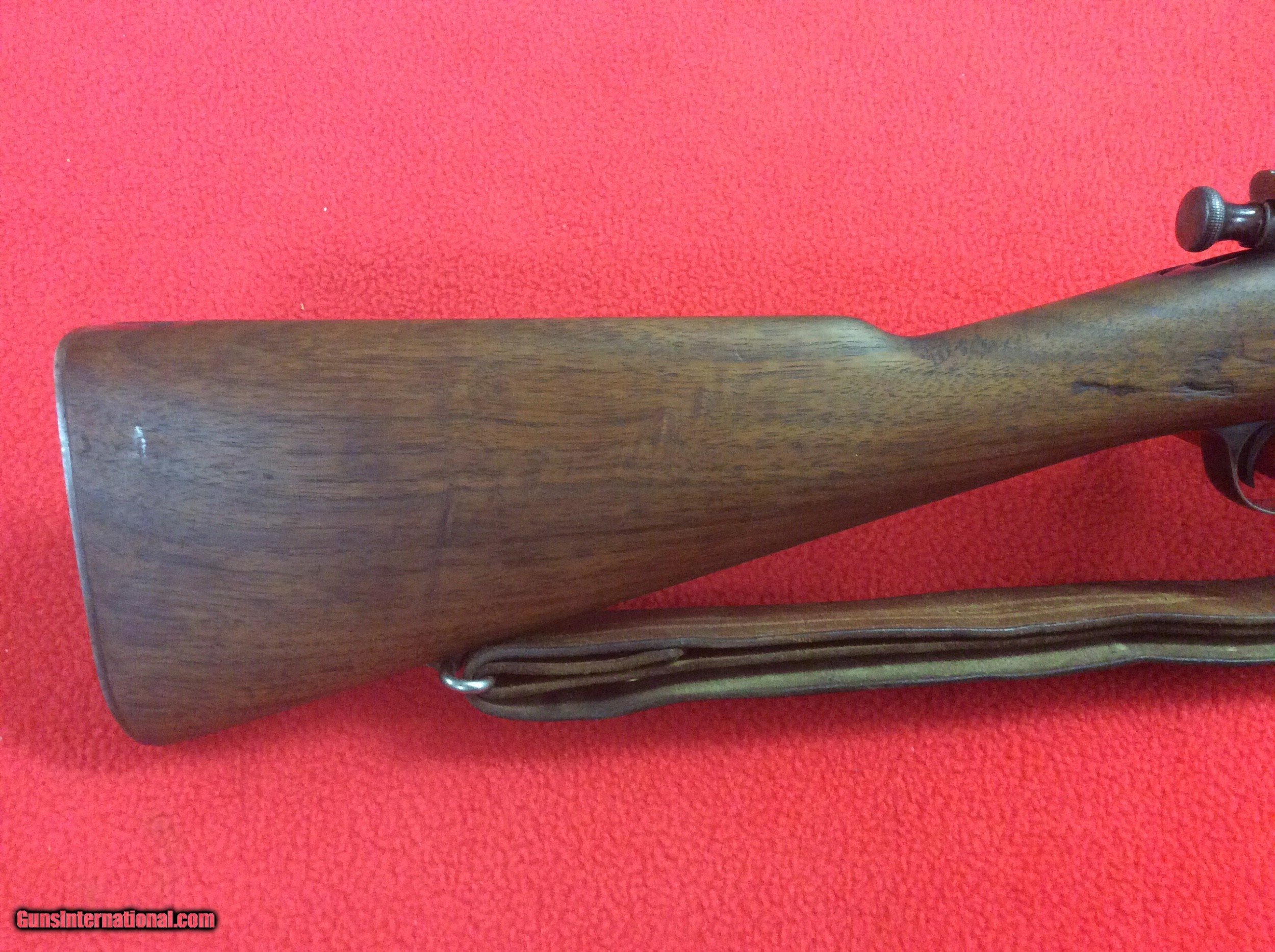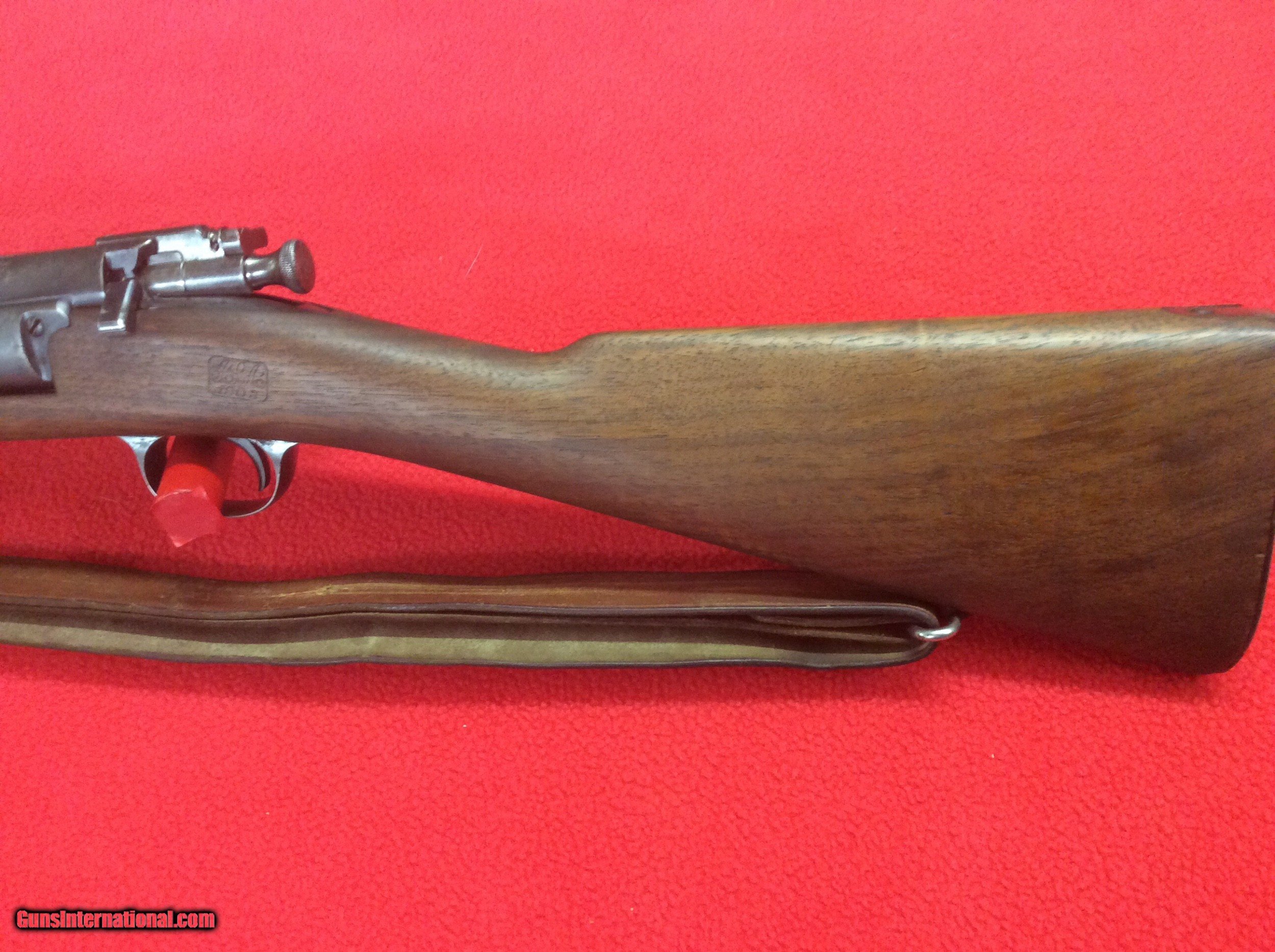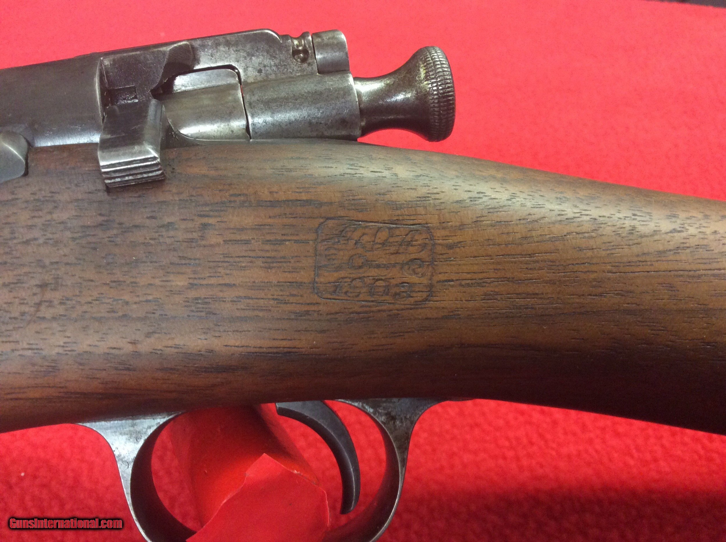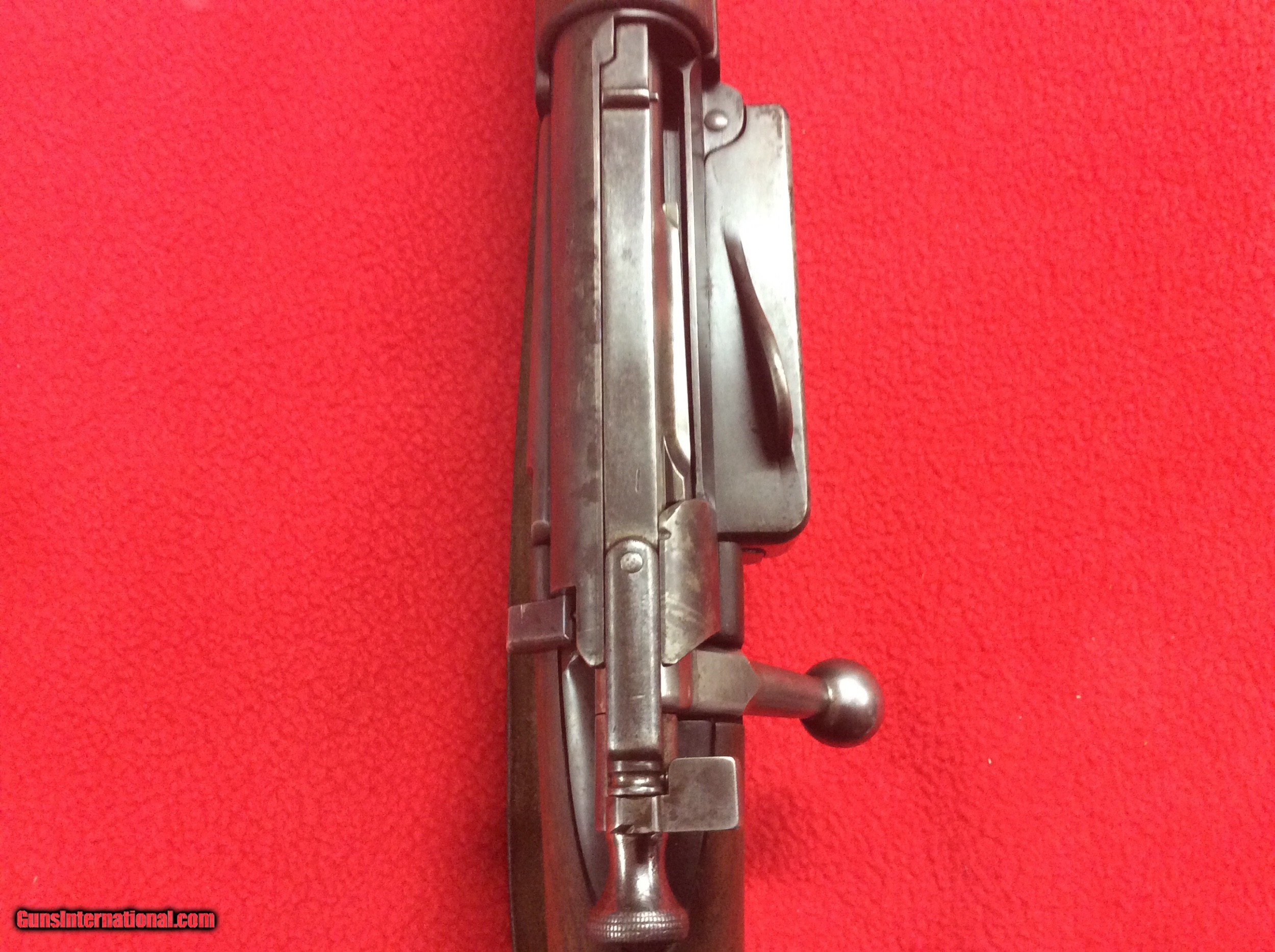 Description: FOR YOUR VIIEWING IS A EXCELLENT CONDITION 1898 KRAG JORGENSEN MILITARY RIFLE. VERY VIVID CARTOUCH DATED 1903.SERIAL NUMBER 445XXX. CIRCLE P UNDERSIDE OF STRAIGHT GRIP. ALL ORIGINAL MINT STOCK WITH ONLY ONE BLEMISH ON RIGHT SIDE OF STRAIGHT GRIP. COLOR CASE STILL SHOWING ON LODING BOX AND RECEIVER. BARREL HAS STRONG RIFLING. SOME EXTERIOR PITTING ON THE EXPOSED PORTION OF THE BARREL. I BELIEVE THE SLING IS A REPLACEMENT. THIS RIFLE HAS BEEN SITTING FOR DECADS IN A COLLECTION AND HAS BEEN WELL TAKEN CARE OF. NO RUST OR CORROSION OTHER THEN DESCRIBED. EXCELLENT SPECIMEN OF A EARLY MILITARY RIFEL FROM THE TURN OF THE LAST CENTUARY. CALL OR EMAIL FOR MORE INFO ETC. THANKS FOR LOOKING SOLD |