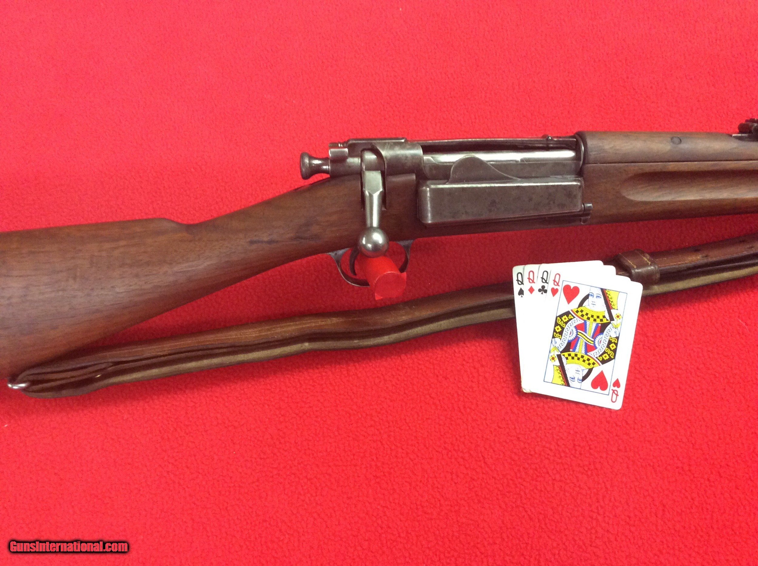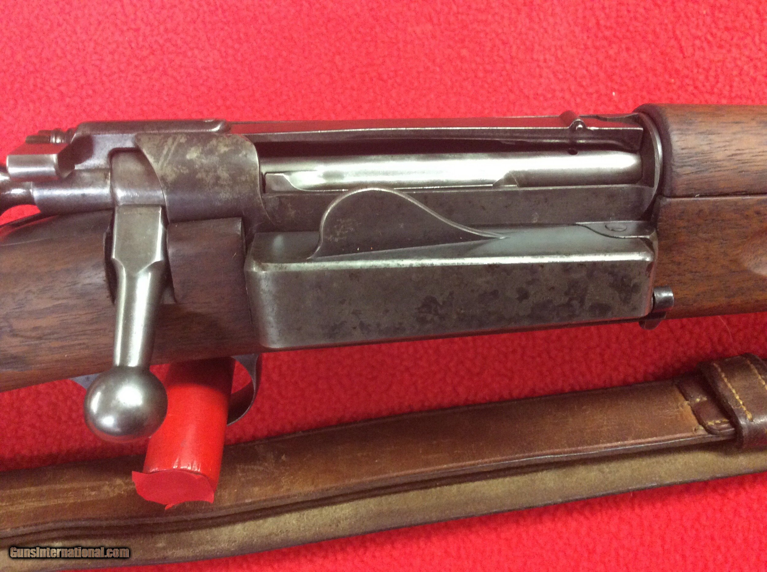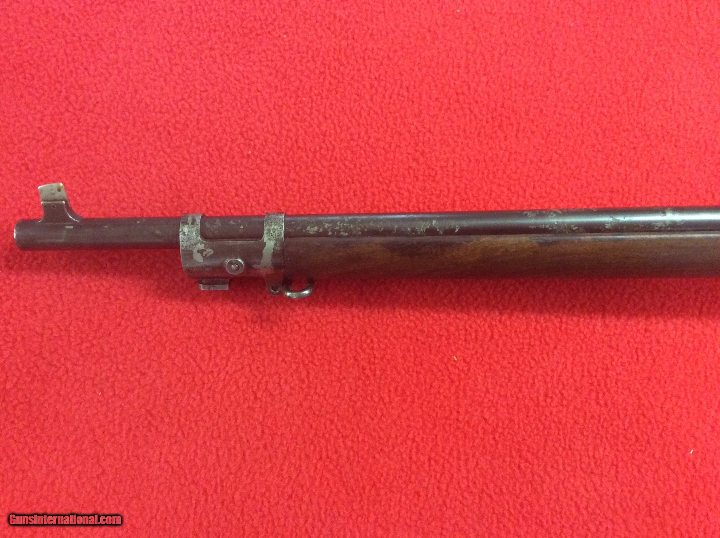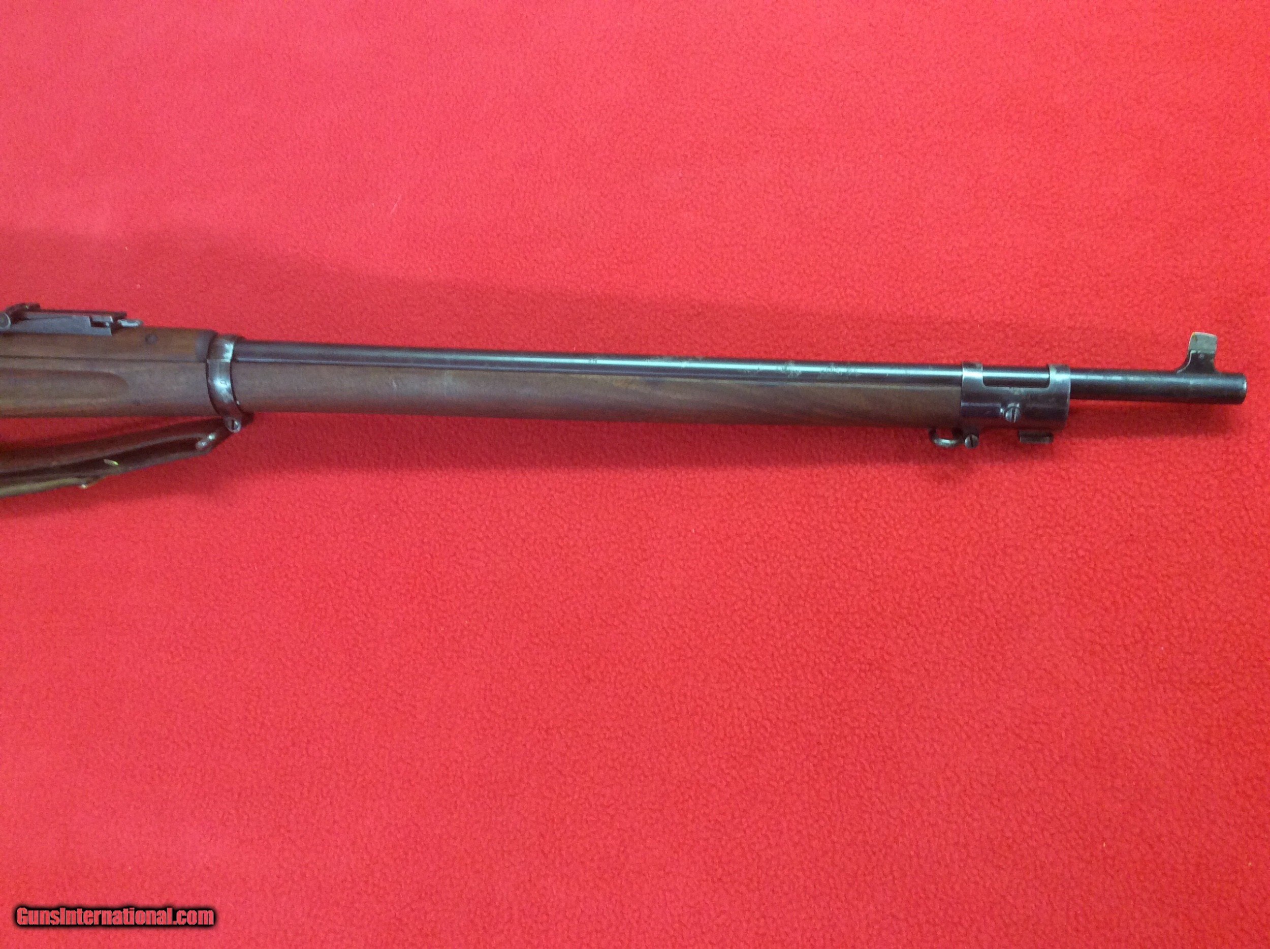 Description: FOR YOUR VIIEWING IS A EXCELLENT CONDITION 1898 KRAG JORGENSEN MILITARY RIFLE. VERY VIVID CARTOUCH DATED 1903.SERIAL NUMBER 445XXX. CIRCLE P UNDERSIDE OF STRAIGHT GRIP. ALL ORIGINAL MINT STOCK WITH ONLY ONE BLEMISH ON RIGHT SIDE OF STRAIGHT GRIP. COLOR CASE STILL SHOWING ON LODING BOX AND RECEIVER. BARREL HAS STRONG RIFLING. SOME EXTERIOR PITTING ON THE EXPOSED PORTION OF THE BARREL. I BELIEVE THE SLING IS A REPLACEMENT. THIS RIFLE HAS BEEN SITTING FOR DECADS IN A COLLECTION AND HAS BEEN WELL TAKEN CARE OF. NO RUST OR CORROSION OTHER THEN DESCRIBED. EXCELLENT SPECIMEN OF A EARLY MILITARY RIFEL FROM THE TURN OF THE LAST CENTUARY. CALL OR EMAIL FOR MORE INFO ETC. THANKS FOR LOOKING SOLD |