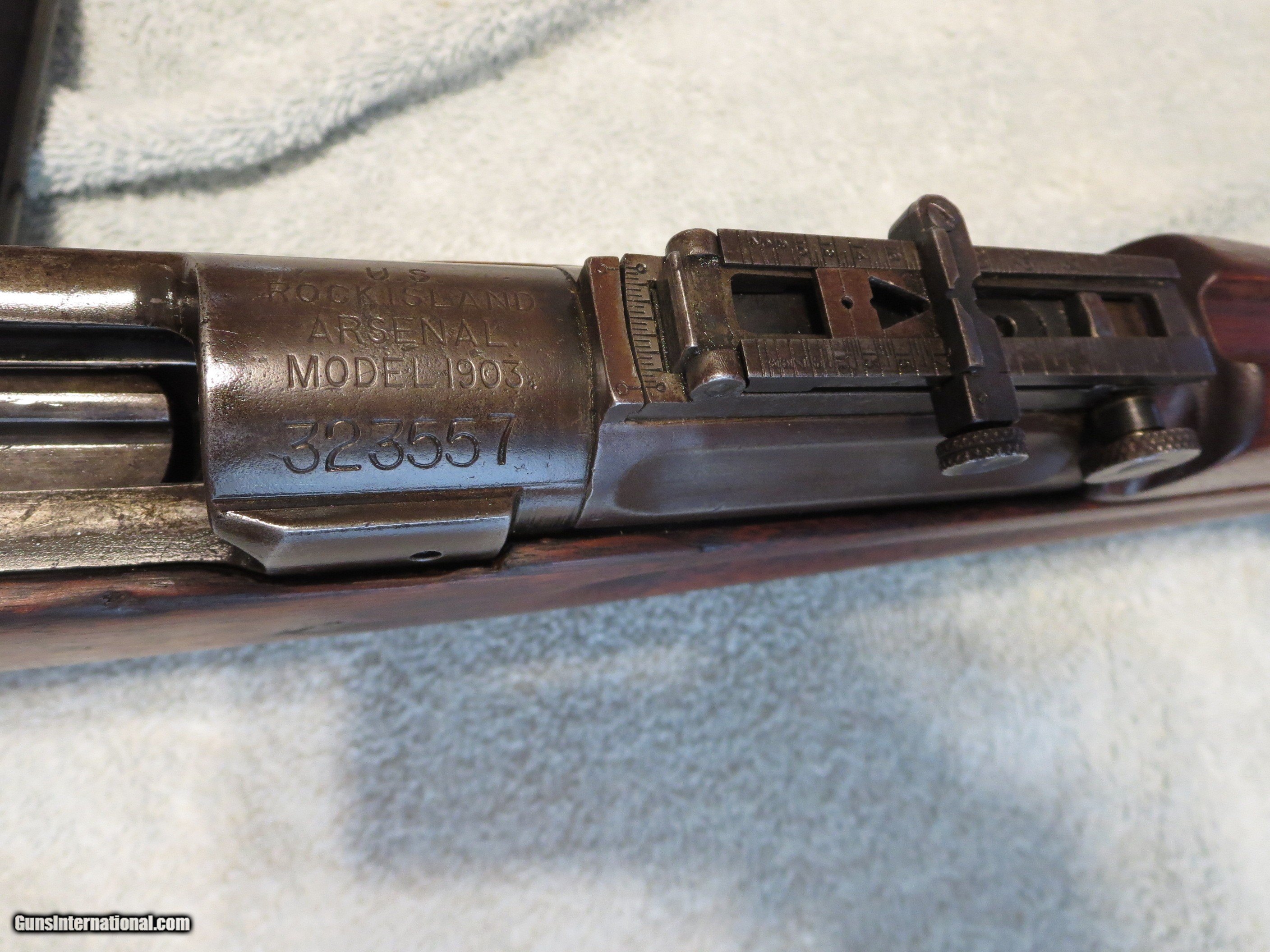 Description: SALE PENDING For Sale: 1908 Rock Island Arsenal M1903 rifle in 30-06 caliber. An arsenal rework has replaced the original barrel with a Springfield Armory barrel dated 10-30. The bore is a 4 groove rifling in excellent condition. The stock is in good condition with normal wear for its age. The photos show the condition of the rifle. A great collector's piece. It is a very accurate shooter. Functions perfectly. Simple and honest layaway plans available. SOLD Rifle Caliber: .30-06 Springfield Manufacturer: Rock Island Arsenal Model: M1903 Serial Number: 323557 Condition: Excellent Wood Condition: Good Bore Condition: Great Manufacture Date: 1908 |
