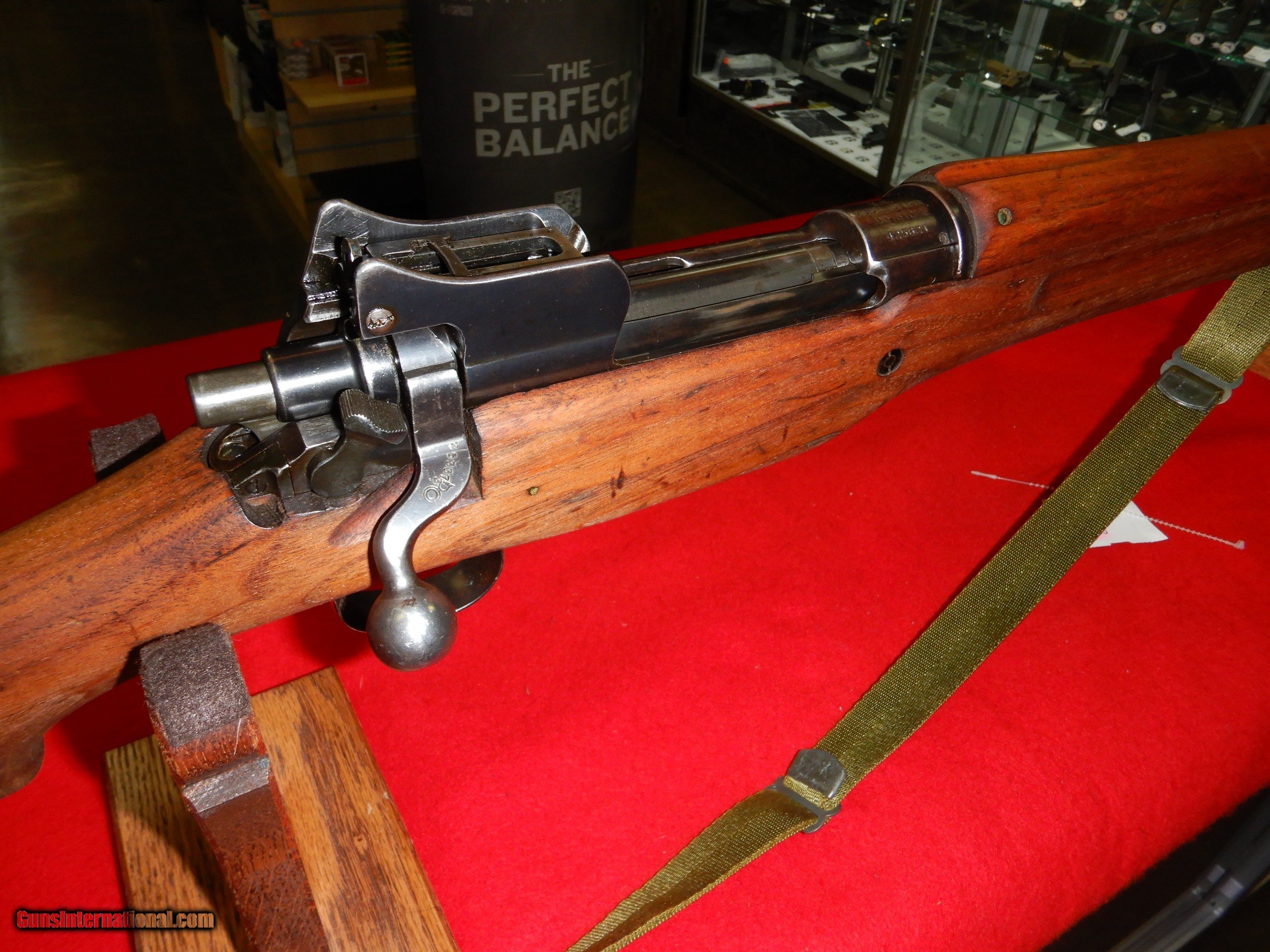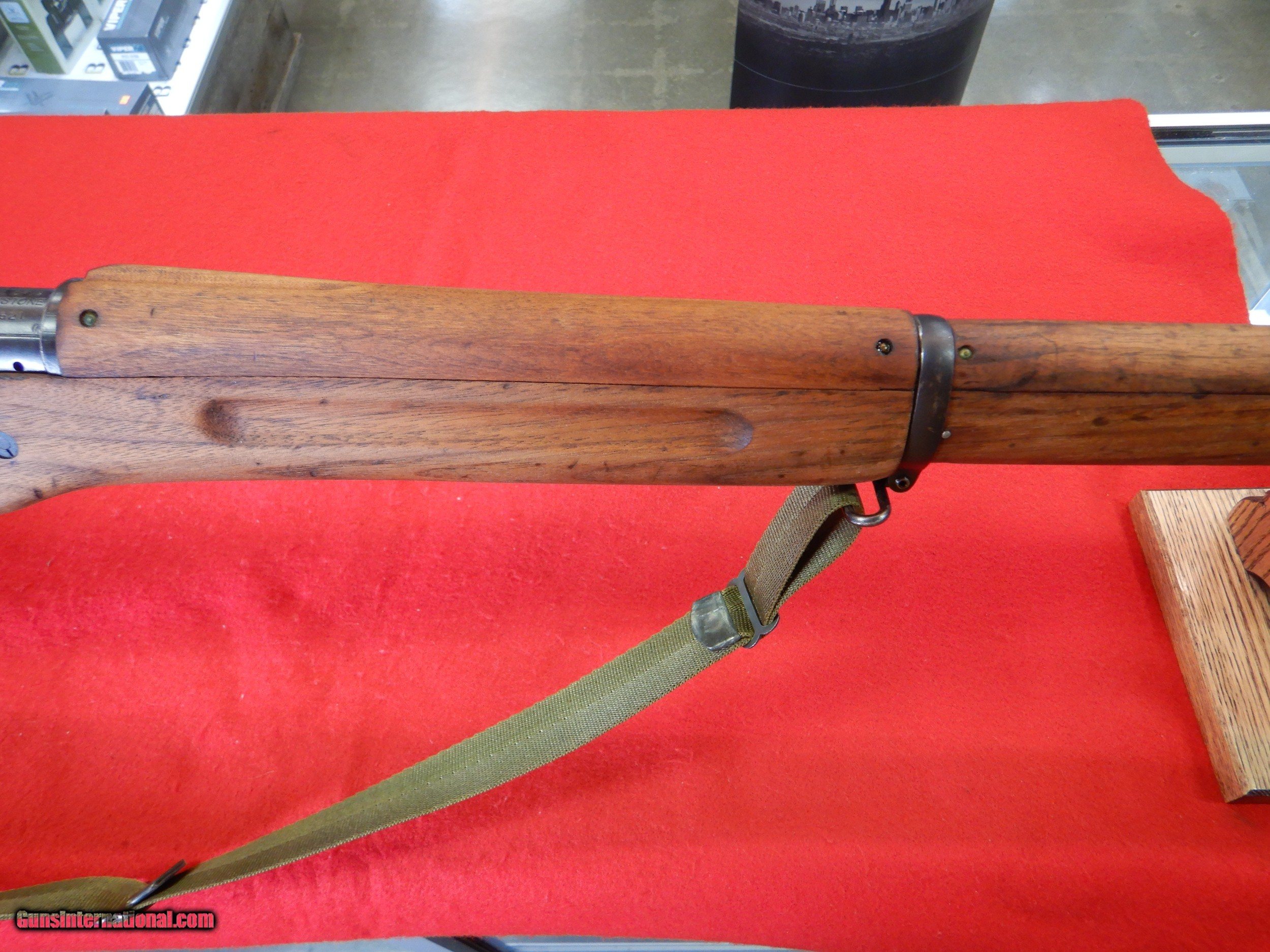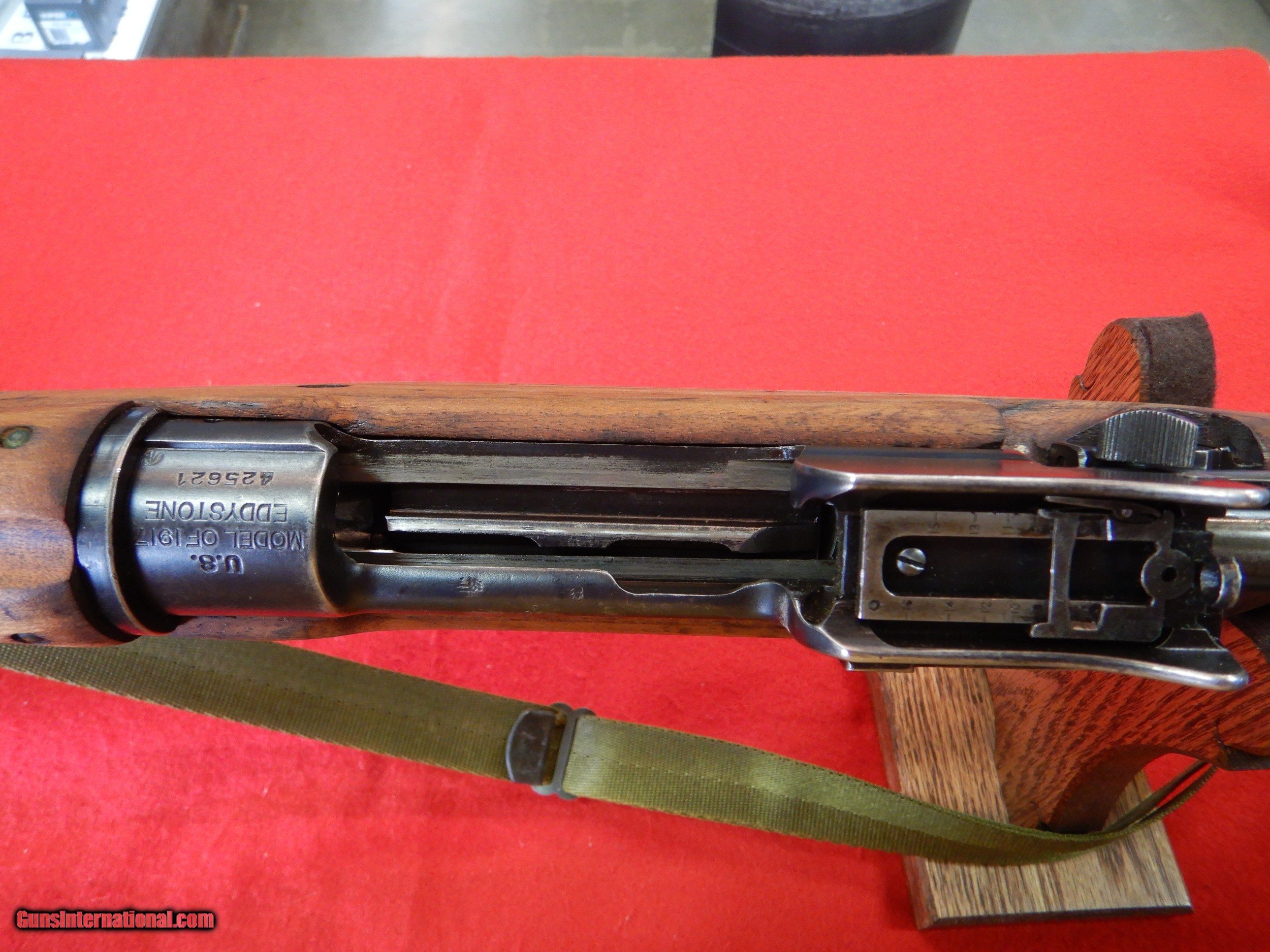 Description: WE HAVE A VERY NICE, PRE-OWNED, U.S. EDDYSTONE 1917 BOLT ACTION RIFLE IN .30-06 SPRINGFIELD, SPECS ARE AS FOLLOWS; EDDYSTONE MODEL 1917 RIFLE The U.S. Rifle, caliber .30 M1917 (often called the Enfield or P-17) is one of the most misunderstood and neglected of United States Service Rifles. For many years the M1917 has been basically ignored by collectors and shooters in favor of its more popular cousin, the M1903, usually called the “Ought Three” or Springfield (even though produced by both Springfield Armory and Rock Island Arsenal). Here I will attempt to give you some insight into the thinking and usage of one our most prolific and combat used battle rifles of WWI. First, we should know the intricacies and the growing pains of our main (or at least most used) service rifle of The Great War, and why in the final analysis it was not adopted as our principle service arm. Let’s start with the rifle itself and its attributes. Nomenclature of The M1917 Rifle: The U.S. Rifle has been often called the Enfield, or the P-17. While both of these conjure up a vision of the same rifle, technically neither is correct in military terms. Officially, the .30-’06 version of the British design is known as: The United States Rifle, caliber .30, M1917 and is described as a breech loading rifle of the bolt type. It is sometimes called the Enfield rifle (extracted from the War Department Basic Field Manual 23-6), since it was developed at the Royal Small Arms Factory located at Enfield Lock, in Middlesex and located approximately 11 miles north of London Bridge on the outskirts of London. M1917 Principal Dimensions, Weights and Miscellaneous Data are: Weight, without bayonet 9.187 lbs. Weight with bayonet 10.312 lbs. Length without bayonet 46.3 inches Length with bayonet 62.3 inches Diameter of bore .30 inches Trigger Pull, minimum 3.0 pounds Rifling: Number of grooves 5 Twist (uniform) 1 turn in 10 inches (left hand twist) Sight Radius 31.76 inches (31.69 inches using battle sight) Battle Sight Set at 400 yards Magazine Capacity 6 rounds (compliments of using a rimless cartridge in a magazine designed for the rimmed .303 British round) **BUYER PAYS SHIPPING AND INSURANCE** SOLD Rifle Caliber: .30-06 Springfield Manufacturer: EDDYSTONE Model: 1917 Serial Number: 425621 Barrel Length: 26 Condition: EXCELLENT Metal Condition: EXCELLENT Wood Condition: EXCELLENT Bore Condition: EXCELLENT |