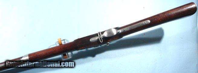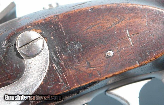 Description: CIVIL WAR NEW HAMPSHIRE MARKED A. WATERS U. S. MODEL 1816 PERCUSSION CONVERSION MUSKET CA. 1860-61. .69 cal. 42” smoothbore barrel. 100% original and as issued to the last screw and in fine plus condition. Lock plate stamped “U.S./A. WATERS” and “MILBURY/1836”. Barrel dated on tang “1836”. Breech stamped “US/JM/P” and “NEW HAMPSHIRE”. Fine metal with crisp grey original patina. Excellent markings. Stock with nearly all the original finish and excellent “LS” script cartouche. Working order and very good bore. Really nice example and rare with the New Hampshire marking. SOLD Antique: Yes |