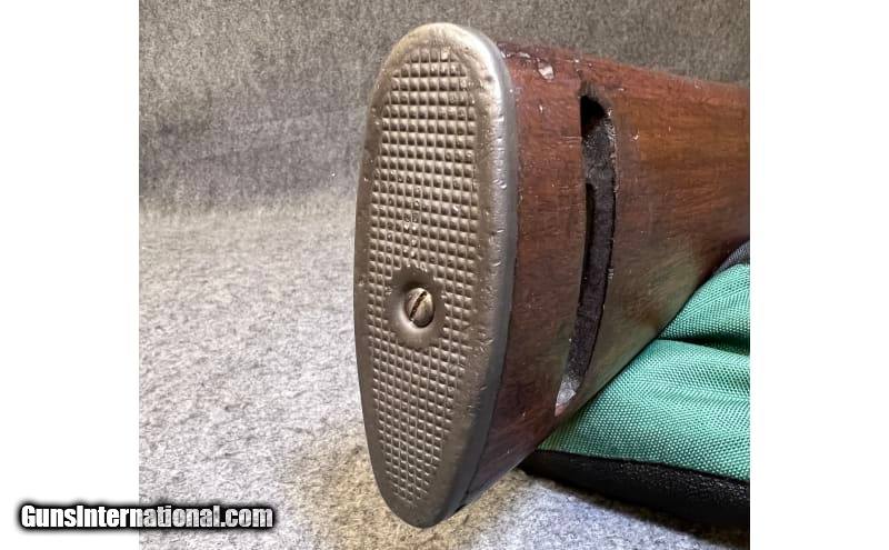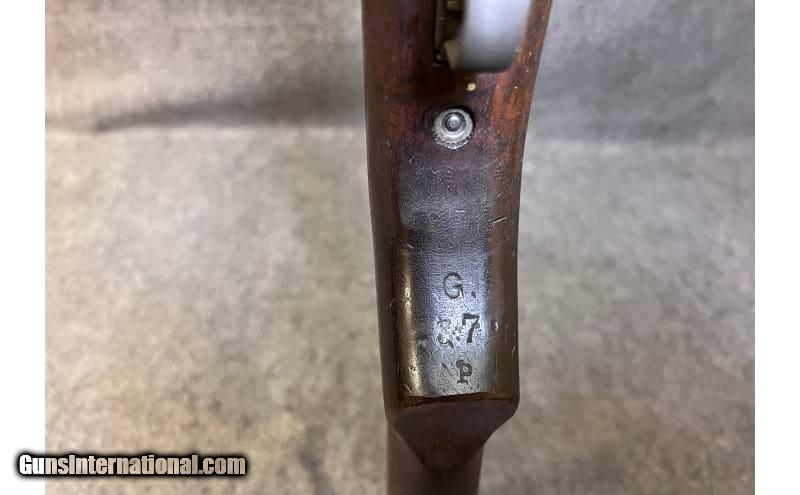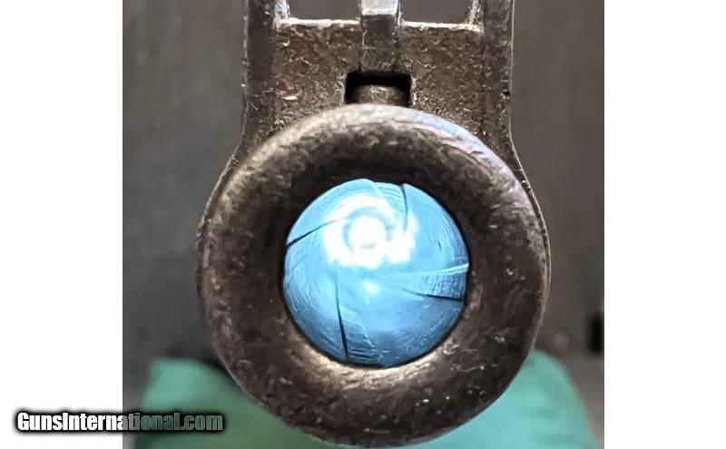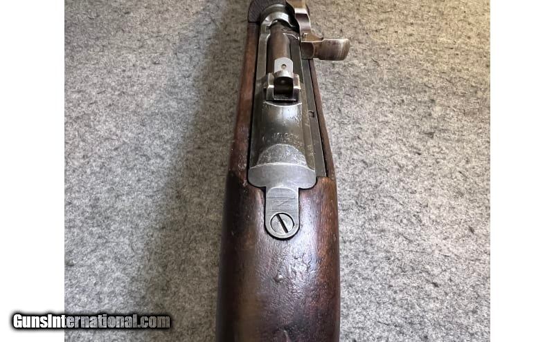 Description: This 1944 World War II semi-auto rifle is an IBM M1 U.S. Carbine chambered in .30 Carbine. It has a fixed front sight with protective sides, a dovetailed flip aperture rear sight, a checkered steel butt plate, no bayonet lug, and a sling loop at the top. The front sight is marked SI B (Simpro Mfg Co). The underside of the pistol grip has a "G" "37" and a "P" stamped in the wood. The push button safety and the magazine release are both marked "EPB" which are IBM marks. The barrel is not marked with a date. The sling well is marked with a "J." It has a great patina overall. It is in generally good condition metal and furniture. The bore is very bright and shiny with no noticeable pitting, and with very strong rifling. It comes with a single 15 round magazine. IBM manufactured approximately 346,500 M1 Carbines, making this firearm relatively rare. This .30 caliber semi-automatic rifle was first used by the United States Armed Forces on October 22, 1941, but IBM began its production of this firearm in October 1943 and ended in May 1944 having manufactured the M1 Carbine for only eight months. Despite having a similar name and appearance, the M1 Carbine is not a carbine version of the M1 Garand rifle. They are different firearms and use different ammunition. Prior to World War II, U.S. Army Ordnance received many reports that the full-size M1 Garand was too heavy and cumbersome for most support troops, such as mortarmen and radiomen to carry, so the M1 U.S. Carbine was designed to fulfill the request for a compact, lightweight defensive weapon with greater range, accuracy and firepower than handguns. .30 Carbine SOLD Curio/Relic: Yes Metal Condition: Great patina with no noticeable rusting Wood Condition: Super patina in generally good condition Bore Condition: "Very bright and shiny with no noticeable pitting, but with very strong rifling Barrels: 18" I.B.M. CORP. Barrel Triggers: Factory Stock Dimensions: 35¾" overall length Fore End: Smooth grip two piece hardwood Butt Pad: Checkered steel butt plate Weight: 5 lb 1 oz Sights: "Fixed front sight with side protectors, dovetail adjustable rear peep sight Item Location: Wichita, KS |