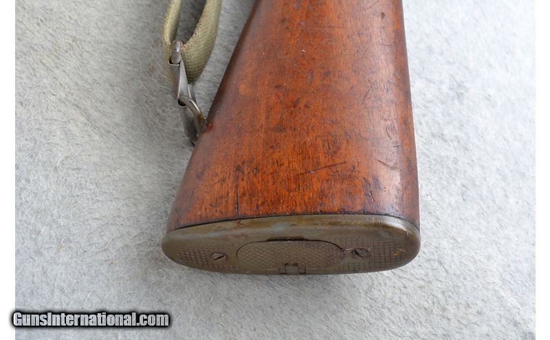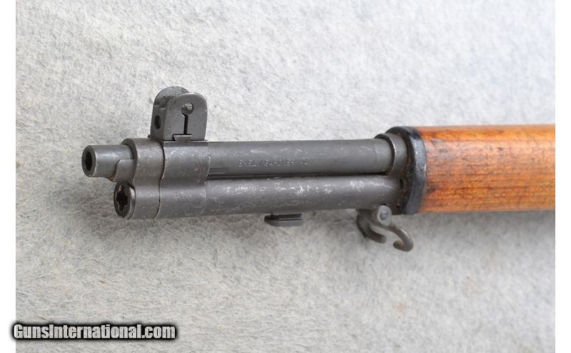 Description: This International Harvester Model U.S. Rifle M1 Garand is a right hand semi-auto U.S. Military rifle in .30-06 Sprg. Cal. It has a 24 inch barrel. A blade front sight with protective sides and an adjustable aperture rear sight. The butt stock is a smooth grip hardwood pistol grip. The forearm is a smooth grip two piece hardwood. It comes with a green cloth sling. Receiver Serial Number 5107506 (1954). The barrel is stamped S-A-3-52. The M1 Garand is still widely used by civilians for hunting, target shooting and as a military collectible. .30-06 Springfield SOLD Chambers: Semi-Auto 8 round en bloc clip internal magazine. Metal Condition: Very good. Barrel has some handling marks. Wood Condition: Fair. Many handling marks. Cracks both sides of butt stock at butt plate. Bore Condition: Very good. Barrels: 24 inch. Stock Dimensions: LOP 13 inches. Fore End: Smooth grip two piece hardwood. Butt Pad: Checkered steel plate with a trapdoor storage compartment. Weight: 10 lb. 2 oz. Sights: Blade front with protective sides. Adjustable aperture rear. Item Location: Richfield, WI |
