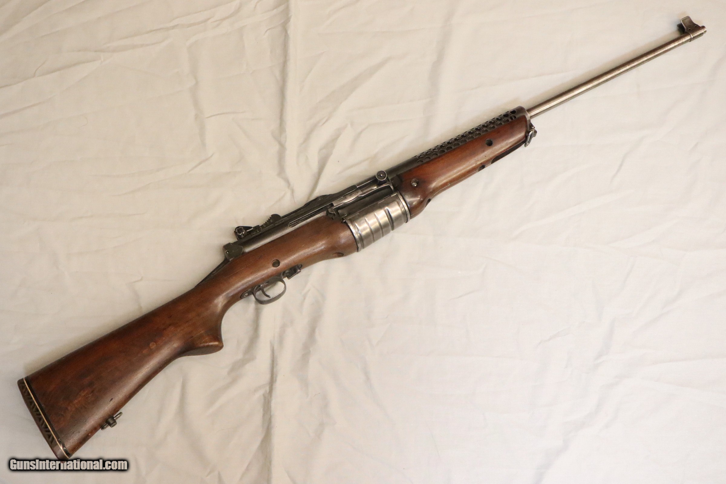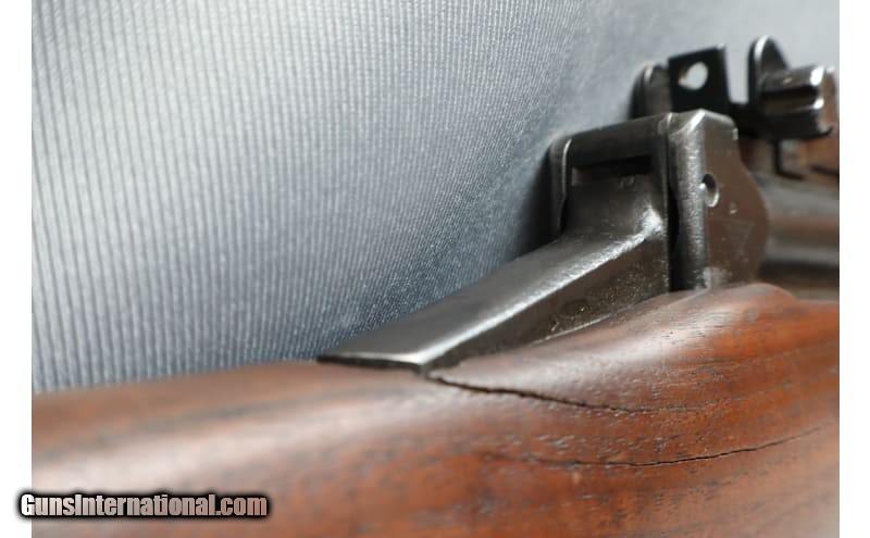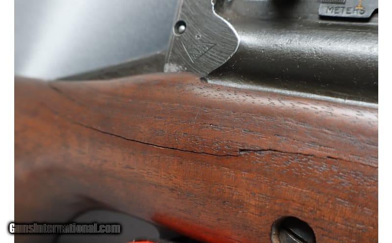 Description: This Johnson Automatic is a right handed, semiautomatic, rifle chambered in .30-06 Springfield. This Rifle is fed from a 10 round integral rotary magazine. This rifle has an aftermarket rubber butt pad. It has a glued crack in the forend and another crack in the stock towards the rear right of the receiver (see pictures above). This rifle does not have much remaining finish. The bolt reciprocates quite smoothly. .30-06 Springfield Curio/Relic: Yes Chambers: .30-06 Springfield Metal Condition: Poor Wood Condition: Poor Bore Condition: Good Barrels: 24 Weight: 10.3 lbs Sights: Adjustable Iron Sights Item Location: Missoula, MT Price: $3,951.99 Contact Seller |