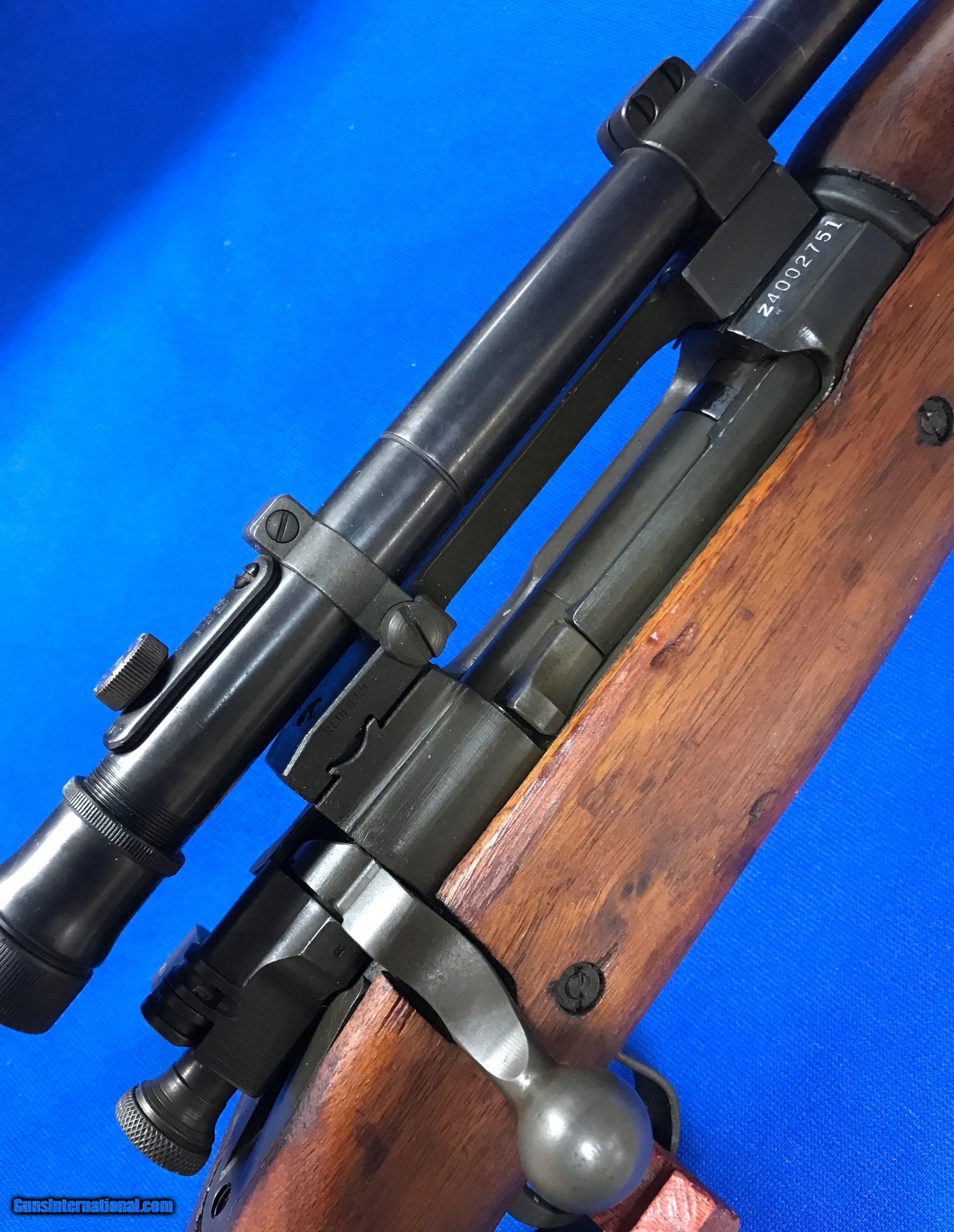 Description: SCARCE ‘’Z’’ PREFIX U.S. WWII REMINGTON MODEL 1903/A4 SNIPER Only 2,920 EVER MFG’d! SN Z4002751, BARREL ‘’RA 9-43’’, original barrel with mint bore gauging at only 1 1/2 with most matching Remington "R" marked parts. This 1903 A4 comes complete with original matching early "DMC" sales receipt. Shipped and re-arsenaled at Anniston Army Depot Anniston, AL. DCM document dated 1-99 (JANUARY, 1999). Original WWII ‘’RA, FJA, ORD WHEEL CARTOUCHED & ‘’CIRCLE P’’ PROOFED FULL-PISTOL GRIP STOCK! It is also ‘’AA’’ cartouches on the stock. NOTE: The full history of this sniper is on the ‘’DCM’’ document and stock markings. Original WWII ‘’M73B1’’ scope rings and Redfield base with factory targeting shims. ALL BEAUTIFUL! This rifle shows to be unfixed and unissued after leaving Anniston Army Arsenal storage. Book Reference: All book references will be from the (2) fine books by Peter R. Senich Book *We will list these in descriptions as Book #1 ‘’US Marine Corp Sniper-Scout World War II and Korea’’ OR Book #2 ‘’The Complete Book of U.S. Sniping’’! Reference examples in our descriptions will therefore be (Book #1 page 10) or (Book #2 page 10). The ‘’Z’’ Serial Number range went from only Z 4,000,000 to only Z 4,002,920! Also this Historical Sniper still not only retains it’s Factory original WWII ‘’RA 9-43’’ Barrel but even more remarkably, has a Mint Bore. RECEIVER MARKINGS: The front receiver ring is perfectly and correctly marked ‘’U.S. over REMINGTON over MODEL 03-A3’’. *FYI: A very Important FACT is that All Original Remington Model 1903A4 Snipers were marked exactly this way! The BIG distinction between a Model 1903A3 and a Model 1903A4 Sniper is the FACT that the markings on the Original Model 1903A4 Snipers were stamped Totally on the left side just above the stock and vent hole then the Serial Number of ‘’Z4002751‘’ was stamped totally on the far right side leaving a plain space ‘’gap’’ in the center of the top receiver! *WHY WAS THIS DONE ON ONLY THIS VARIATION? This special stamping arrangement left the Remington Factory room to install the ‘’Redfield’’ Sniper Scope Base and still be able to read all the Nomenclature and SN’s! The ‘’03-A3’’ markings were left just in case any intended Model 1903A4 Sniper did not it also appears to still have the majority of its Matching Remington ‘’R’’ marked parts including its Original Remington ‘’Sniper’’ Complete Bolt Assembly that is ‘’R’’ marked on not only its bolt handle arm but also on its Safety Housing and Safety Lever plus many other ‘’R’’ marked parts! WOOD SET: Also it still has an Original WWII Full-Pistol grip ‘’C’’ Stock that was un-questionably Factory Cut/Machined for the special ‘’Sniper Bolt’’! So Original is this stock that it still has its original faint but still visible Remington Factory 1943 Cartouche of ‘’RA, BOXED FJA, ORDNANCE WHEEL, CROSSED CANNONS’’! Also on the Pistol Grip front area is the original WWII Factory ‘’CIRCLE P’’ Proofing still partly visible plus totally intact, deep, sharp and clear are all the original Remington Factory Assembly Proofs on its lower forearm just in front of the trigger housing from 1943! NOTE: Another important Historical FACT, is that to further signify its most Historical Snipers past is the ‘’AA’’ Arsenal marking of Anniston Army Arsenal Anniston, AL and on the front Pistol Grip area is the Arsenal ‘’P’’ Proofing! ALL Arsenal markings are perfect! These all verify and Document the Snipers Historical past and from where it was Re-Arsenaled, Stored and an Arsenal finally shipped to its owner in January 1999. The Wood Condition simply shows expected storage/handling marks rates at appx. Arsenal excellent+ with both stock and hand guard matching nicely in all respects (wood, coloring, grain, fit, finish and tightness) all easily told to be original to each other! Also there are no repairs, cracks or messing with and all 3 pieces match perfectly in all respects all easily seen original to each other! PLUS this is indeed an original Full-Pistol Grip Remington Model 1903/A4 ‘’Sniper C’’ Stock easily seen not only by all the above, but also in the Remington Factory 1943 special machine cut out (not hand cut out) for the Sniper Bolt Handle! Scope Base, Rings, Scope Set: The Original WWII Remington Factory Scope Base also is the original ‘’Green’’ color and rates the same as the rifle at 99% and is perfectly marked ‘’REDFIELD’’ on its right rear side! *The Original Scope Rings are indeed the Original Military Parkerized set and Original ‘’Green’’ coloring rates the same as the rifle at 99% and even all 3 screws and their slots are simply superb! The Original Scope is indeed the Original WWII Military Weaver ‘’M73B1’’ variation and perfectly marked ‘’TELESCOPE M73B1 over STOCK NO. 759931 over TELESCOPE NO. over 7635029’’ on its adjustment plate. The Scopes Original Factory ‘’Blued’’ Finish other that minor expected sliding marks from adjusting the Scopes comfortable ‘’eye relief’’ distance from the shooter eye when targeting rates at 98%+ with absolutely NO touch-up or cleaning! It also has Perfect optics and adjustments. Today this is a very hard to find original WWII Military ‘’M73B1’’ Scope, PLUS as are ALL the other parts/pieces of the entire WWII Complete ‘’Scope Set’’! ALL are absolutely beautiful, easily matching the Rifles metal condition itself in unequaled very high % condition! This is with out a doubt one of the finest surviving ‘’M73B1’’ Scopes there is! Even the optics surprisingly are perfect as are the adjustments. Rarely are any Weaver Scopes found with this nice optics/adjustments. This totally 100% Original U.S. WWII Military ‘’M73B1’’ Scope SET was originally purchased t