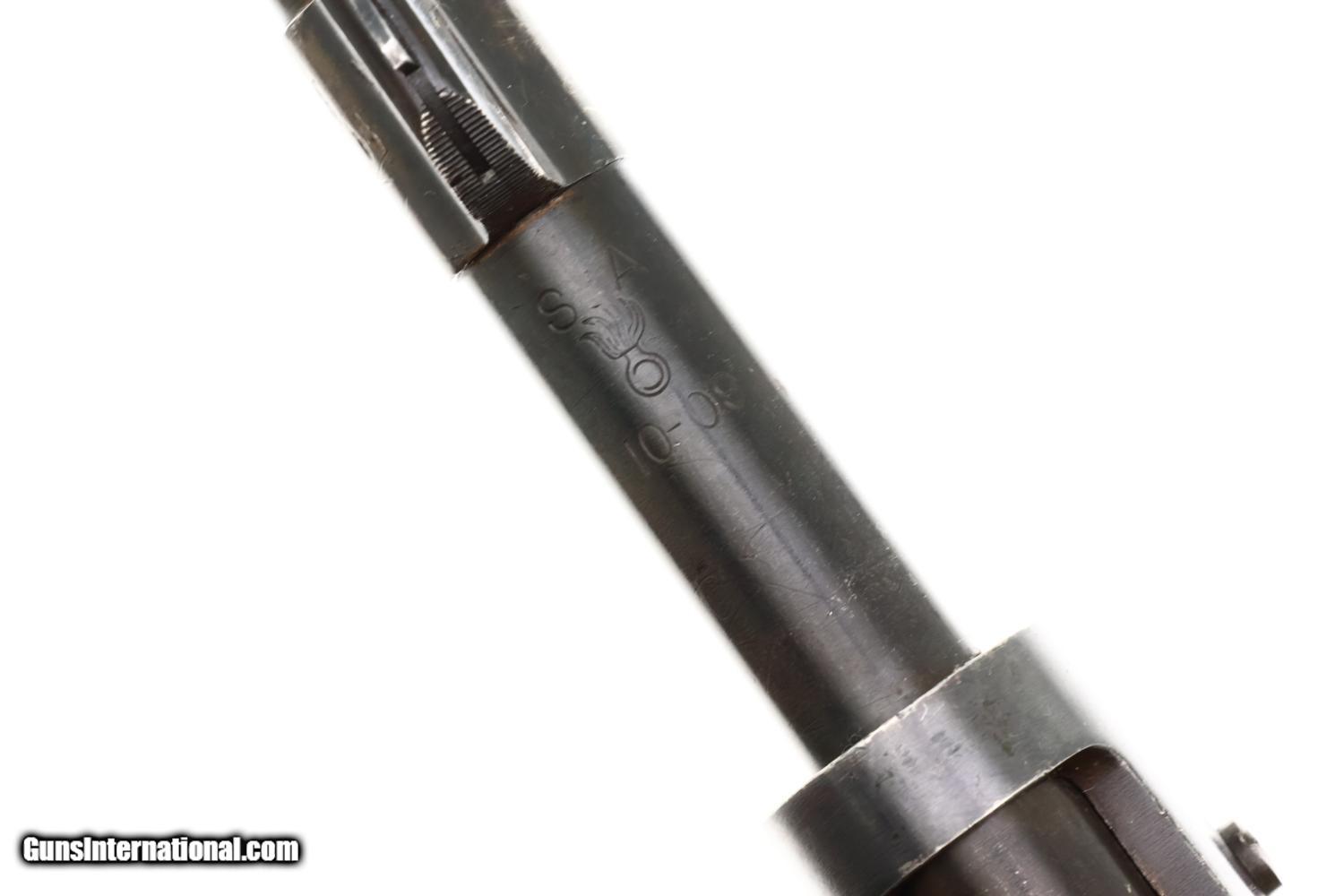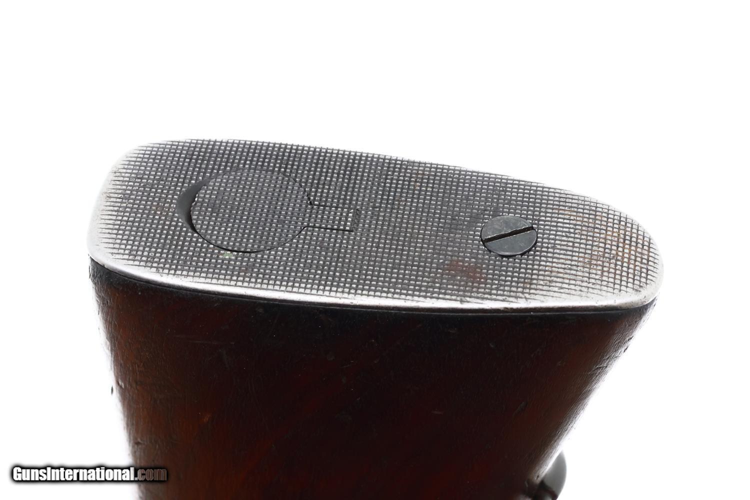 Description: Synopsis: Interesting early Springfield 1903 US military rifle, barrel dated 10/09, pre-WWI, that was likely reworked during WWII at the Raritan Arsenal in New Jersey as reflected by the "RA-P" cartouche on the left side of the stock. Despite its age and significant use, manual mechanics are correct and bore remains bright. Description: Standard configuration Springfield Model 1903 rifle, SN 386512, chambered in .30-06, with blade front and battle/ladder style (graduated 3-27) rear sight, barrel marked "SA/flaming bomb/10-09", standard receiver markings that reflect manufacturer, model, and SN. Smooth straight grip stock with high hump handguard with sighting channel, finger grooves, faint boxed “J.F.C.” and "RA-P" near the magazine disconnector, encircled "P" behind trigger guard, double reinforcing bolts, and checkered steel trapdoor buttplate. Condition: G-VG as rebuilt by Raritan Arsenal in New Jersey, often during World War II, with the "P" potentially pointing to an inspector (like Peterson) or "Proof. Now with considerable fading of the finish around receiver, magazine floorplate, and trigger guard. The reworked stock is oil stained with handling marks, a tiny chip at toe. Bright bore with sharp rifling. Correct manual mechanics. An interesting Springfield 1903 rifle that was later reworked/rebuilt by Raritan Arsenal in New Jersey. Manufacturer: Springfield Armory Model: 1903 Military Rifle Serial Number: 386512 Caliber Info: .30-06 Condition: G/VG Price: $1,195.00 Contact Seller |