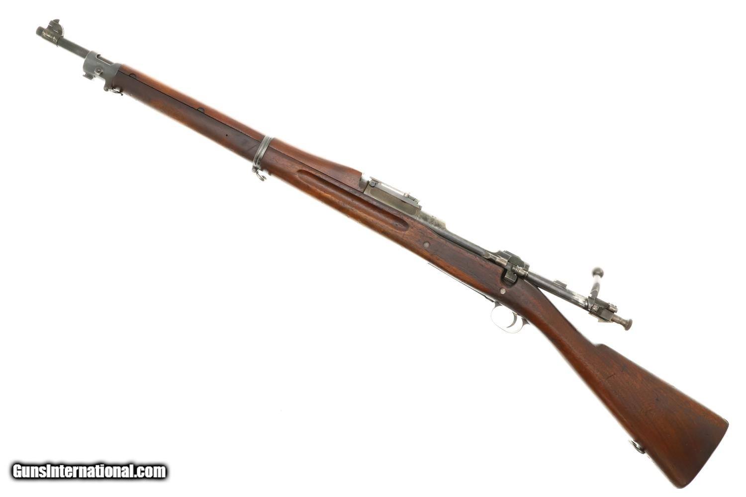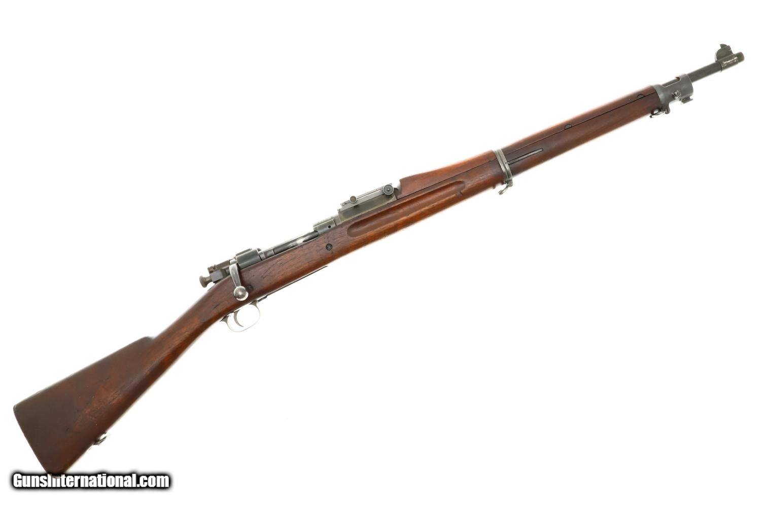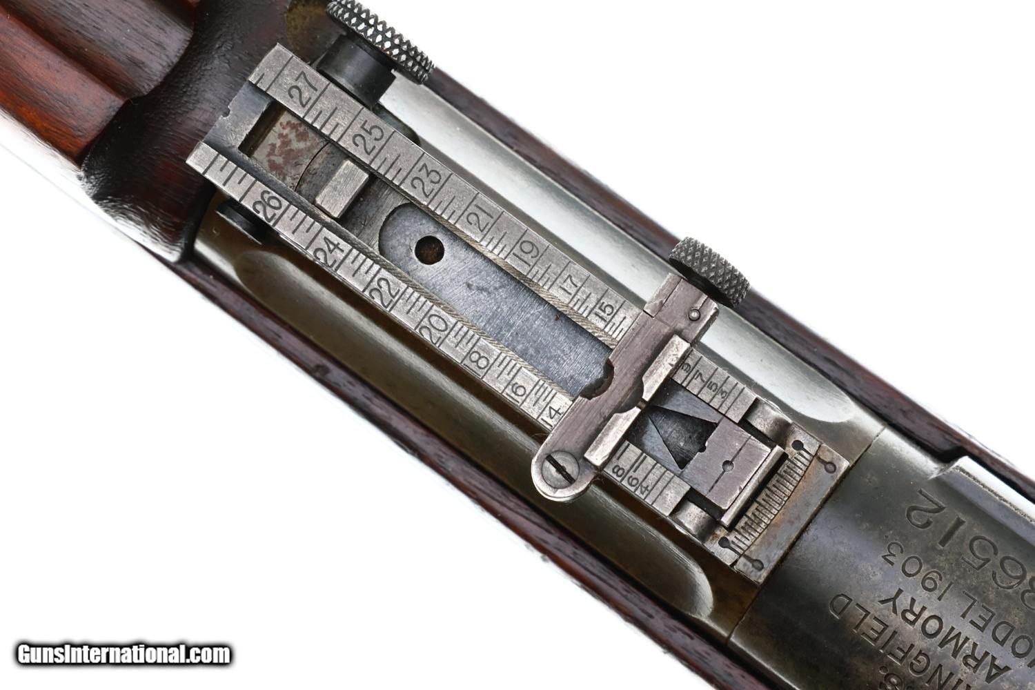 Interesting early Springfield 1903 US military rifle, barrel dated 10/09, pre-WWI, that was likely reworked during WWII at the Raritan Arsenal in New Jersey as reflected by the "RA-P" cartouche on the left side of the stock. Despite its age and significant use, manual mechanics are correct and bore remains bright.