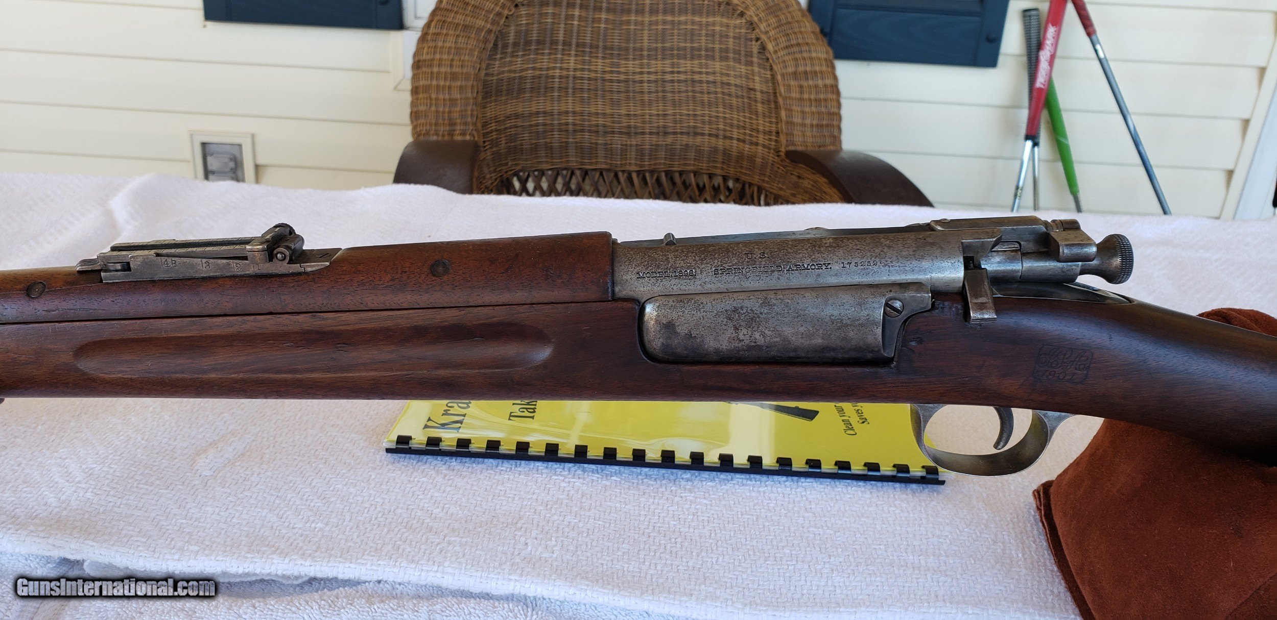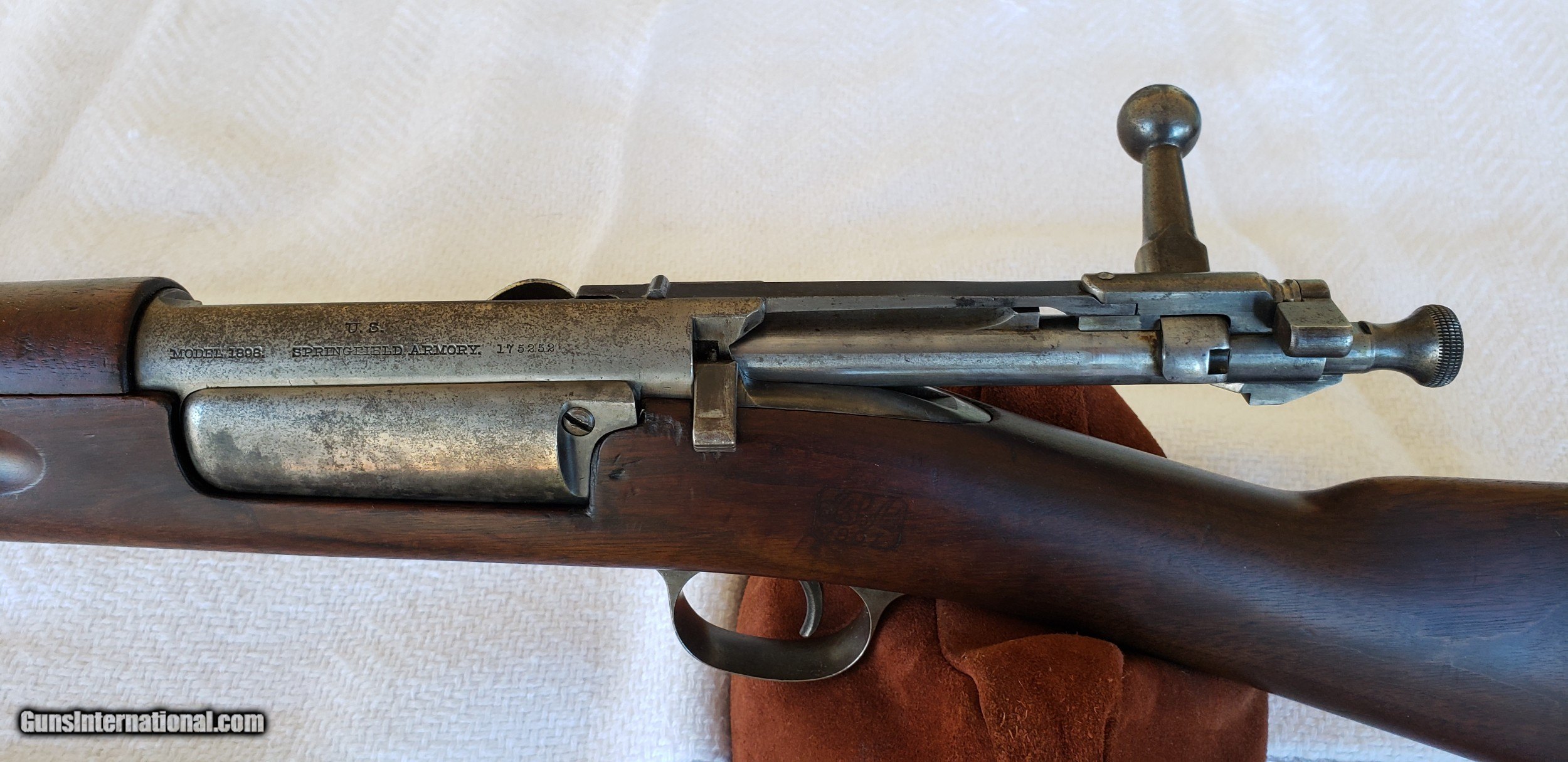 Description: SPRINGFIELD ARMORY, – U.S. Model 1898 Springfield. U.S. Model 1898 - .30/40 KRAG-JORGENSEN with military sling. Rifle stock Dated 1901, 30" Barrel - .30/40 Krag Caliber, 6 bullet magazine capacity. Springfield Armory Stamped U.S. Model 1898 and stock dated 1901. Gun Receiver Serial Number dates gun produced in Fiscal Year 1899. Bolt action repeater. The gun is rare All Original used condition. The rifle has Fine Bright Bore, Original Blued (Black) case hardened finish. Straight grain and grip American walnut stock with handguard with a very good wood finish. Receiver is marked “Model 1898” in front of U.S. Springfield Armory and SN on left side. Hand guard is unmarked. Forearm is matching walnut with finger grooves. CONDITION: Very good. Barrel shows an even plumb brown patina overall with some high-point wear and minor rub marks. Barrel band pretty much matches the Barrel in appearance. Rear and front sights are very good. Raised front blade sight. Rear sight is adjustable buckhorn rear with an elevator! Receiver is a dark brown black patina with remnants of black oil quenched case hardening. Loading door shows traces of blue blending to a gray brown patina. Extractor is a plumb brown patina with slight traces of fire-blue. Bolt handle is a plumb brown patina with traces of case color in protected areas. Stock is very good with minimal dents and bruises and sharp markings. Hand guard is very good with a few minor dents. The gun has a trapdoor steel butt plate. It is missing many of the normal handling marks one would expect to see in a military rifle of this age. This is an impressive gun. Everything is in overall very good condition. This gun doesn’t appear to have seen much action. For the age of this rifle is it looks great! Certainly, it was serviced and cared for by a good soldier and subsequent owners. This is a very nice survivor rifle in very nice overall condition. Great condition for an inexpensive collector and/or a shooter! It is important to please note that no part of this posting is intentionally misrepresented. All information is as accurately described as possible. I strive for a happy well informed buyer! The gun was "The Spanish-American War Rifle”. Vintage military rifle as used at San Juan Hill, Cuba – with Teddy Roosevelt’s Rough Riders. The Spanish–American War was an armed conflict between Spain and the United States in 1898. Hostilities began in the aftermath of the internal explosion of USS Maine at Havana Harbor in Cuba. Gun was issued in both rifle and carbine configurations, the 1898 Krag-Jorgensen design filled the gap between the Trapdoor Springfield and M1903 in US military service, seeing service during the Spanish-American War in both Cuba and the Philippines. This was the first U.S. smokeless service rifle until replaced by the 1903 Springfield. Rifle has a unique bolt action mechanism. The magazine can be opened to accept cartridges, and when closed, will feed the rounds up into the action. This allows for fast and easy loading, which was an appreciated feature at the time. Gun stock has sharp inspector cartouche “JSA” over “1901” in rectangle on left side above trigger and Circle-P armory proof stamp behind trigger guard with “A.L.” stamped in front of it. Serial Number 175252, MFG: Fiscal Year 1899 (per gun’s SN# marking). It is Mechanically Excellent in Firing Condition. I have personally shot the gun 12 times with a 7 inch group at 100 yards. (And I am just an OK marksman!) The gun is an excellent example of Springfield Armory production quality. The action is very smooth, the trigger has a crisp release, safety is functional and magazine spring is strong. This model was used for many years as a military match competition rifle based on its legendary accuracy. It was also popular post military surplus for big game hunting. DISCLAIMER: While this rifle is mechanically sound and 100% intact. It is only being offered as an antique collector’s item. The seller does not accept responsibility as to the shooting safety or reliability. And it should not be fired without a careful inspection and confirmed safe to fire, by a very qualified gunsmith or gun owner. And only then, with approved / certified ammunition for this specific model. $1,000 (Price reduced from $2,000) SOLD Curio/Relic: Yes Rifle Caliber: .30-40 Krag |