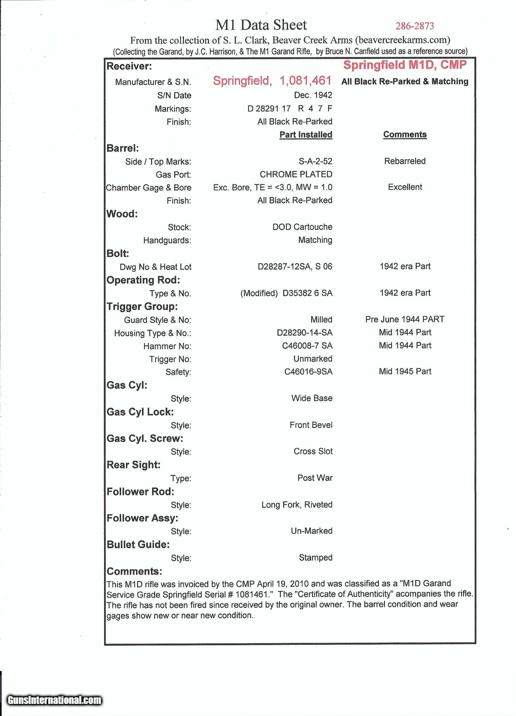 Description: This Springfield M1D Grand was sold by the CMP in 2010. We understand that early CMP rifles like this are in better condition than later offerings. That seems to be the case with this rifle. The Receiver serial number dates it to Dec.1942. The Springfield barrel installed is dated Feb. 1952. This barrel remains in excellent condition, having a bright shiny bore with a Throat Erosion gage reading of just under 3.0 and a Muzzle Wear reading of 1.0, a new barrel. The rifle was purchased from the CMP in 2010 and was in a collection and never fired. Many of the component parts are shown listed on the provided data sheet. These parts installed were evaluated for suitability and were then refinished in a uniform matching black finish by the CMP. The rifle will ship with the reproduction Scope and Mount as shown. Also included is the lace on leather cheek pad and two original flash hiders. A T-37 Prong type flash hider, and a Cone style M-2 flash hider. The CMP paperwork will be included along with a copy of the data sheet. This is an opportunity to obtain a very nice M1D Garand Sniper Rifle for your collection. .30-06. Cal. with a 24” barrel. SN: 1081461. FFL or C&R REQUIRED Beaver Creek Arms TERMS & CONDITIONS Objective: As a collector of 35 years and Licensed Firearms Dealer since 1989 I have a clear definition of a satisfactory transaction. I will be paid as we agreed to, and you will be satisfied with your purchase. My goal is to establish a client list of satisfied repeat customers who will recommend me to other collectors. It’s just that simple. Exiled Saudi princes with secret funds needing change from an over paid purchase need not apply. Notice: ALL Federal, State, & Local firearms laws will be followed. I will take NO shortcuts in the process of a legal sale or transfer, so please don’t ask. SHIPPING: Shipments are made via U.S.P.S. Priority Mail, Insured, with Signature required. Shipping and Insurance cost for this Long Gun is $60.00. Checks to be made out to: Steve Clark 380 Beaver Creek Rd. Dillsburg PA 17019 FIREARMS: Modern firearms, post 1898, can only be shipped to a Type 01 Federal Firearms License address. Curio-Relic firearms, as defined by the BATF list, can usually be shipped to a Type 03 Collectors License address. A signed valid FFL license copy will be required for shipment to the license address. GUARANTEE: Your complete satisfaction is assured, see objective above. If you are not satisfied, please contact me within 3 days of receipt. Please don’t fire the weapon, safety, function and accuracy are NOT Guaranteed. Any weapon offered by Beaver Creek Arms is never test fired nor is there any representation that the gun is functional and safe to fire. These guns are sold as collectors and only represented as used firearms that must be checked by a competent person, observe all the necessary safety precautions prior to attempting to load and fire one of these weapons. RETURNS: Returns must be made within 3 days of receipt. They must be received in exactly the same condition with no parts exchanged. If it has been altered, damaged, or fired, a refund will not be made. Packing, shipping and insurance cost will not be refunded PAYMENT: Bank check, Personal check, and Money Orders are preferred. Visa and MasterCard are accepted with a 4% processing fee LAYAWAYS: A 20% deposit is required. Balance is due in 30 days. Deposits are non-refundable and are forfeited after 40 days. Layaway sales are returnable for merchandise credit only. SALES TAX: Pennsylvania state sales tax is 6% for in state purchases. The payment of other states sales tax, if applicable, for shipped items is the buyers responsibility. DISCREET: Client information will remain Confidential. Your privacy is protected. SOLD Curio/Relic: Yes |