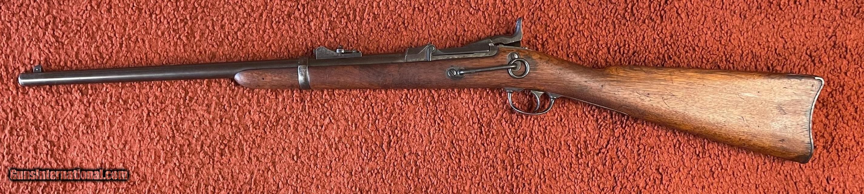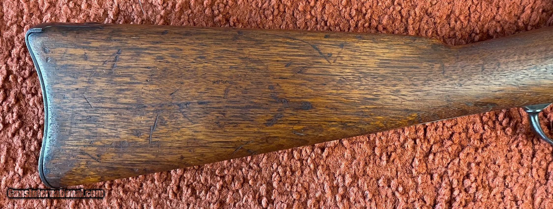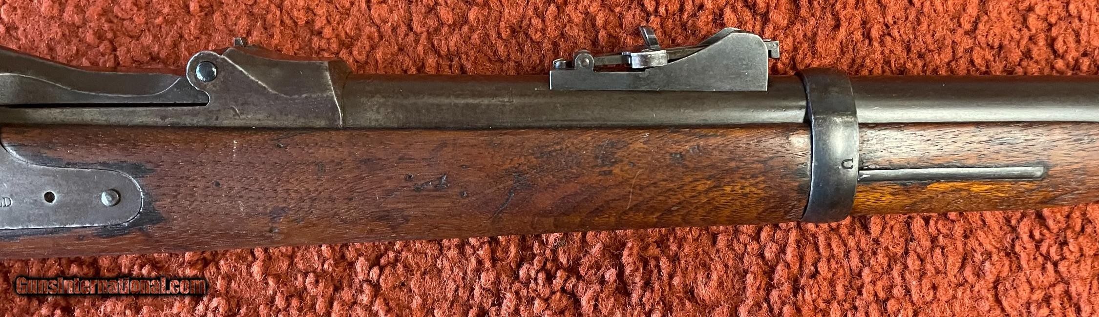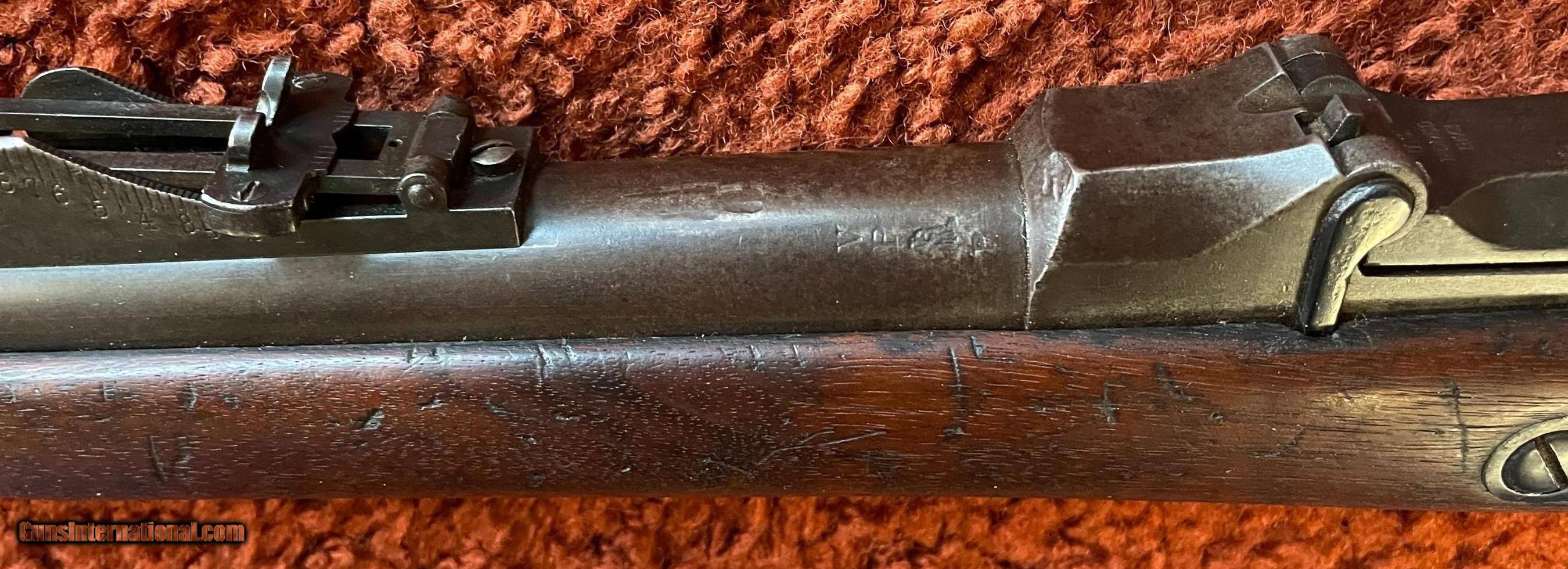 Description: The bore has good rifling with scattered corrosion. The action is excellent. The rear sight is a correct carbine sight marked " C " on the base and the ladder SOLD Antique: Yes Manufacturer: Springfield Armory Model: 1879 Carbine Serial Number: 142044 Barrel Length: 22 |