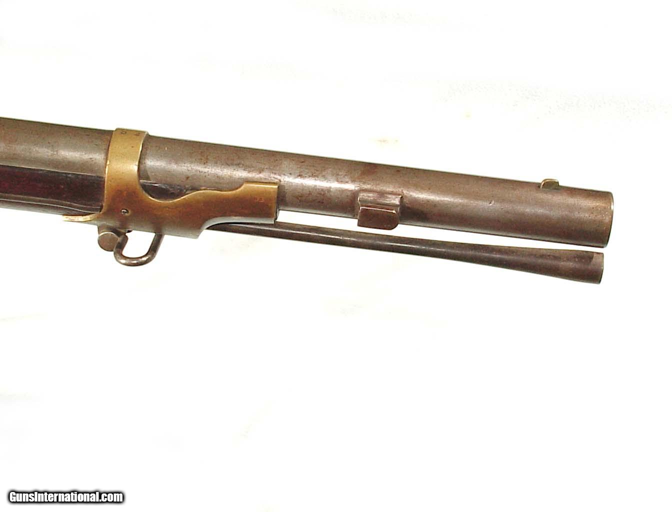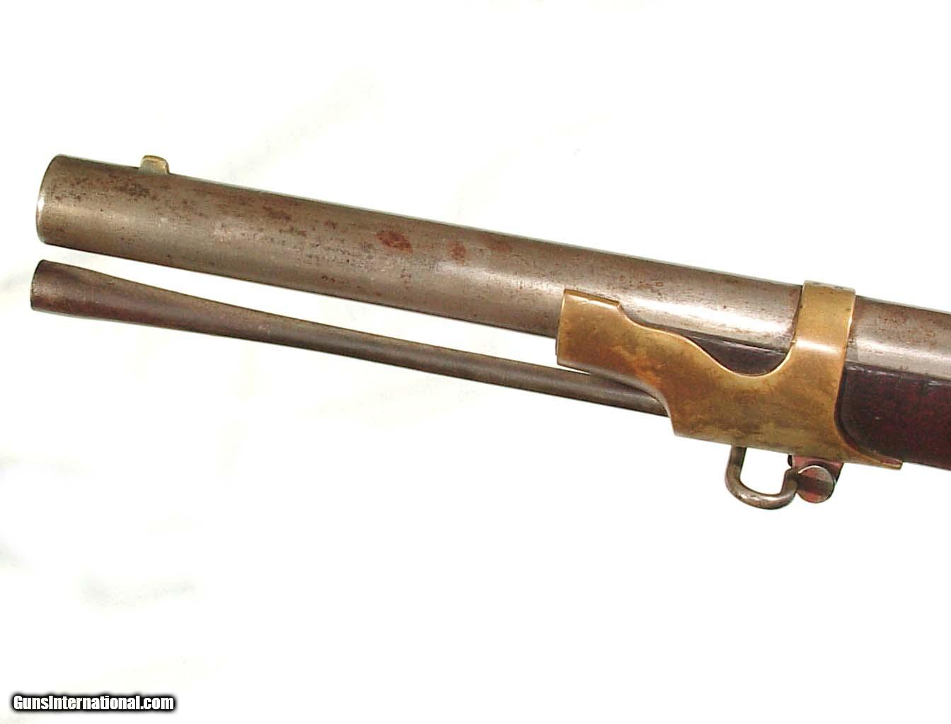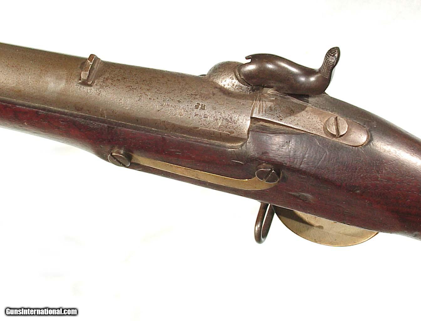 Description: .58 caliber, 32" rifled barrel dated "1846". Lock plate marked 'HARPERS FERRY 1845". Brass mounts, full length walnut stock with the U.S. inspector's initials on the left flat. Showing an even gray/gun metal color overall with some patches of roughness around the breech end of the barrel and bolster. The mounts show an even mellow patina, and the wood is very nice with only minor handling marks and free of and damage. Good rifled bore. SOLD Antique: Yes |