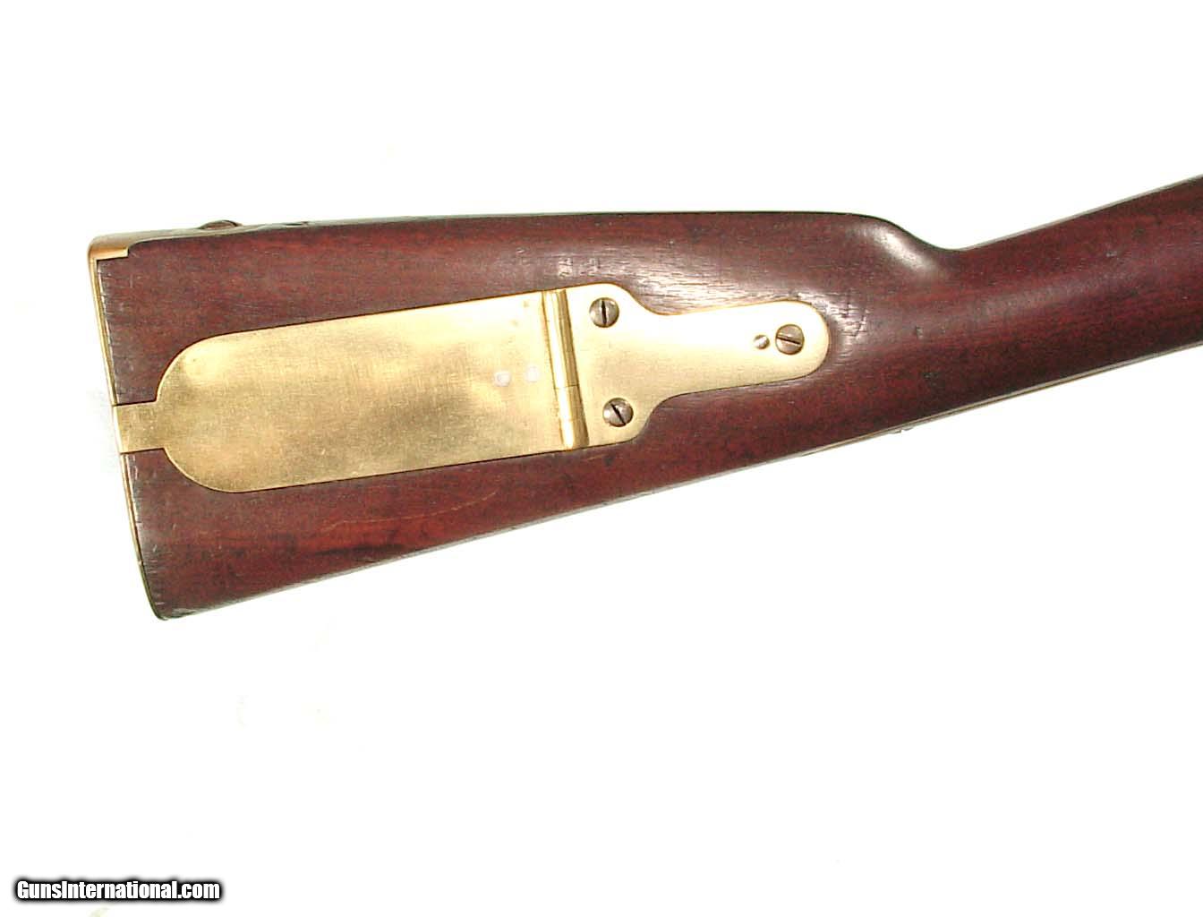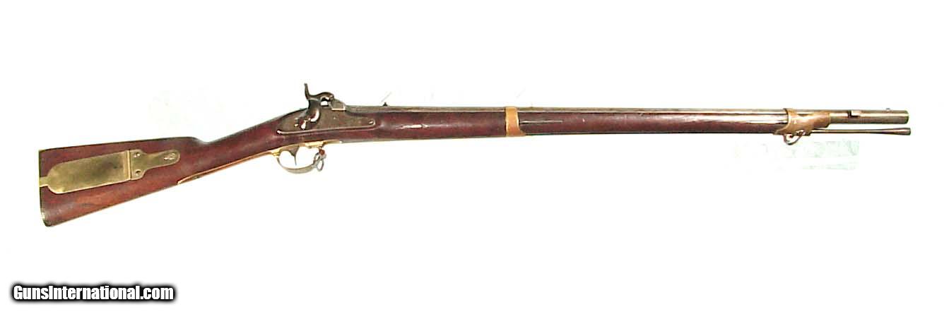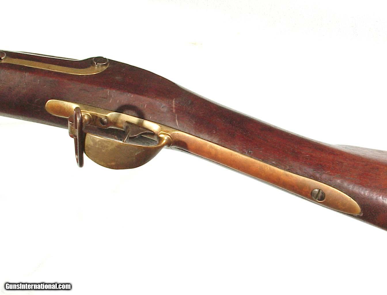 Description: .58 caliber, 32" rifled barrel dated "1846". Lock plate marked 'HARPERS FERRY 1845". Brass mounts, full length walnut stock with the U.S. inspector's initials on the left flat. Showing an even gray/gun metal color overall with some patches of roughness around the breech end of the barrel and bolster. The mounts show an even mellow patina, and the wood is very nice with only minor handling marks and free of and damage. Good rifled bore. SOLD Antique: Yes |