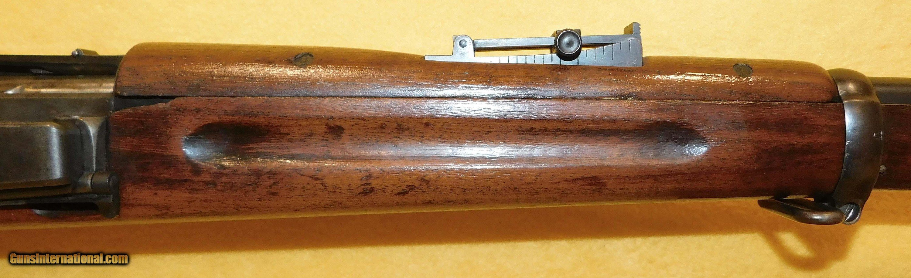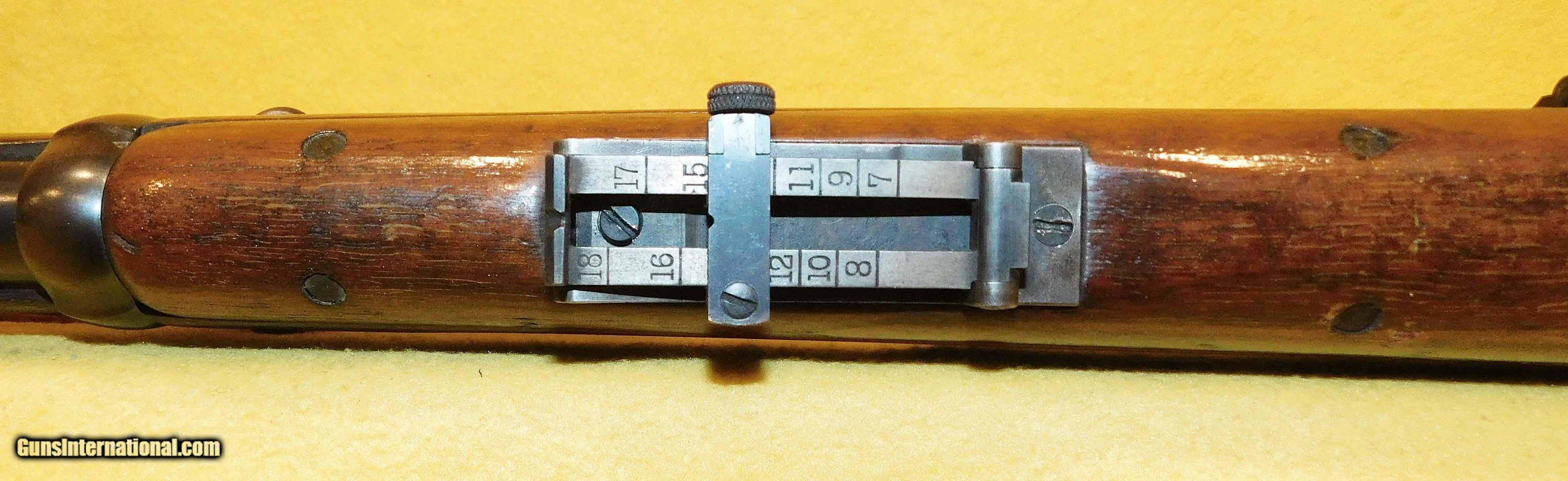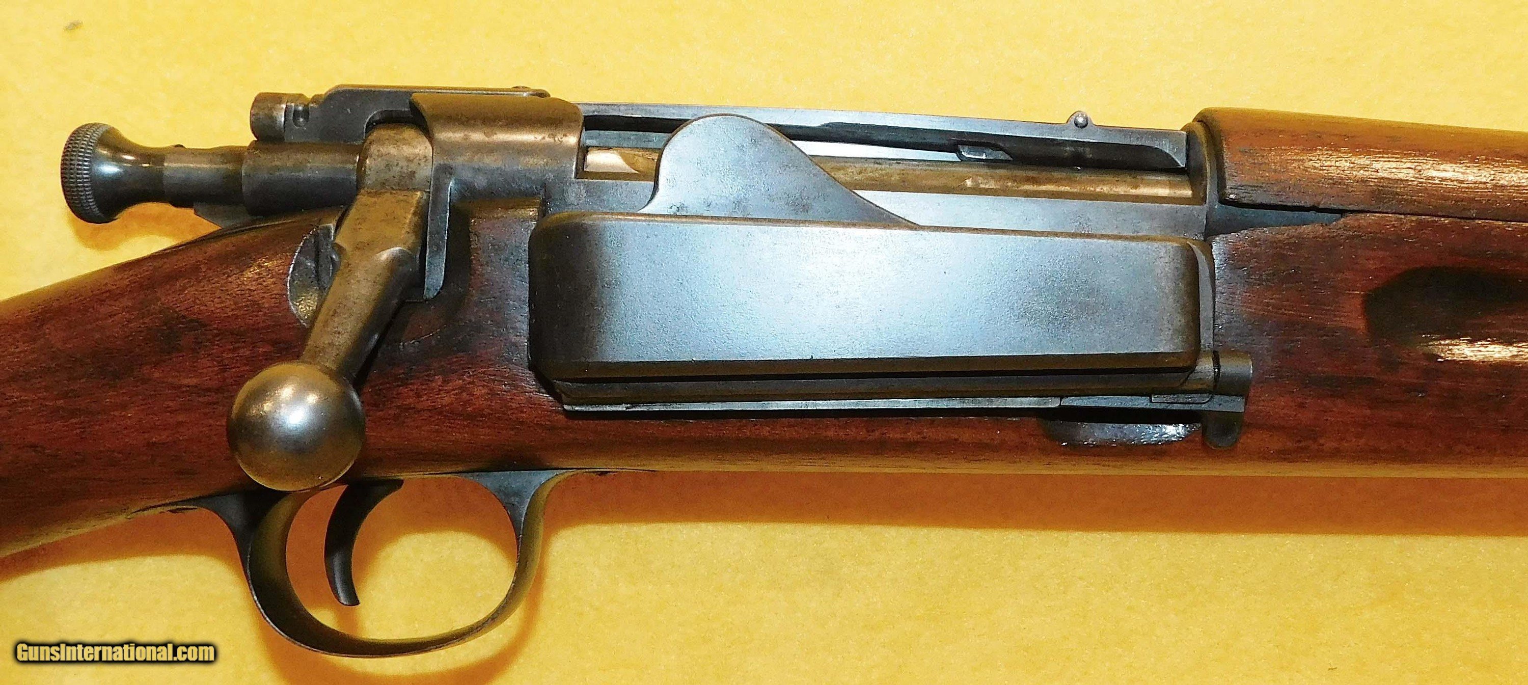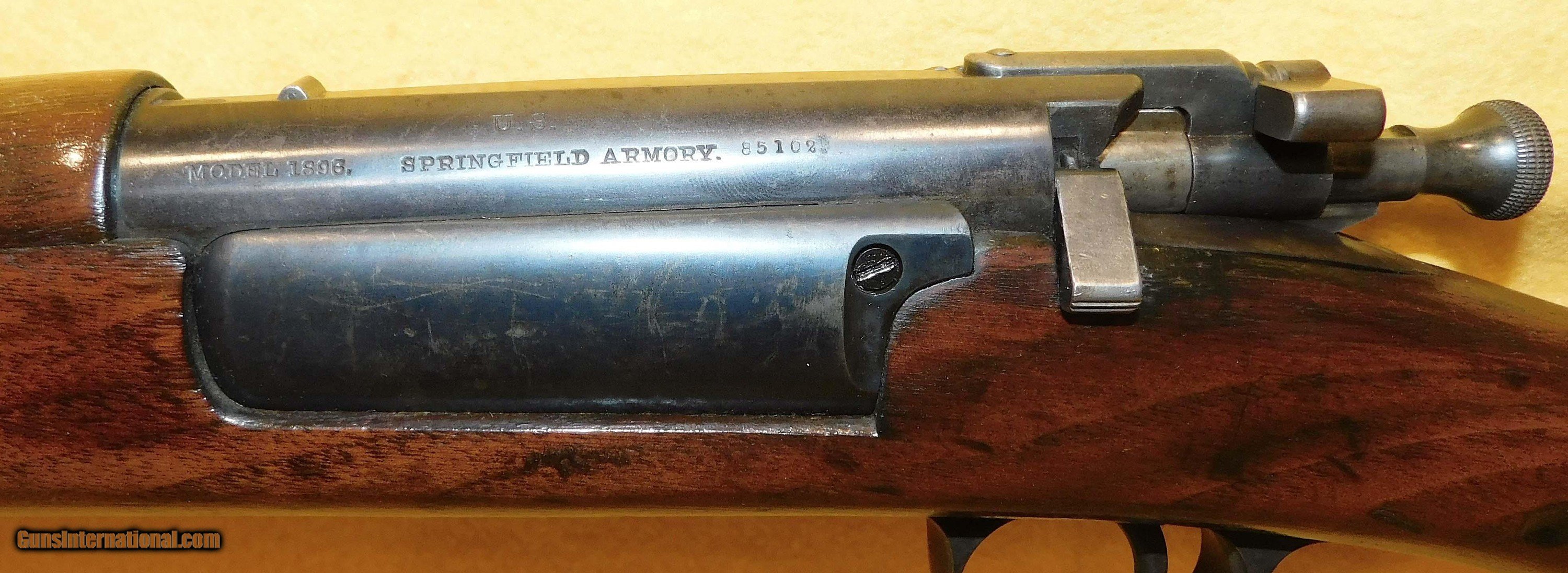 Description: U.S. SPRINGFIELD ARMORY 1896 KRAG JORGESEN IN .30-40 CAL., WITH 30" BARREL. COLOR BLUE. CONDITION 93%. SERIAL NUMBER 85102. U.S. SPRINGFIELD ARMORY MODEL 1896 KRAG JORGENSEN RIFLE, IN .30-40 CALIBER, BRIGHT SHINY BORE WITH STRONG RIFLING, STOCK AND HAND GUARD IS IN VERY GOOD TO EXCELLENT CONDITION EXCEPT FORE A SMALL CHIP OUT OF THE LEFT SIDE OF THE UPPER HAND GUARD, ALL WOOD HAS BEEN CLEANED AND SANDED WITH A COAT OF LACQUER APPLIED, BRASS MUZZLE CAP, 93% OVERALL CONDITION, OUR STOCK # D4048 SOLD |