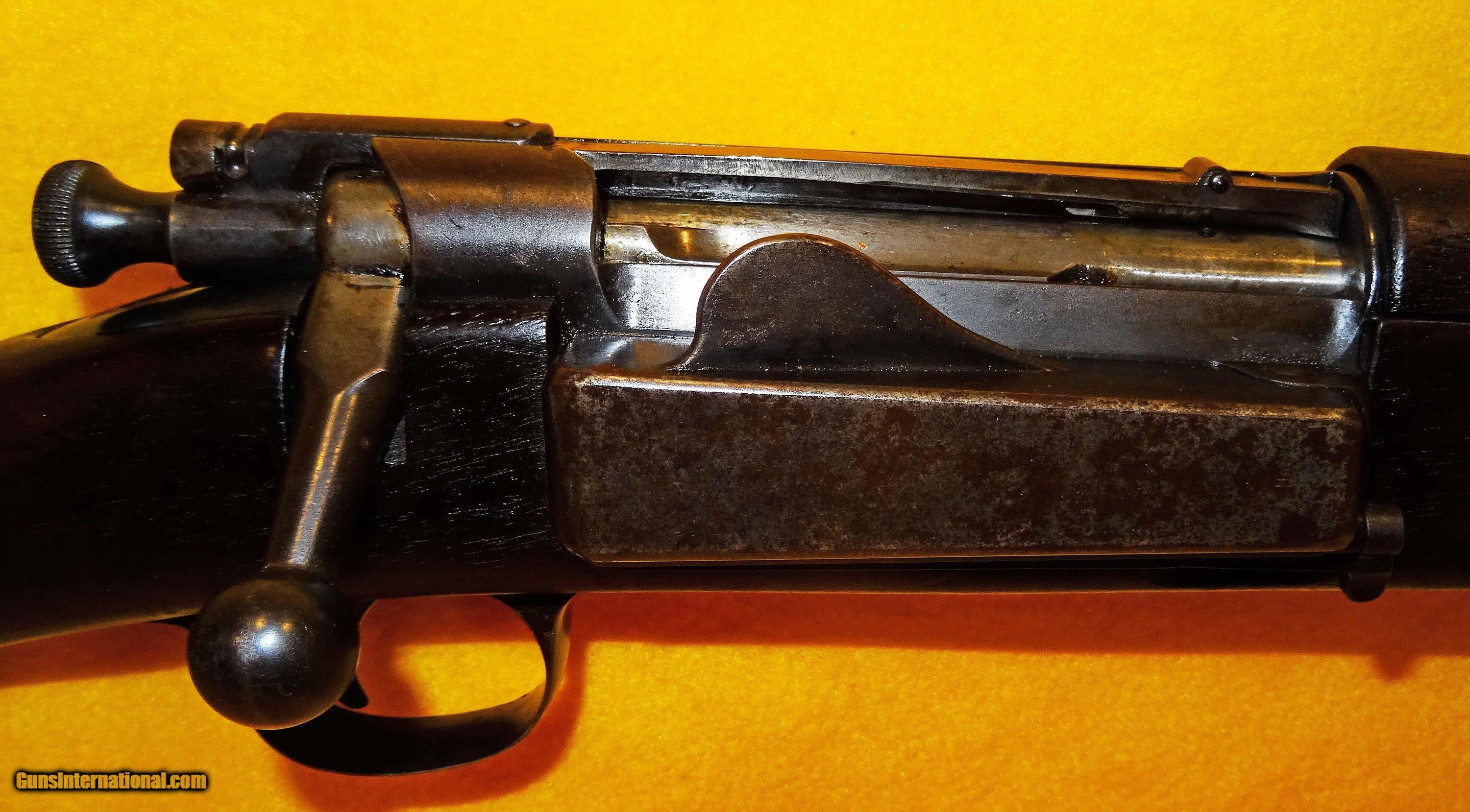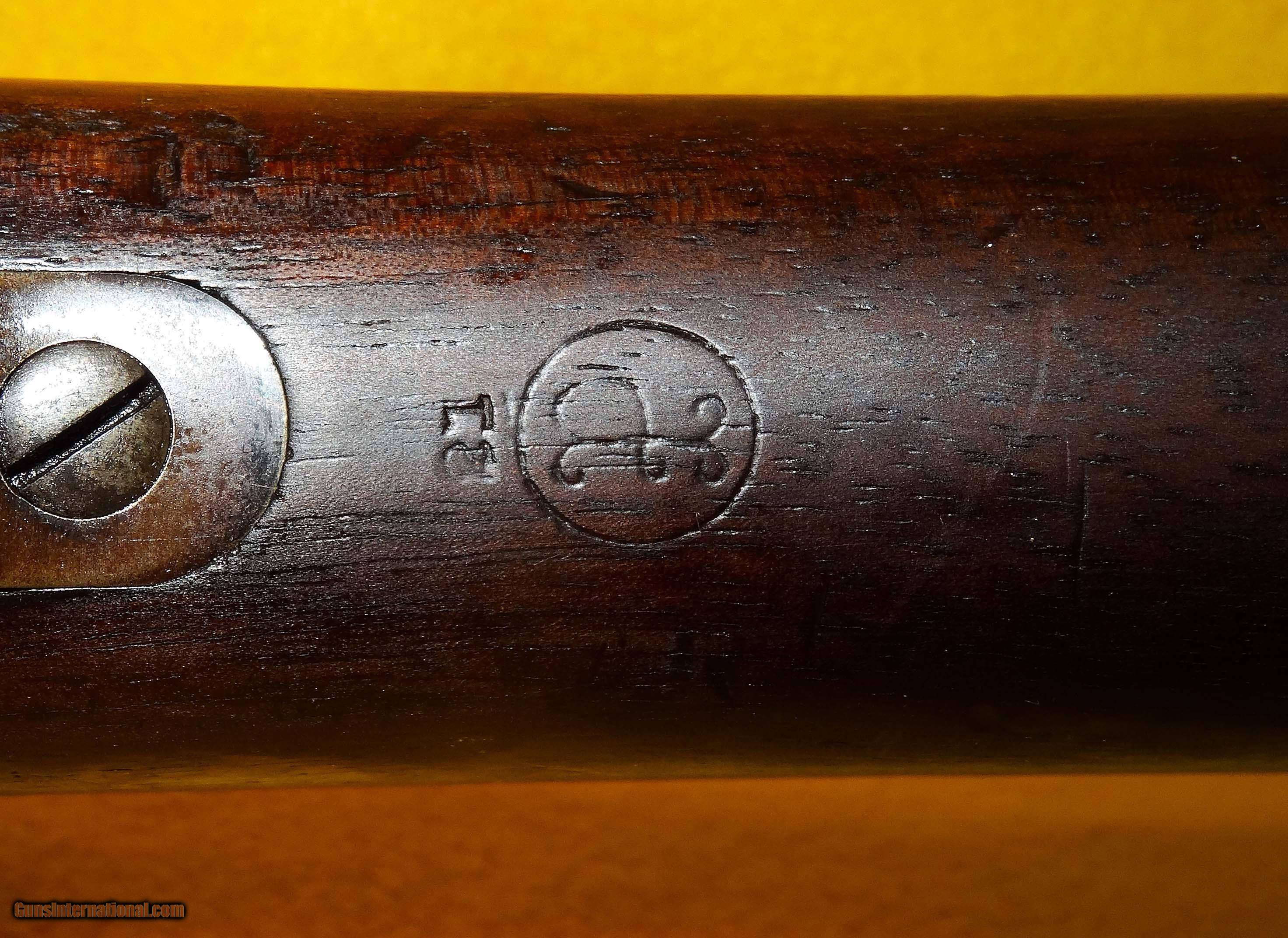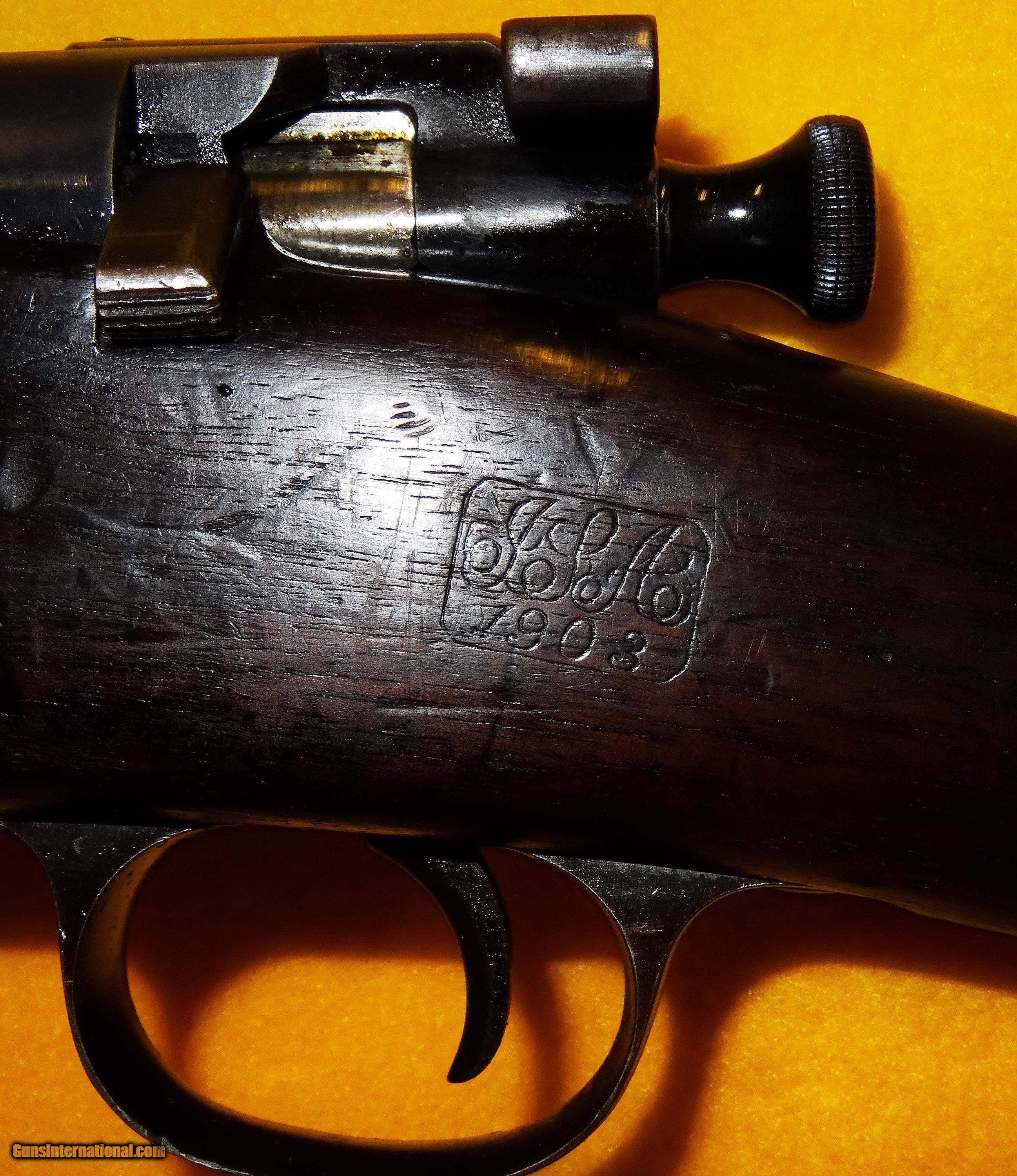 Description: U.S. SPRINGFIELD ARMORY 1898 KRAG-J0RGENSEN IN .30-40 KRAG CAL., WITH 30" BARREL. COLOR BLUE. CONDITION 75%. SERIAL NUMBER 439058. U.S. SPRINGFIELD MODEL 1898 KRAG-JORGENSEN IN .30-40 KRAG CALIBER, THIS FIREARM HAS BEEN IN A U.S. ARSENAL FOR THE LAST 100 PLUS YEARS AND NEVER IN CIVILIAN HANDS, COMES WITH A BRIGHT SHINY MIRROR BORE, NICE (P) PROOF WITH 1903 CARTOUCHE, 1901 REAR WINDAGE LADDER SIGHT, STOCK CONDITION IS GOOD WITH SERVICE WEAR, METAL FINISH IS 80% WITH NICE PATINA, OVERALL CONDITION IS 75%, OUR STOCK # D638 SOLD |