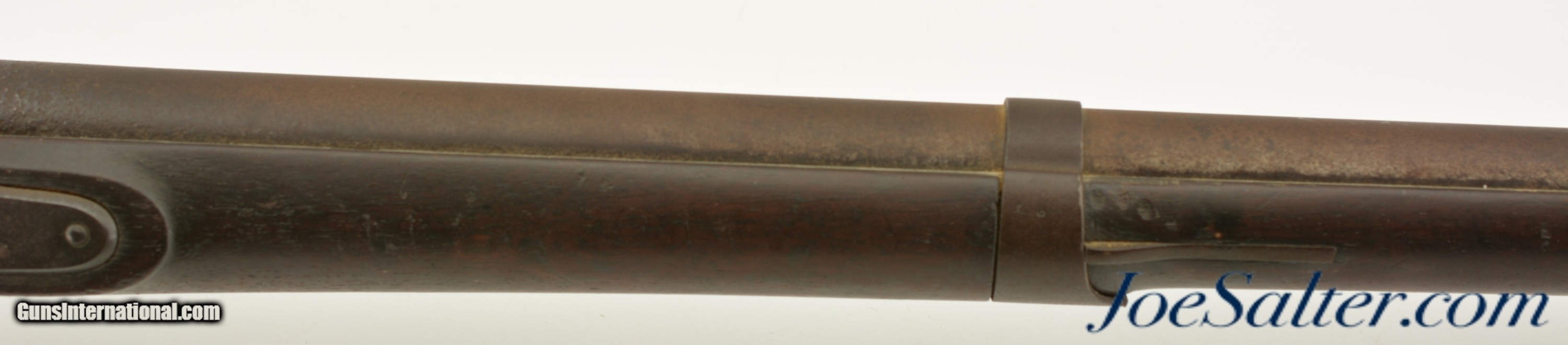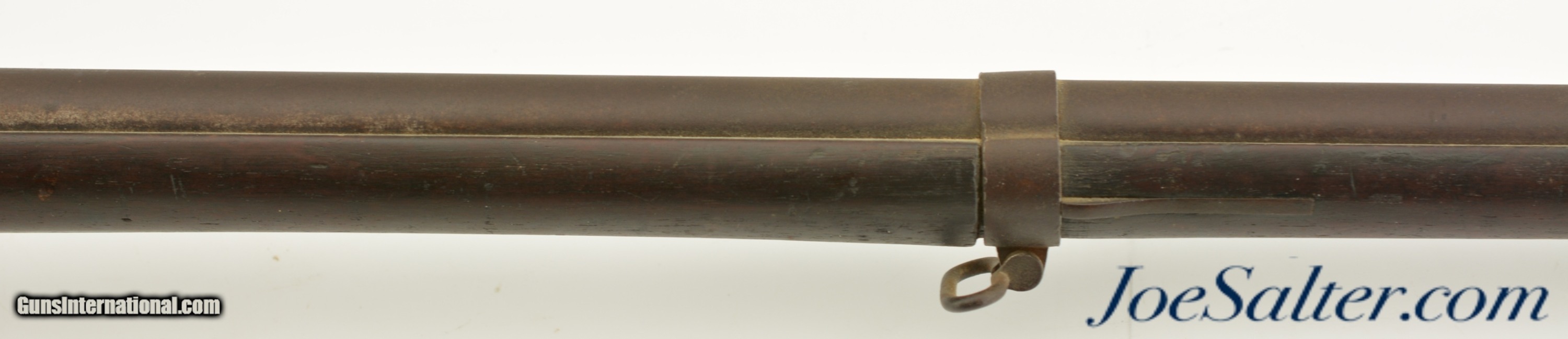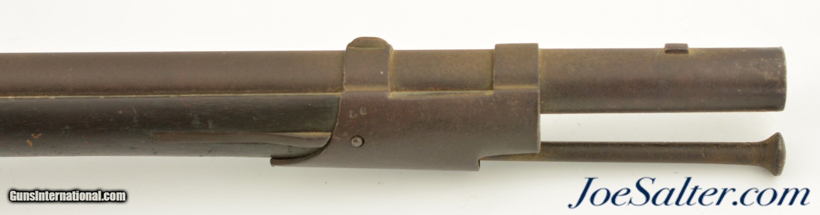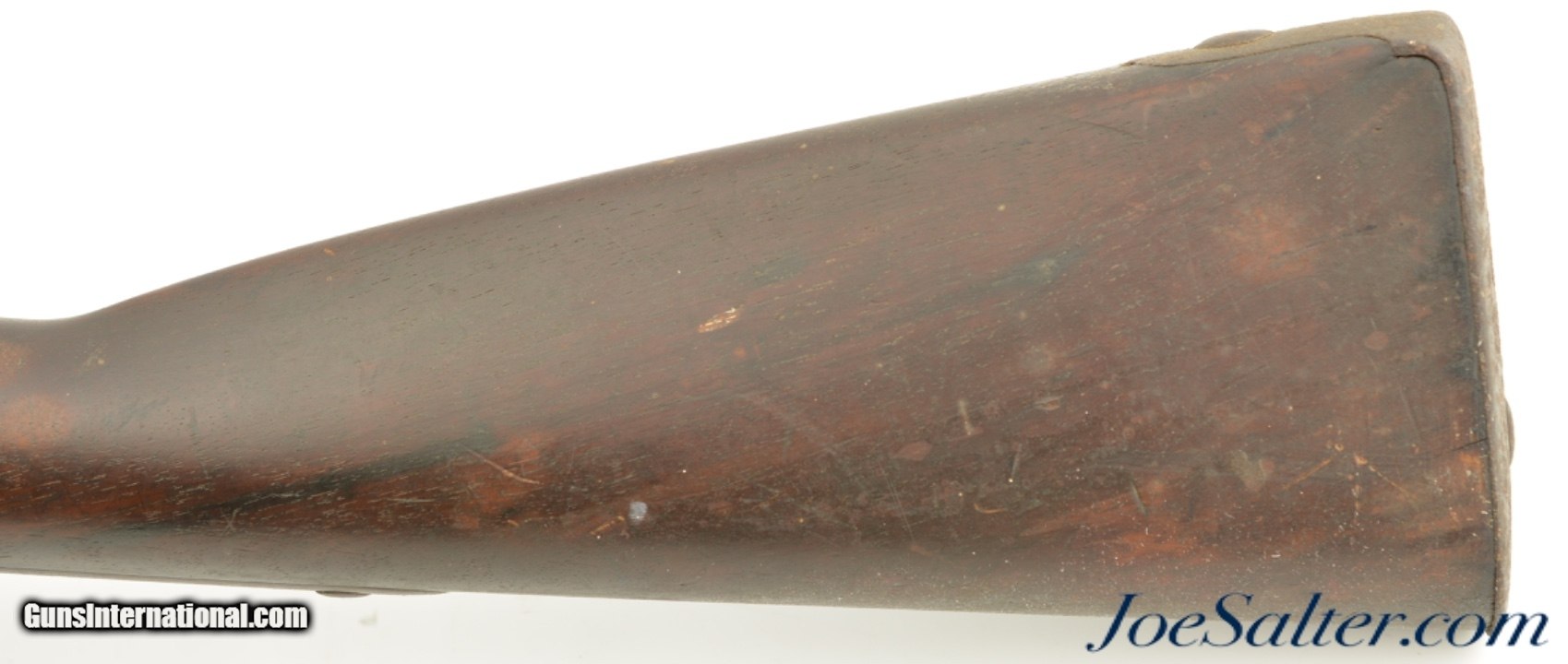 Description: NSN, .69 Caliber, 42" barrel with a good, lightly pitted bore. This musket has matching 1831 dates on the lockplate and barrel tang, with the metal having an overall dark, plum-brown patina, and mild pitting around the barrel breech. The "US / (sunburst) / N. STARR" and "MIDLTN / CONN / 1831" lockplate markings are still clear and legible, with an overall mottled gray-brown patina across the face. The musket was converted via the Cone, or Belgian method, and the remnants of the brass pan have turned to a mellow ochre patina. The walnut stock is in fine shape with scattered minor handling marks in the otherwise excellent original oil finish, with crisp "JH" (John Hawkins) inspector initials on the left side opposite the lock. The action is tight and fully functional, and the original iron ramrod is included. This is an attractive percussion conversion of a US Model 1816 Contract Musket, and would make a great addition to any collection. Antique SOLD Antique: Yes |