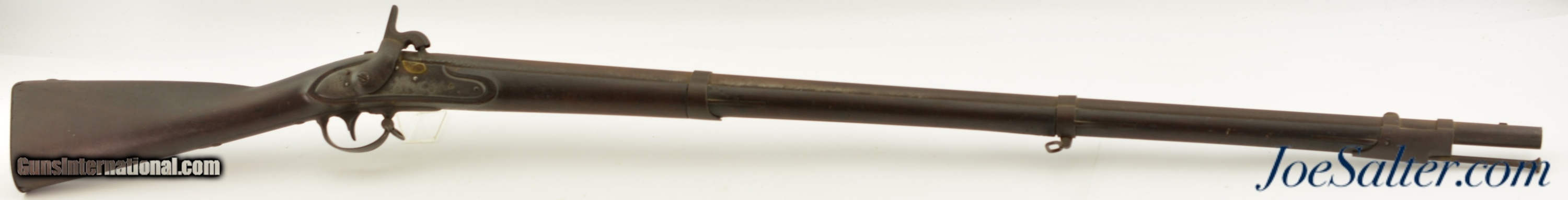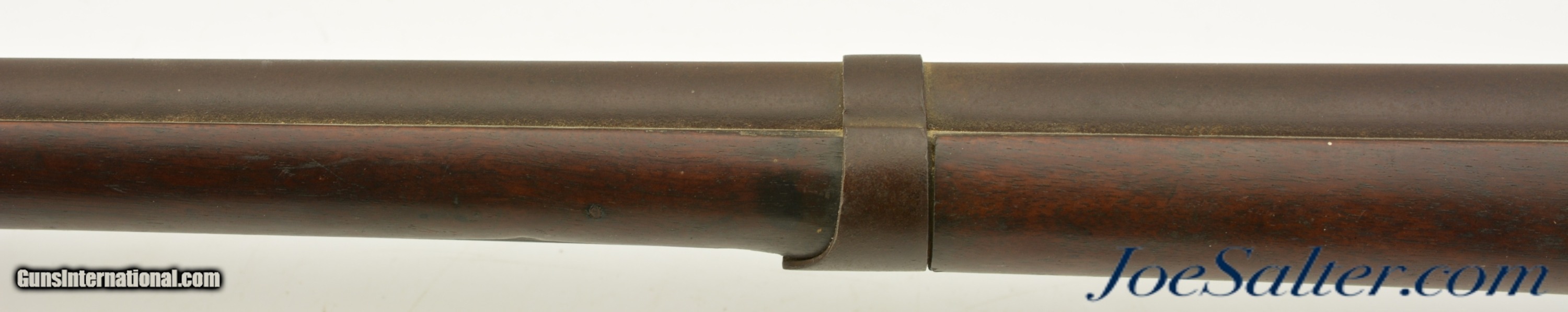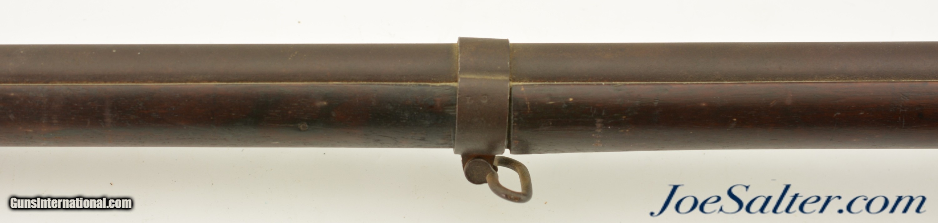 Description: NSN, .69 Caliber, 42" barrel with a good, lightly pitted bore. This musket has matching 1831 dates on the lockplate and barrel tang, with the metal having an overall dark, plum-brown patina, and mild pitting around the barrel breech. The "US / (sunburst) / N. STARR" and "MIDLTN / CONN / 1831" lockplate markings are still clear and legible, with an overall mottled gray-brown patina across the face. The musket was converted via the Cone, or Belgian method, and the remnants of the brass pan have turned to a mellow ochre patina. The walnut stock is in fine shape with scattered minor handling marks in the otherwise excellent original oil finish, with crisp "JH" (John Hawkins) inspector initials on the left side opposite the lock. The action is tight and fully functional, and the original iron ramrod is included. This is an attractive percussion conversion of a US Model 1816 Contract Musket, and would make a great addition to any collection. Antique SOLD Antique: Yes |
