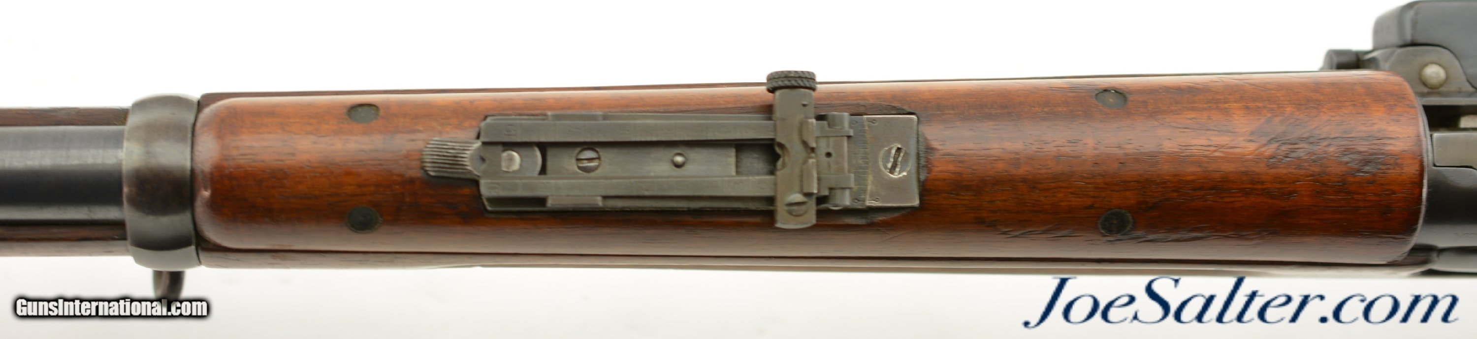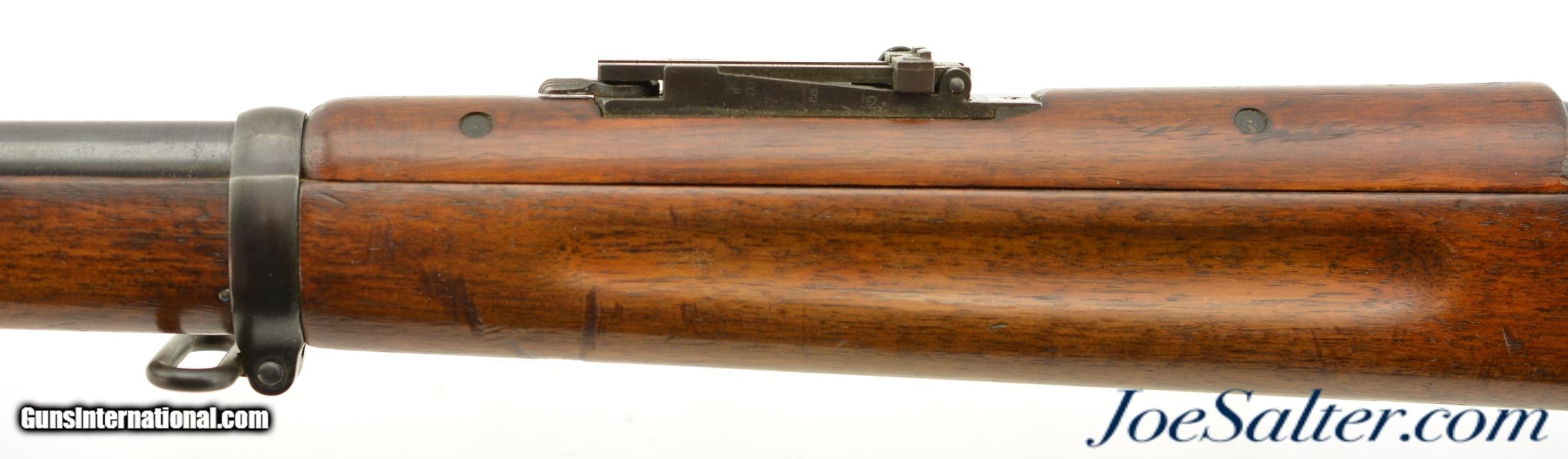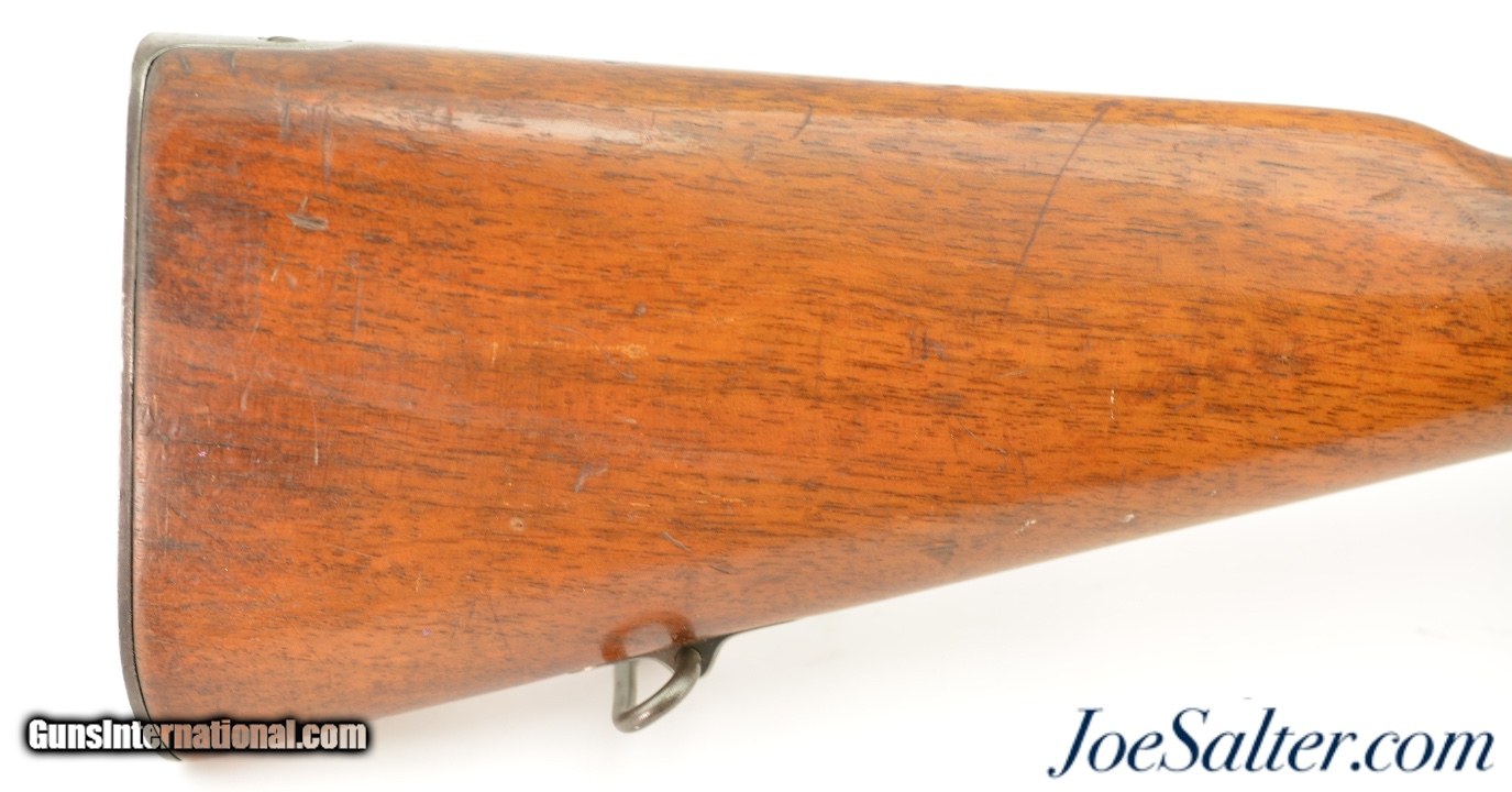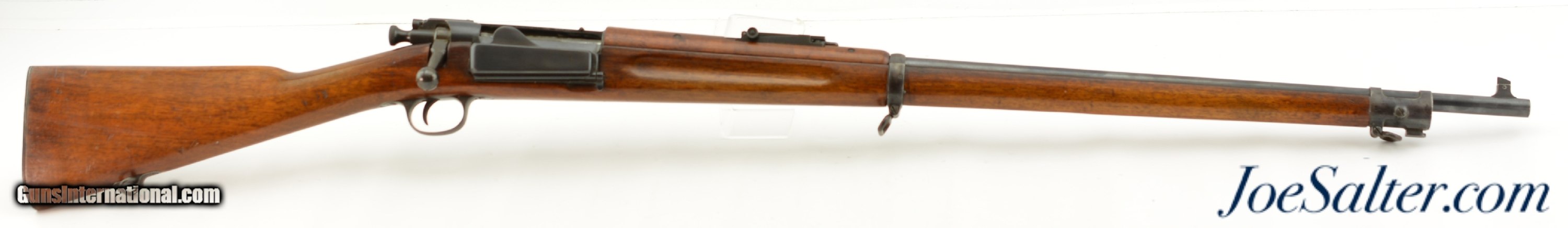 Description: Serial #255895, .30-40 Krag, 30" barrel with a fine, bright bore that has mild freckling within the grooves. This rifle retains 95-97% of the original blue on the barrel and nosecap, with some mild surface freckling and silvering at the muzzle and high edges and projections. The receiver, bolt, and trigger guard retain a commensurate amount of a reapplied blue finish that exhibits less freckling, and has left the markings quite crisp and clear. The magazine door andreceiver have turned to a predominantly freckled, gray-brown patina. The bolt has a marked armory bright finish with the balance turning to plum-brown on the handle. The walnut stock and handguard have numerous small handling marks and surface blemishes scattered about the reapplied varnish finish, and the barrel band has turned to a dull plum-brown. There is no cartouche visible, but the firing proof is still clear and crisp. This is an about about very good '98 Krag overall. FFL or C&R; Curio/Relic: Yes Price: $995.00 Contact Seller |