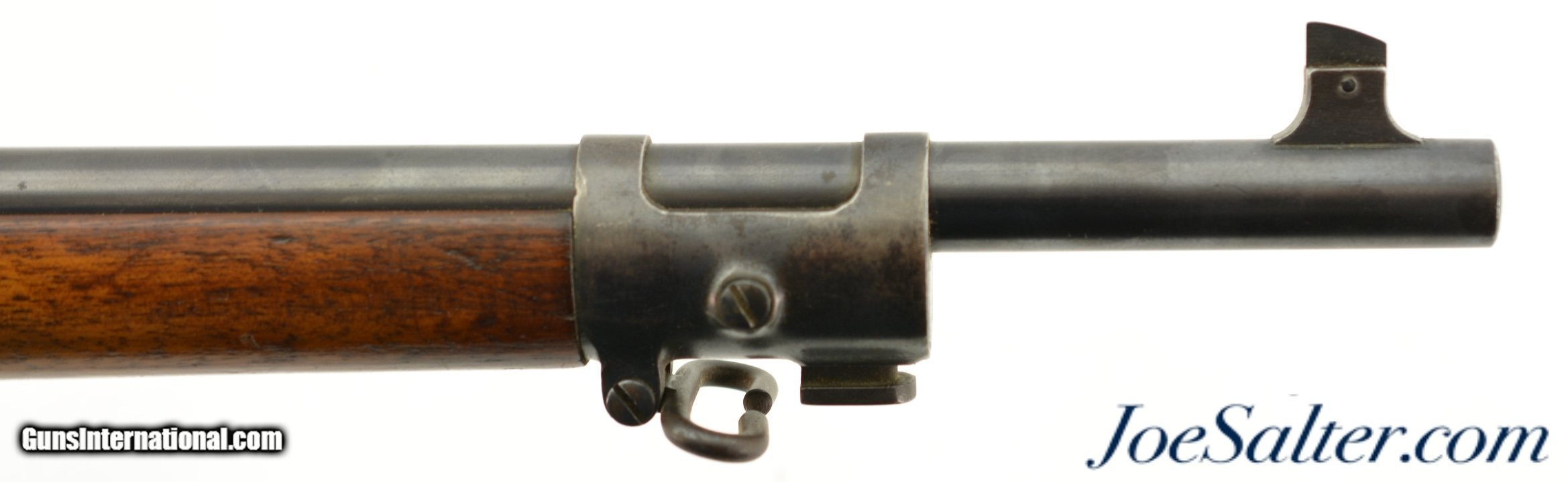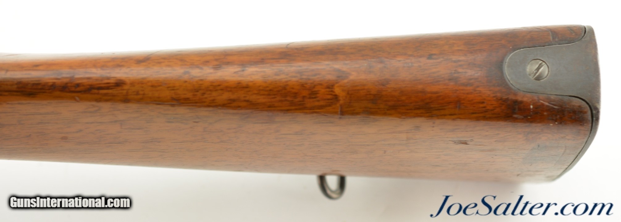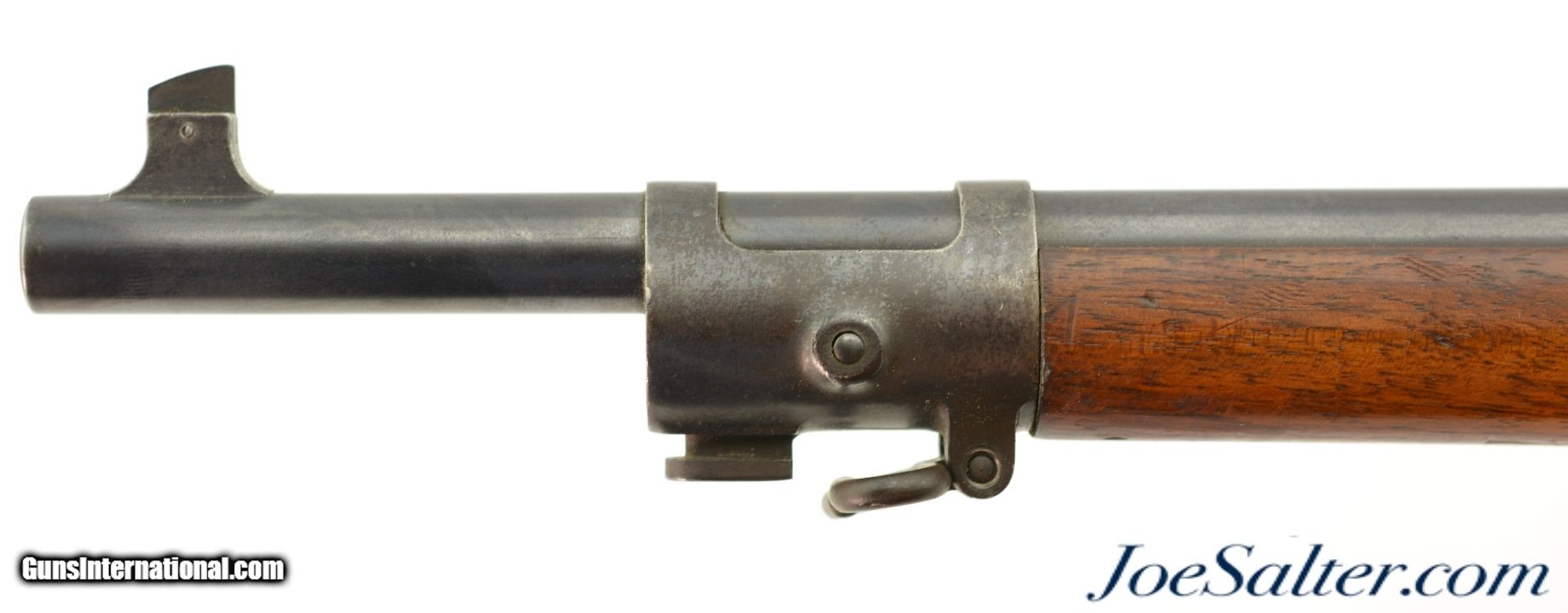 Description: Serial #255895, .30-40 Krag, 30" barrel with a fine, bright bore that has mild freckling within the grooves. This rifle retains 95-97% of the original blue on the barrel and nosecap, with some mild surface freckling and silvering at the muzzle and high edges and projections. The receiver, bolt, and trigger guard retain a commensurate amount of a reapplied blue finish that exhibits less freckling, and has left the markings quite crisp and clear. The magazine door andreceiver have turned to a predominantly freckled, gray-brown patina. The bolt has a marked armory bright finish with the balance turning to plum-brown on the handle. The walnut stock and handguard have numerous small handling marks and surface blemishes scattered about the reapplied varnish finish, and the barrel band has turned to a dull plum-brown. There is no cartouche visible, but the firing proof is still clear and crisp. This is an about about very good '98 Krag overall. FFL or C&R; Curio/Relic: Yes Price: $995.00 Contact Seller |