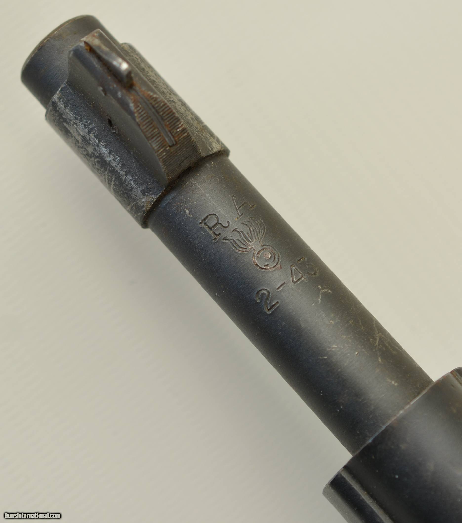 Description: Serial #3555458, .30-06, 24" barrel with an excellent, bright bore. This is a handsome rifle has an early, four-groove "RA / 2-43" dated barrel and retains 97-98% of an arsenal Du-Lite finish that has silvered slightly on some of the high edges and corners, the bearing surfaces of the bolt, and on the sides of the front sight base where the sides look to have been buffed. The walnut stock has minor handling marks and small blemishes in the original oil finish, but the only markings are a crisp rebuild mark on the left side: “AOO". Regardless, this is a great looking, four-groove World War II '03-A3 that was refurbished after the war, has excellent metal, and rates fine condition overall. FFL or C&R SOLD Curio/Relic: Yes Manufacturer: Remington Model: 1903-A3 Serial Number: 3555458 Caliber Info: .30 Gauge Info: .30 |
