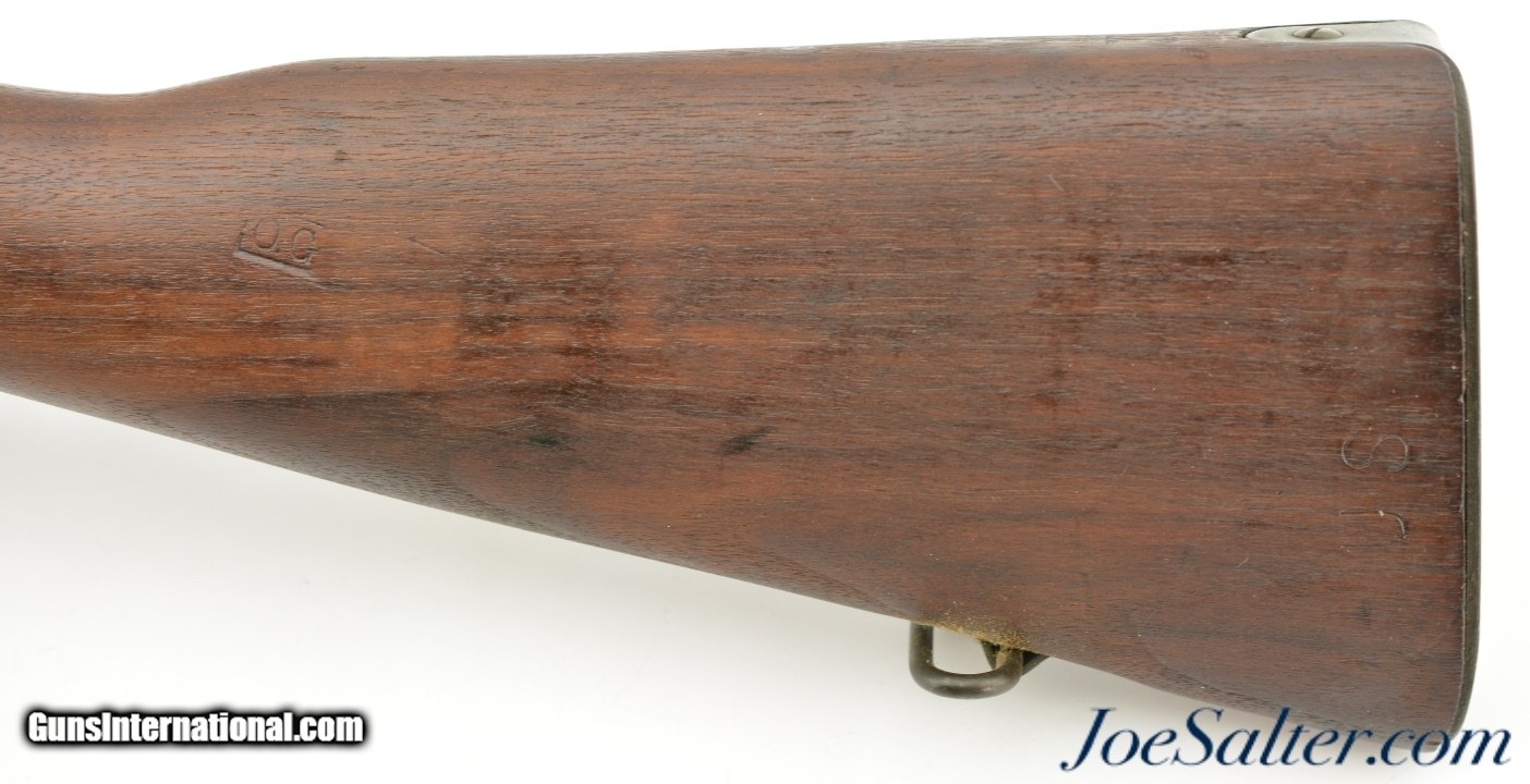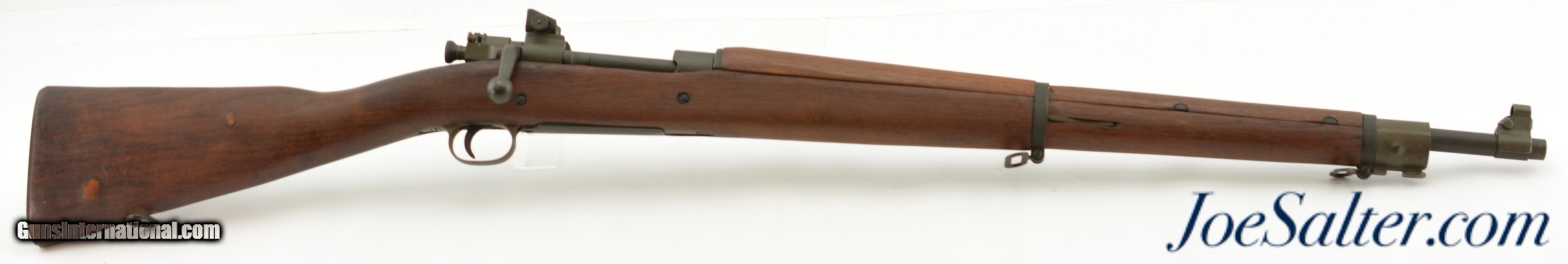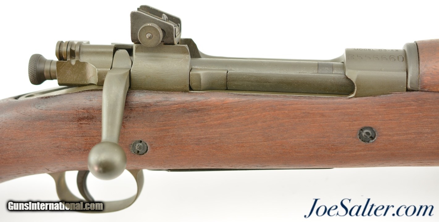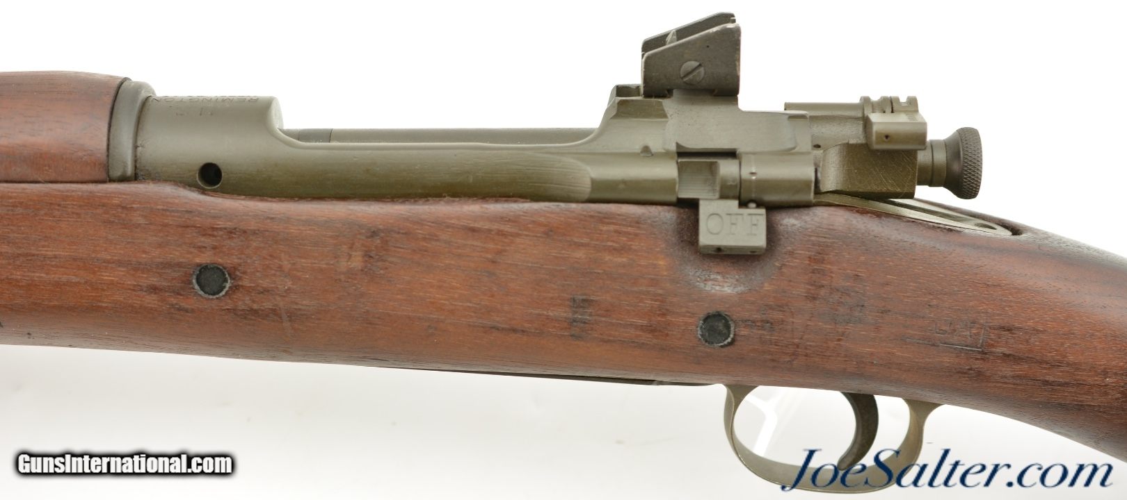 Description: Serial #3556660, .30-06, 24" barrel with an excellent, bright bore. This is an early Remington-made rifle that has a 3-43 dated, "RA" four-groove barrel and retains 95-97% of the arsenal-applied parkerized finish on the metal, with some silvering and fading at the muzzle, as well as along some of the high edges and projections. The bolt has mild fading along the bearing surfaces, and a tiny amount of freckling present on the handle. The walnut stock has been arsenal reconditioned to near excellent condition with a partially visible "FJA" cartouche on the left side of the wrist, and an "OG" Ogden Arsenal stamp on the left side of the buttstock. There are some minor handling marks scattered about the military oil finish. This is a desirable, four-groove Remington ‘03-A3, in fine-near excellent condition, and would make a great addition to any collection. FFL or C&R; SOLD Curio/Relic: Yes |