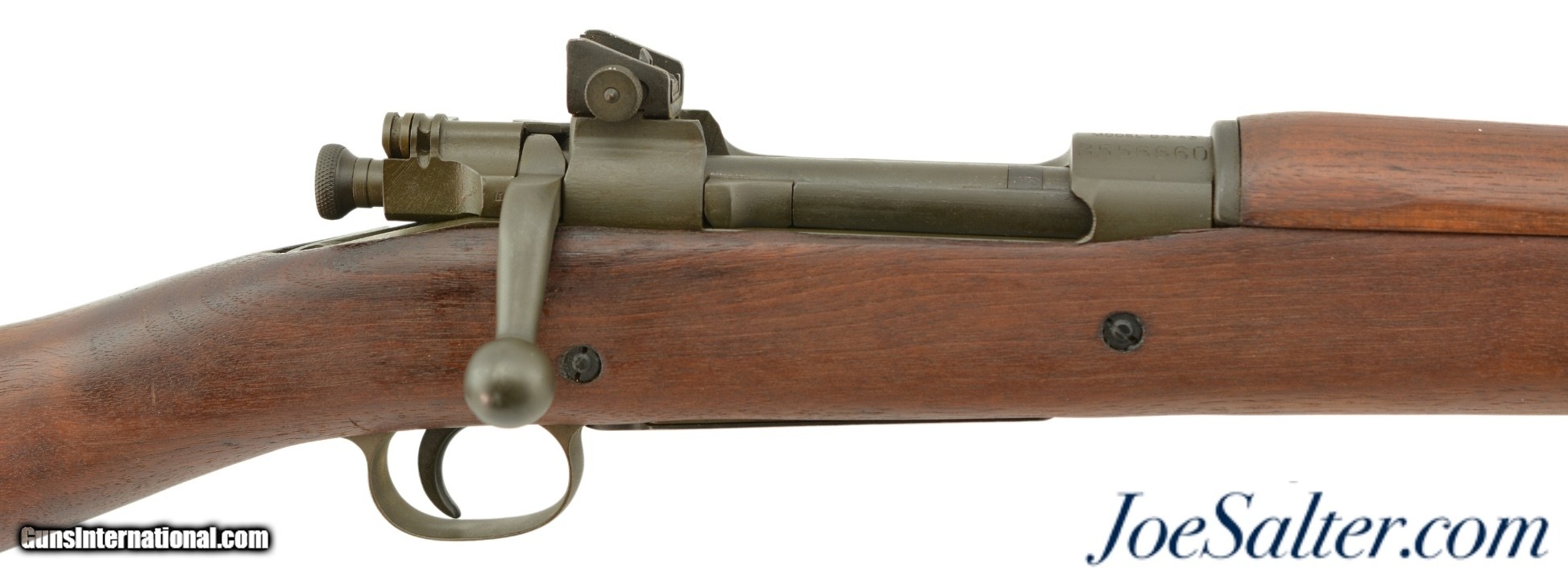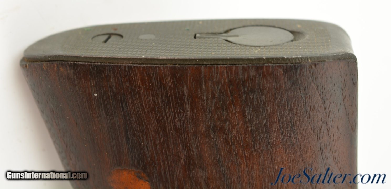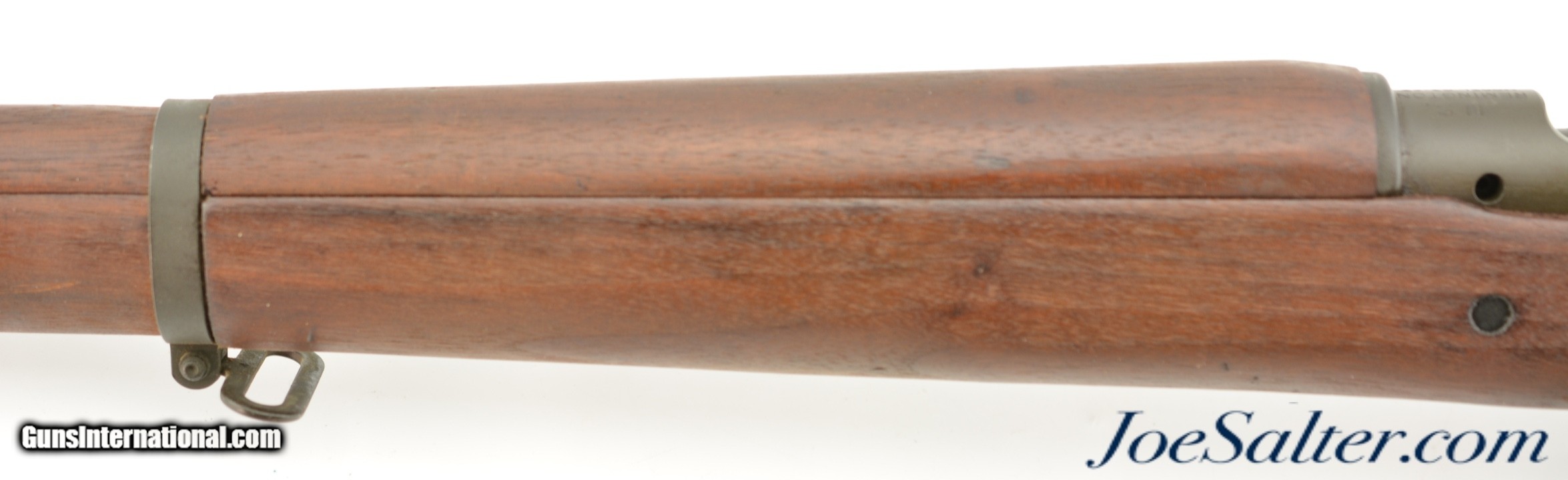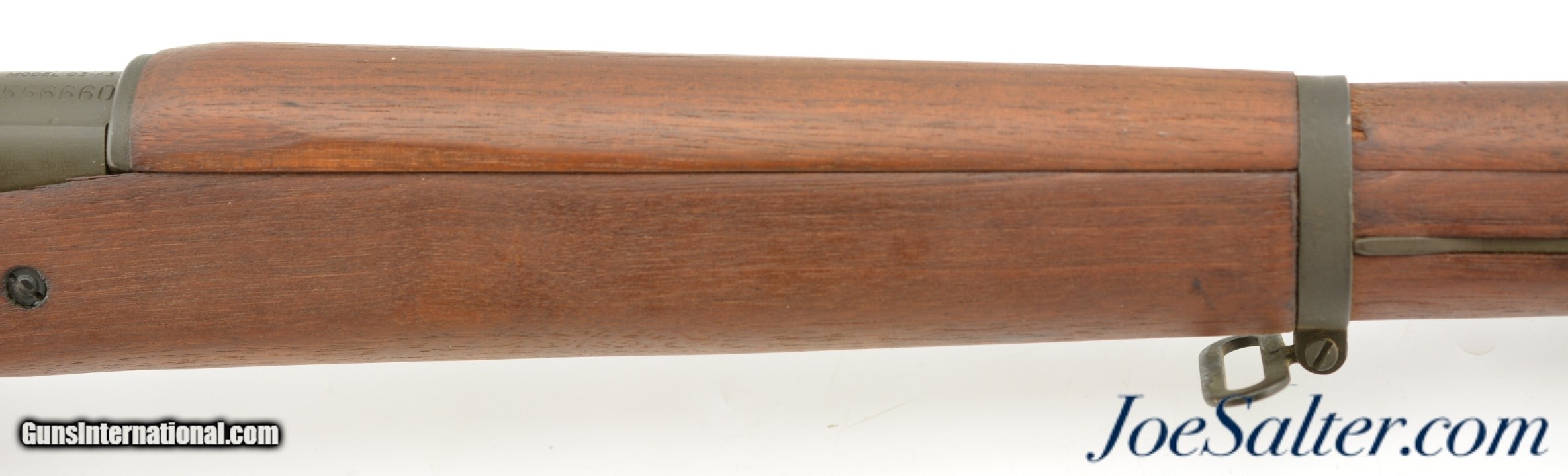 Description: Serial #3556660, .30-06, 24" barrel with an excellent, bright bore. This is an early Remington-made rifle that has a 3-43 dated, "RA" four-groove barrel and retains 95-97% of the arsenal-applied parkerized finish on the metal, with some silvering and fading at the muzzle, as well as along some of the high edges and projections. The bolt has mild fading along the bearing surfaces, and a tiny amount of freckling present on the handle. The walnut stock has been arsenal reconditioned to near excellent condition with a partially visible "FJA" cartouche on the left side of the wrist, and an "OG" Ogden Arsenal stamp on the left side of the buttstock. There are some minor handling marks scattered about the military oil finish. This is a desirable, four-groove Remington ‘03-A3, in fine-near excellent condition, and would make a great addition to any collection. FFL or C&R; SOLD Curio/Relic: Yes |