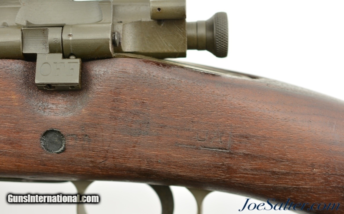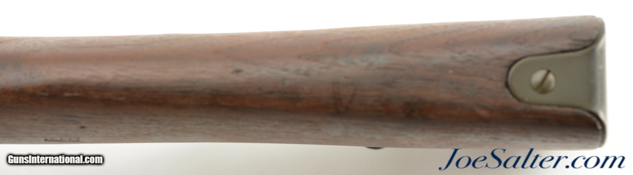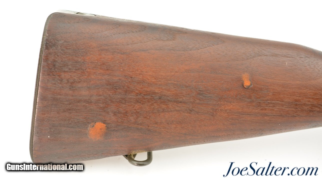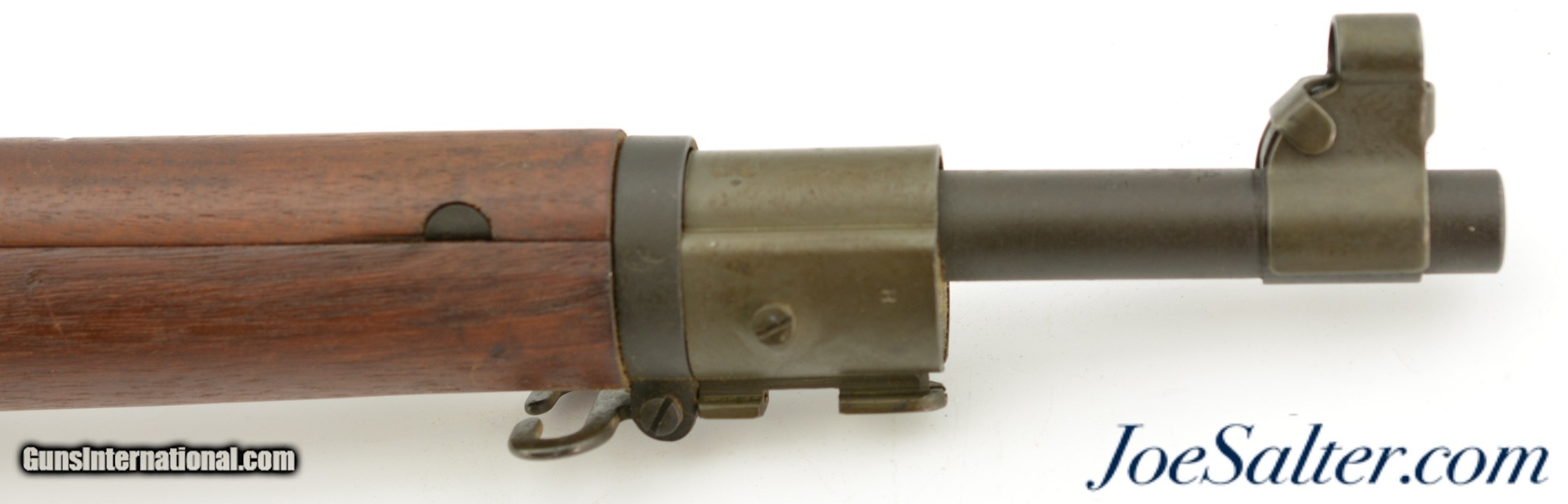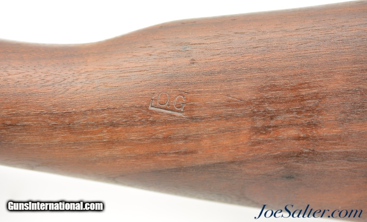 Description: Serial #3556660, .30-06, 24" barrel with an excellent, bright bore. This is an early Remington-made rifle that has a 3-43 dated, "RA" four-groove barrel and retains 95-97% of the arsenal-applied parkerized finish on the metal, with some silvering and fading at the muzzle, as well as along some of the high edges and projections. The bolt has mild fading along the bearing surfaces, and a tiny amount of freckling present on the handle. The walnut stock has been arsenal reconditioned to near excellent condition with a partially visible "FJA" cartouche on the left side of the wrist, and an "OG" Ogden Arsenal stamp on the left side of the buttstock. There are some minor handling marks scattered about the military oil finish. This is a desirable, four-groove Remington ‘03-A3, in fine-near excellent condition, and would make a great addition to any collection. FFL or C&R; SOLD Curio/Relic: Yes |