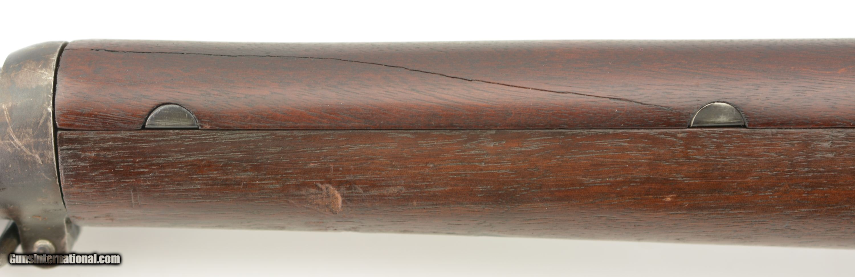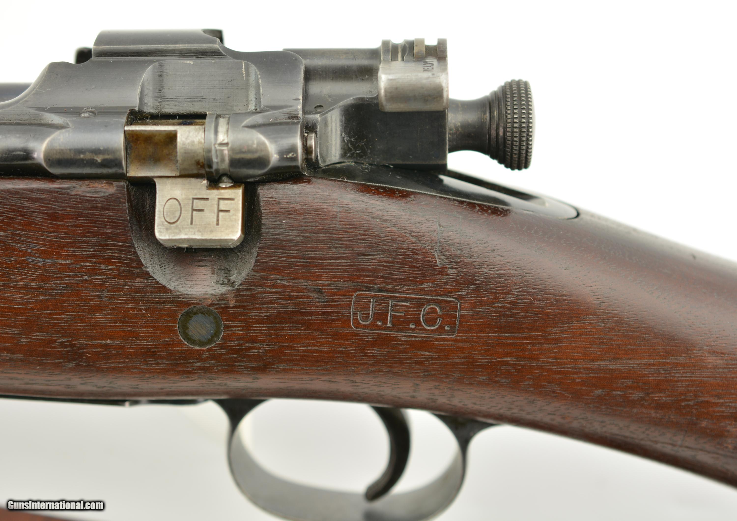 Description: Serial #661250, .30-06, 24" barrel with a very good, bright bore that has minor freckling with the grooves at the muzzle. This is a 1917-manufactured rifle that has a 5-17 dated, "SA" barrel, and retains about 95-97% of the original blue on the receiver and barrel, with some mild silvering at the muzzle, and some further gray fading along the high edges and projections. Spots of mild gray fading are present on the bearing surfaces of the bolt body, and on the straight handle. The walnut stock and handguard have an excellent original oil finish with crisp "J.F.C." cartouche, and a small "R" stamp in the magazine cut-off relief cut. There are some scattered minor handling marks and blemishes throughout but they are very mild and do not detract from the otherwise excellent wood. There is a 4 3/4" crack on the top of the handguard running from the nose to the rear clip on the left side. An original sheet metal front sight hood is installed, and a fine M1907 type leather sling is fitted. This is a fine 1917 spec. '03 that would make a fabulous addition to any collection. FFL or C&R SOLD Curio/Relic: Yes Manufacturer: Spfld Model: 1903 Serial Number: 661250 Caliber Info: .30-06 Gauge Info: .30-06 |