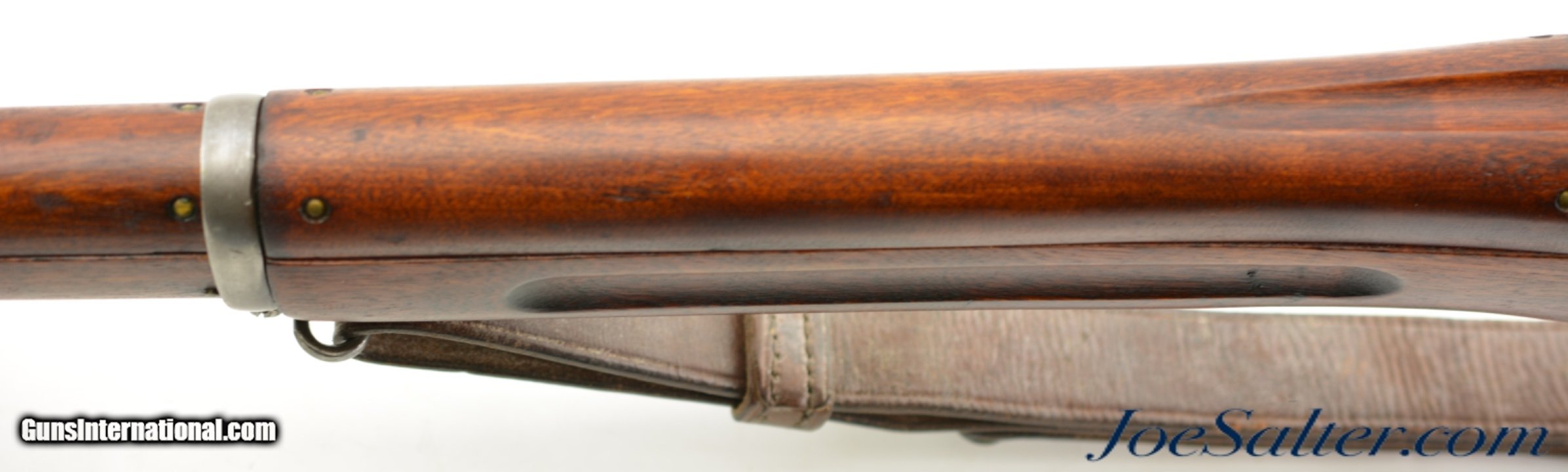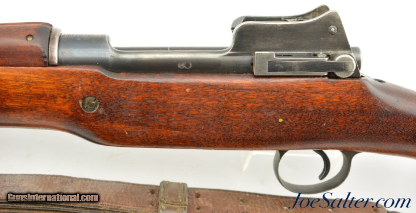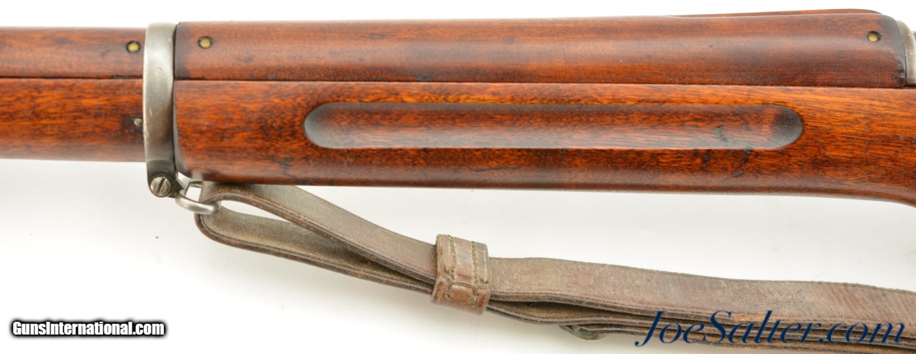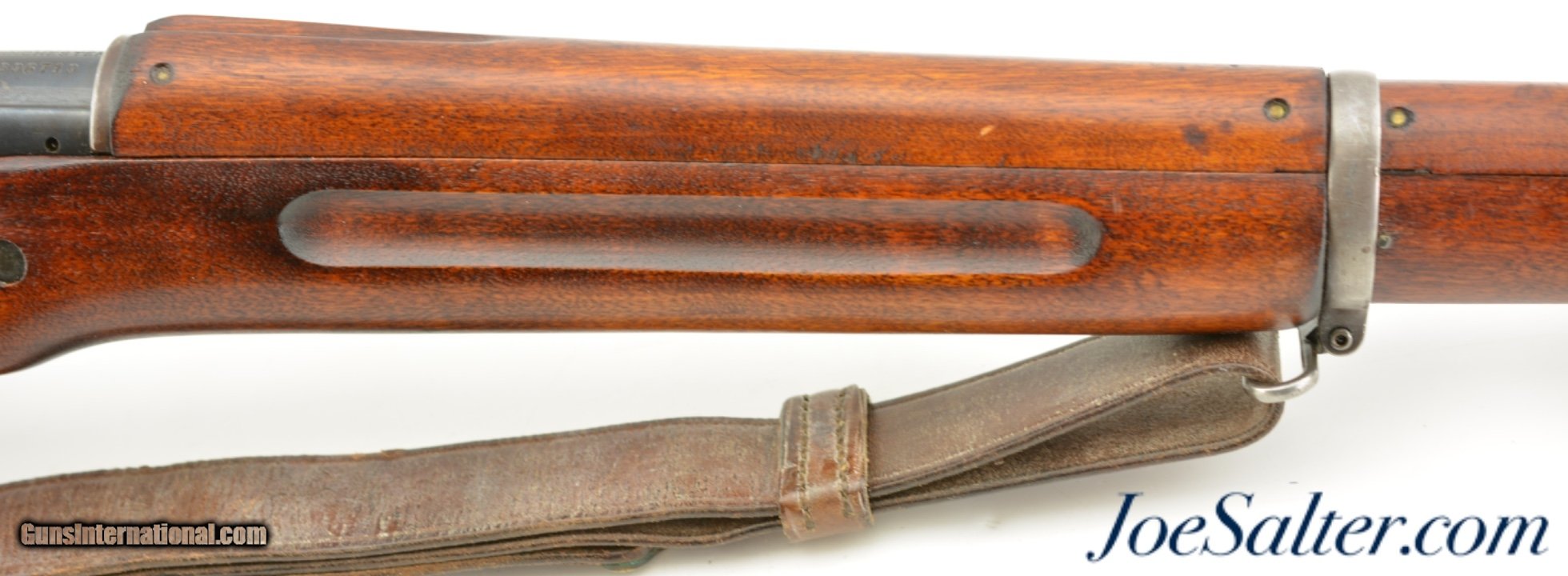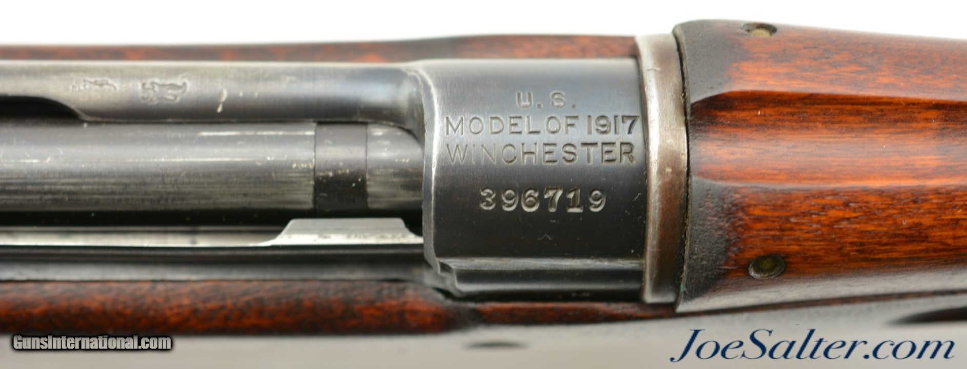 Description: Serial #396719, .30-06, 25" barrel with an excellent, bright bore. This is a handsome rifle that has an 8-18 dated, "W" marked barrel and correct "W" marked parts. The metal retains 85-90% of the original brushed blue finish with gray fading at the muzzle, along the high and exposed edges, as well as on the bearing surface of the bolt. The bolt was numbered at the base of the handle at some point, possibly by British armorers during WW2, but does not match the rifle serial number (469046), and there is a small import stamp on the underside of the barrel just ahead of the forend. The "W" marked walnut stock and handguard are in fine shape with only minor handling marks scattered about the armory refreshed military oil finish. The rifle has a 1918 dated, Model 1917 leather sling installed, and also has a correct metal oiler in the stock compartment. This is a fine example of a desirable Winchester-made Model 1917, that was never parkerized for WW2. FFL or C&R SOLD Curio/Relic: Yes |