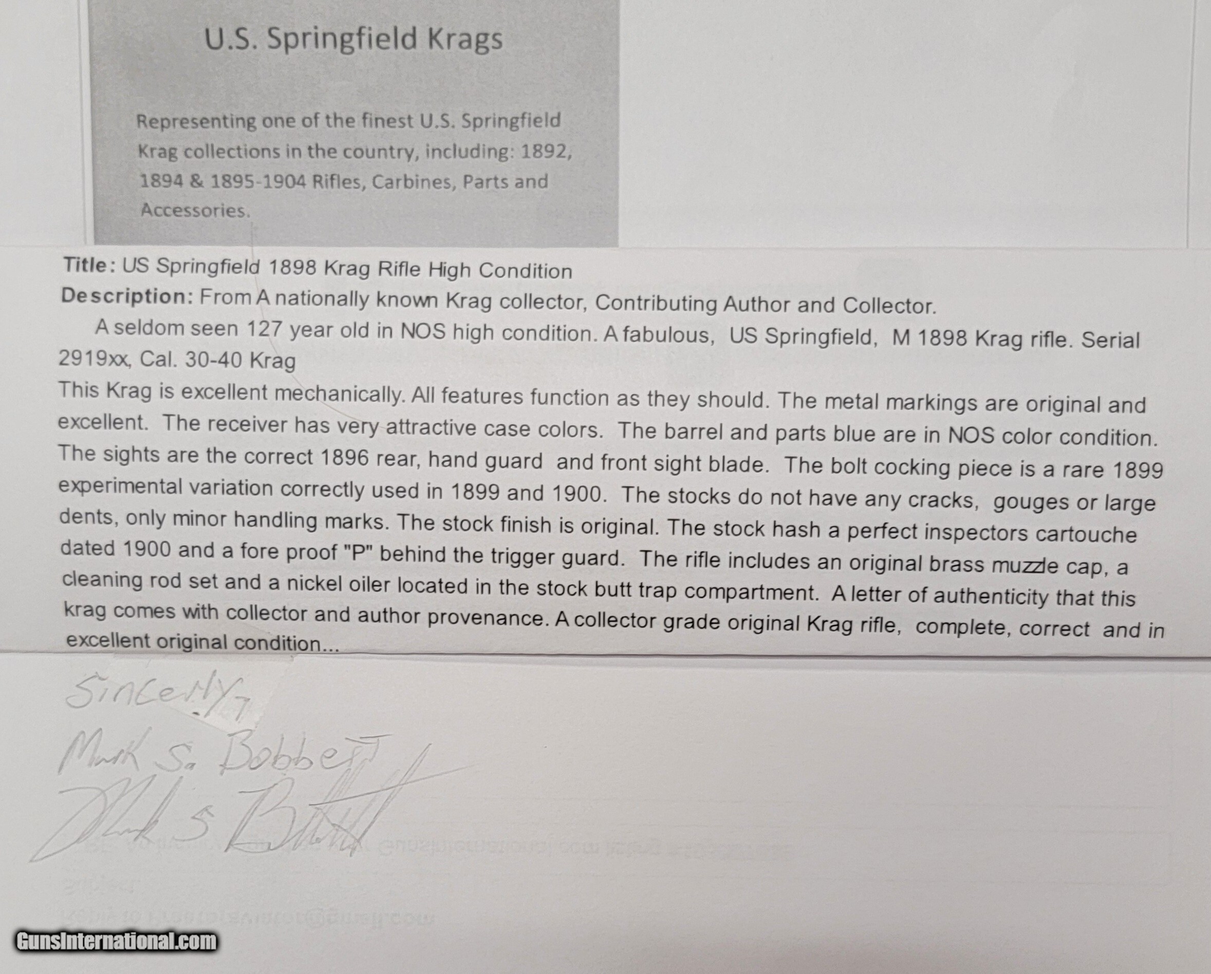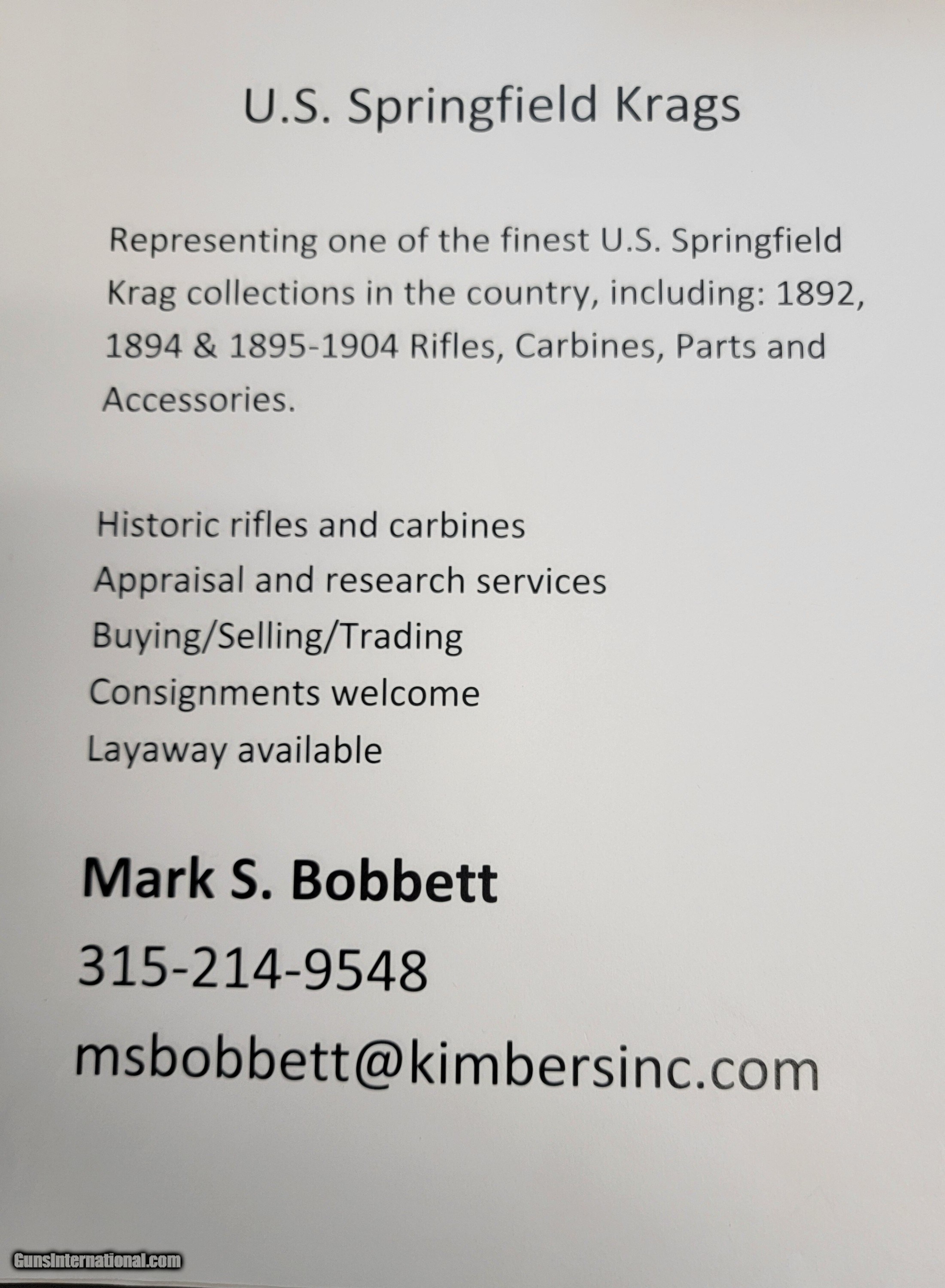 Description: From a nationally known Krag collection. A rare and fabulous, US Springfield model 1892 Krag rifle,30-40 cal, serial # 380. Made in 1894, first year of production.One of the first model 1992's updated by Springfield Armory to a model 1896 rifle. Original, correct and outstanding condition.Mechanically excellent. All features functon as they should. The bore is excellent, no pitting or frosting. Complete with a brass muzzel cap. This rifle also has a 3 piece cleaning rod set and nickle oiler in the butt trap compartment. Krags in this serial number range were most likely issued to the famous 20th Kansas that famously fought in the Phillipines and other theaters of the spanish American war. A famous, historic Krag in fabulous condition for an advanced collecton. Investment grade. Layaway available This is an antique that will ship to yor door in most states. Or C+R or FFL accepted / required. Add 3% for CC payment / partial CC payment Questions: Mark 315 214 4926 Antique: Yes Rifle Caliber: .30-40 Krag Manufacturer: US Springfield Model: 1896 Serial Number: 380 Barrel Length: 30 Condition: Excellent Metal Condition: Excellent Wood Condition: Excellent Bore Condition: Excellent Price: $6,850.00 Buy Now Contact Seller |