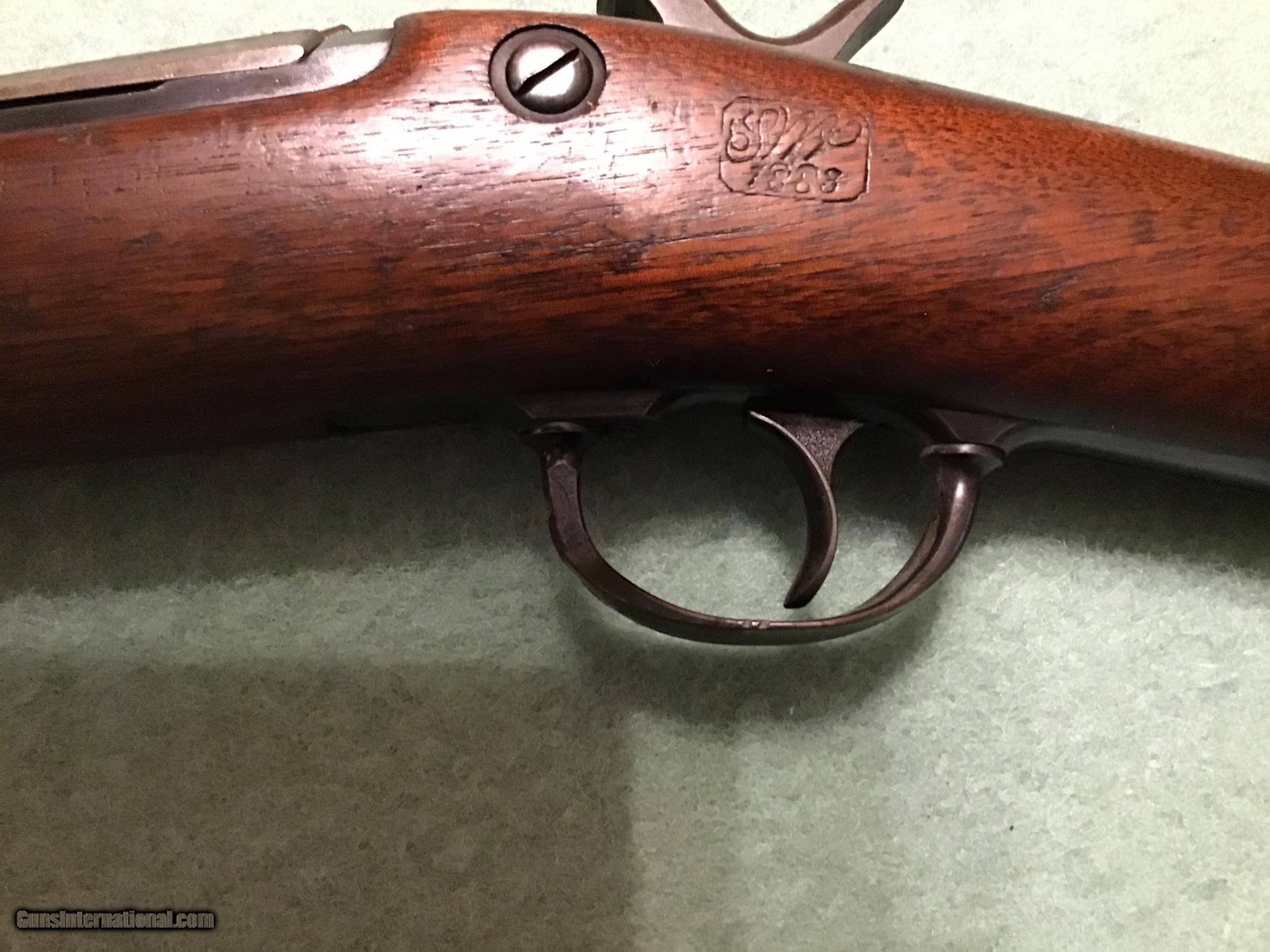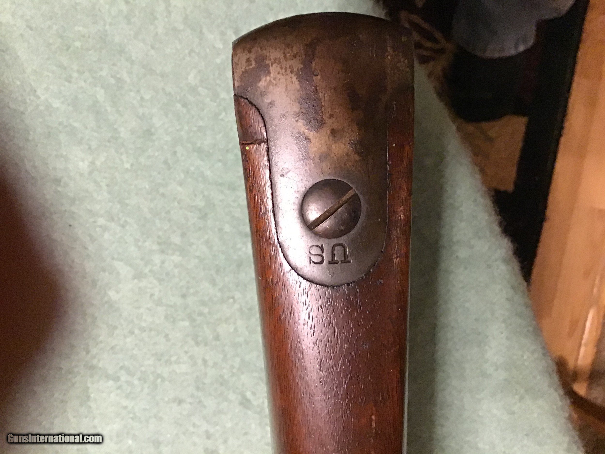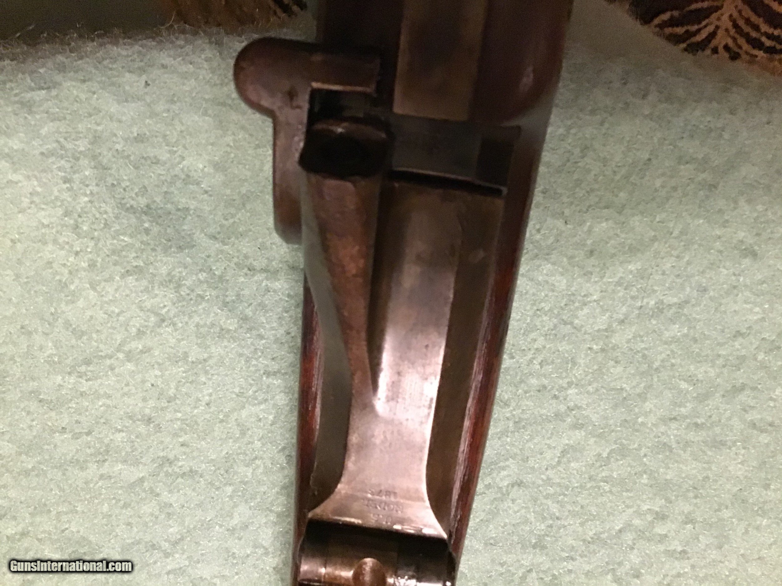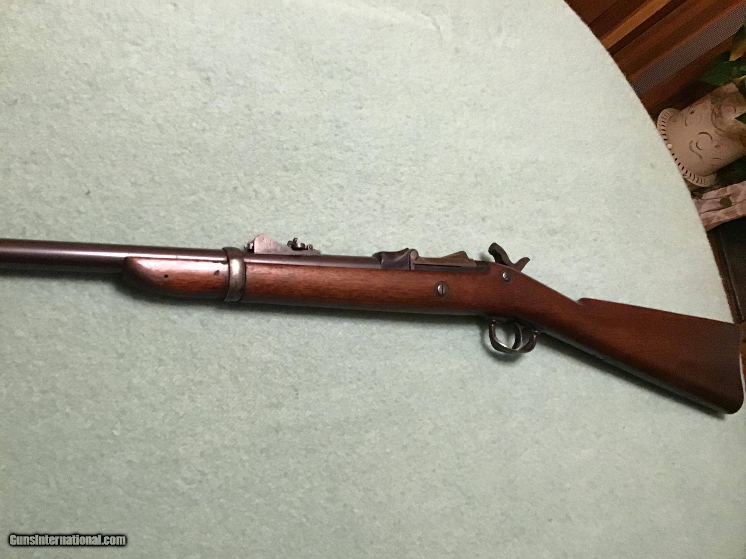 Description: On Hold Sale Pending US Springfield Model 1873 45-70 trapdoor army rifle that has been converted to carbine configuration. The carbine length walnut stock is in very good condition with nice walnut color. The 1883 dated inspection cartouche and circle P fireing cartouche are present and strong. The 19 inch barrel as well as the US marked but plate, trigger guard and barrel band have most of their original blue finish. Correct model rear sight held by slotless screws and added front sight are present. The US model 1873 breach block and tang still hold strong case colors are tight and function well. The US Springfield marked lock and hammer hold most of the original blue and function well. This trapdoor functions fine and is in very good plus overall condition. Shipping will be actual cost by priority mail approximately $50.00. Please feel free to call me with any questions 218-839-9272 or chriskobberdahl2gmail Sale Pending on Hold SOLD Antique: Yes Manufacturer: US Springfield Model: 1873 Serial Number: 221,855 Barrel Length: 19” Condition: Very Good Metal Condition: Very Good Wood Condition: Very Good Bore Condition: Good clean |
