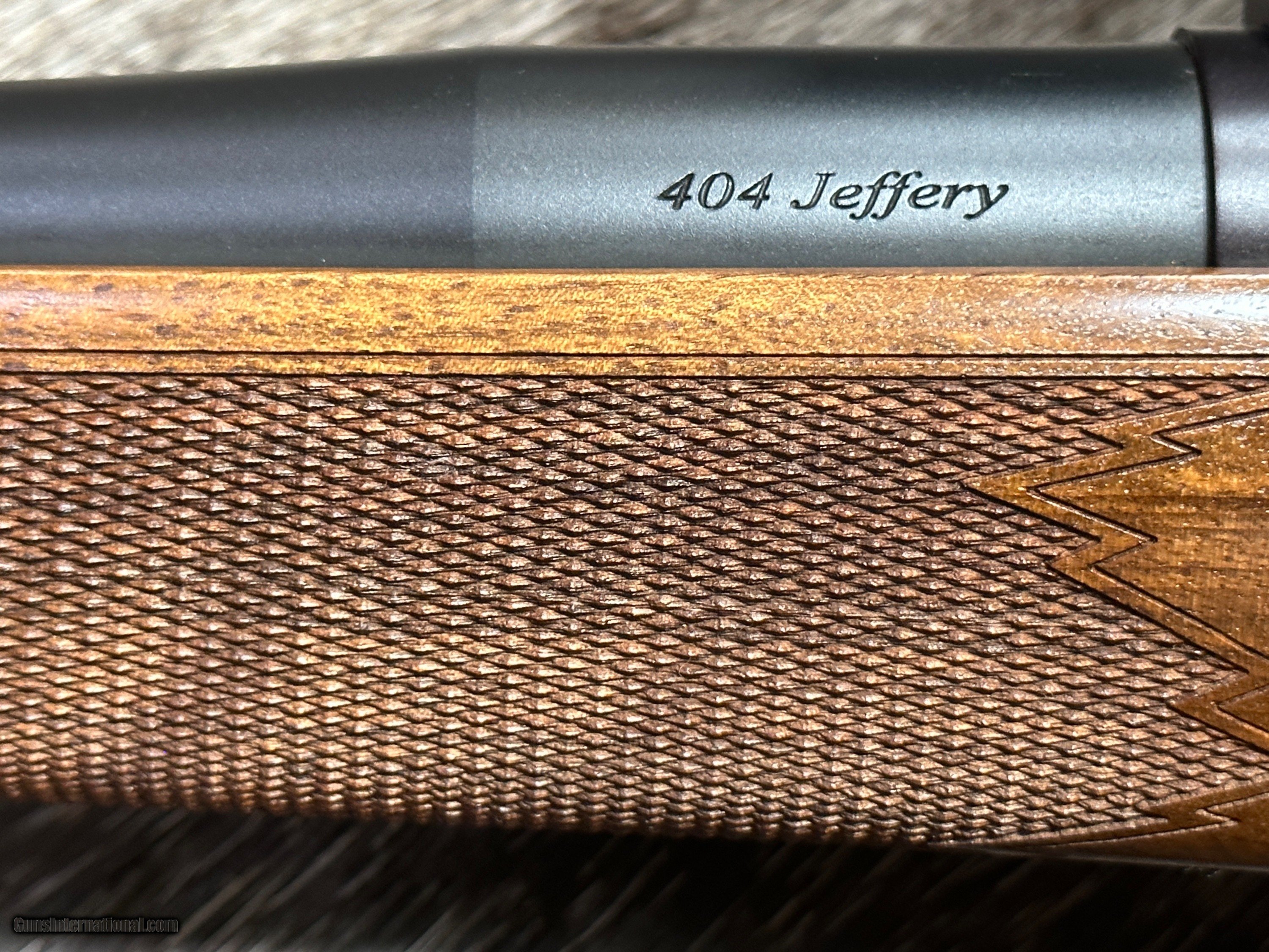 Description: MONTANA RIFLE COMPANY MODEL 1999 AFRICAN (ALR) 404 JEFFERY DANGEROUS GAME RIFLE WITH TRIJICON 1-6 SCOPE - LAYAWAY AVAILABLE FREE AFRICAN SAFARI WITH KUCHE SAFARIS (: KUCHE.CO.ZA) INCLUDED WITH THIS RIFLE! SAFARI IS FOR 1-HUNTER / 5-DAYS / 3-ANIMALS (IMPALA, BLESBUCK, WARTHOG). SAFARI IS CUSTOMIZABLE WITH AS MANY ADDITIONAL DAYS AND ANIMALS AS YOU WANT. THE CERTIFICATE IS GOOD FOR 3-YEARS FROM DATE OF PURCHASE AND WILL BE EMAILED TO YOU. NOTE: THE SAFARI IS FREE AND DOES NOT ADD ANY COST TO THE FIREARM. I know the complete history of this beautiful, one-owner rifle as I sold it to him new. The rifle has less than 20 rounds down the barrel and has been on one Cape Buffalo hunt in Africa. FEATURES OF THIS GREAT DANGEROUS GAME RIFLE INCLUDE: