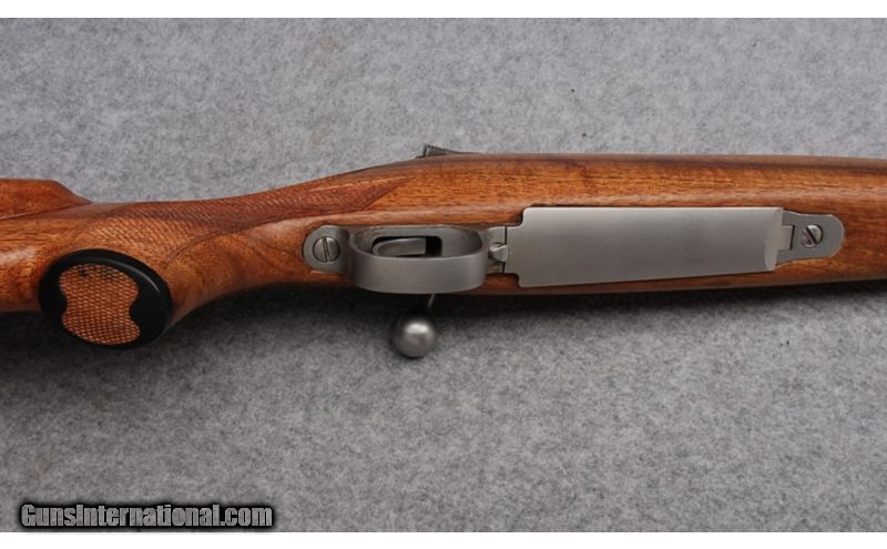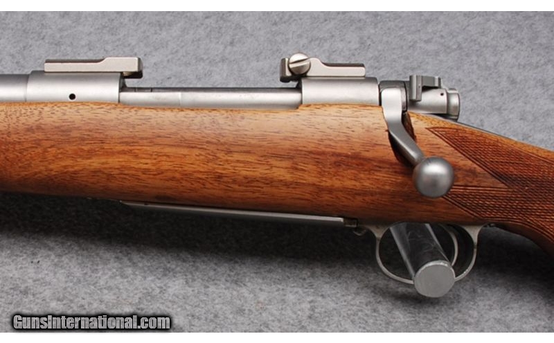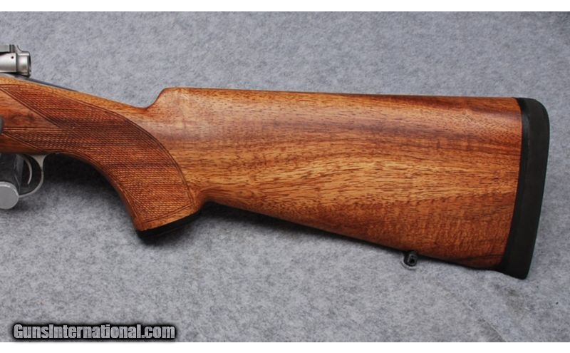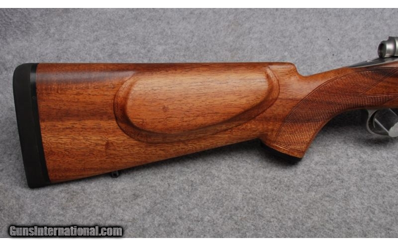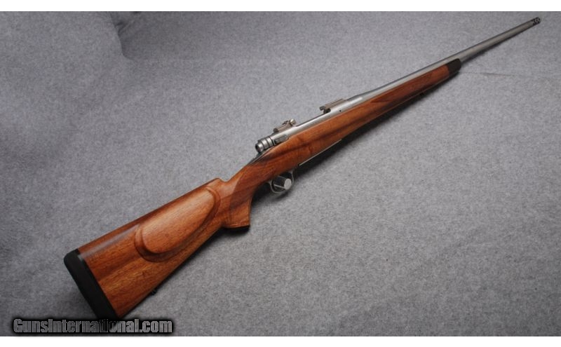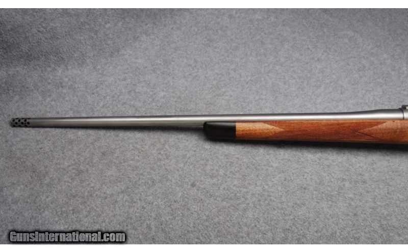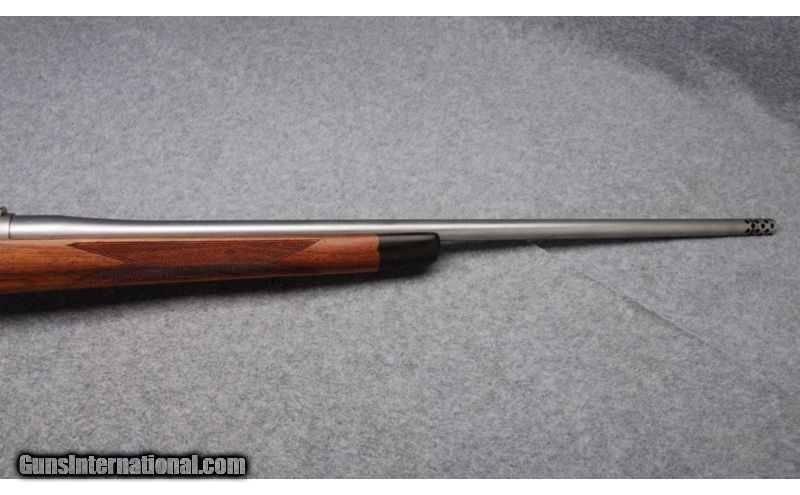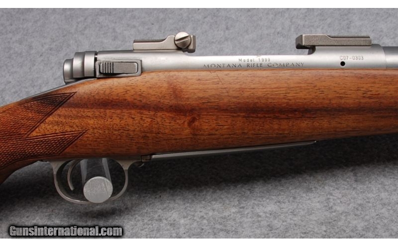 Description: This is a Stainless Steel Montana Rifle Company 1899 Left Handed rifle in .340 Weatherby Magnum. The action is in Excellent condition with a set of twist style 2 piece scope bases. Bottom metal is Very Good to Excellent. The 26 inch barrel has a built in muzzle brake and is in Very Good to Excellent condition with a few handling marks on the front half. The checkered walnut stock is Excellent and has a skeletonized pistol grip cap and a contrasting end cap along with a Decelerator butt pad. SOLD Caliber Info: .340 Weatherby Magnum Metal Condition: Very Good to Excellent Wood Condition: Excellent Bore Condition: Bright and Shiny Barrels: 26" with Muzzle Brake Stock: Checkered Walnut with Contrasting Fore End Cap and Skeletonized Pistol Grip Cap Stock Dimensions: LOP: 14 Butt Pad: Decelerator pad Sights: 2 Piece Twist Style Scope Bases Item Location: Noblesville, IN |